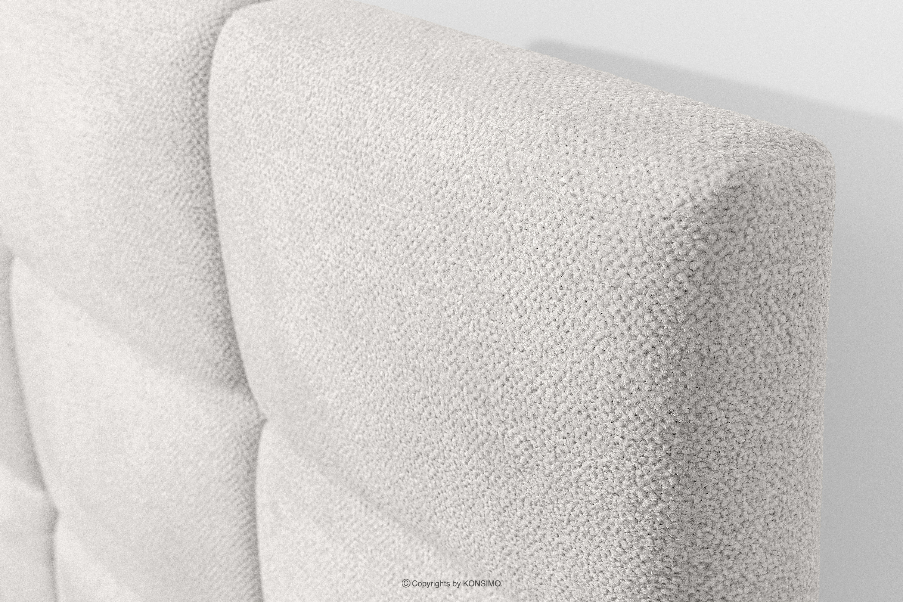 Das 120 cm lange Bett aus weißem Boucle-Stoff verbindet minimalistisches Design mit höchstem Komfort. Seine einzigartige Form lässt es nicht nur bemerkenswert aussehen, sondern bietet auch Komfort auf höchstem Niveau. Das Bett ist mit einem stabilen Rahmen aus flexiblen Holzlatten ausgestattet, die die Matratze optimal stützen und sich den natürlichen Bewegungen des Körpers anpassen.