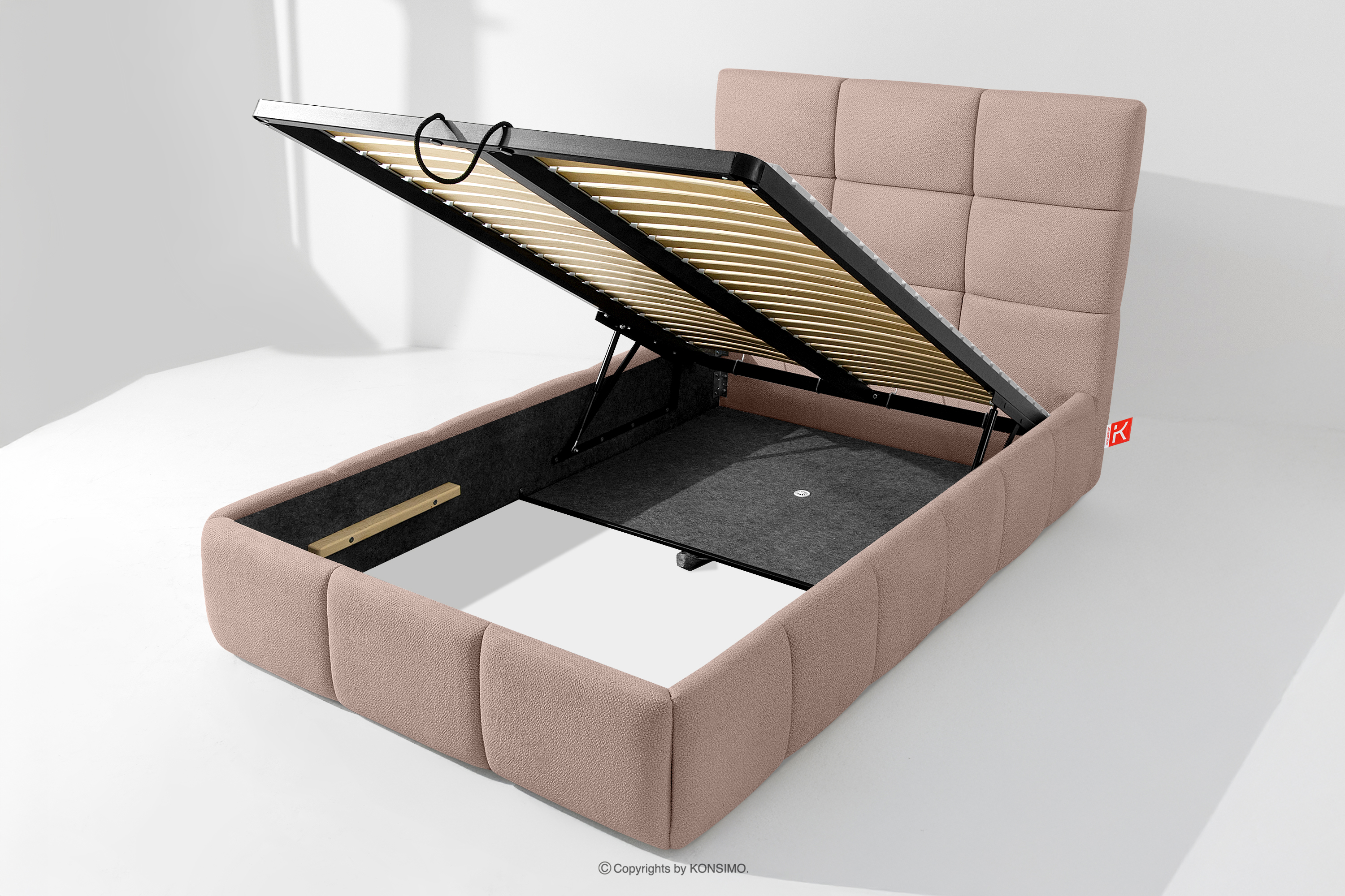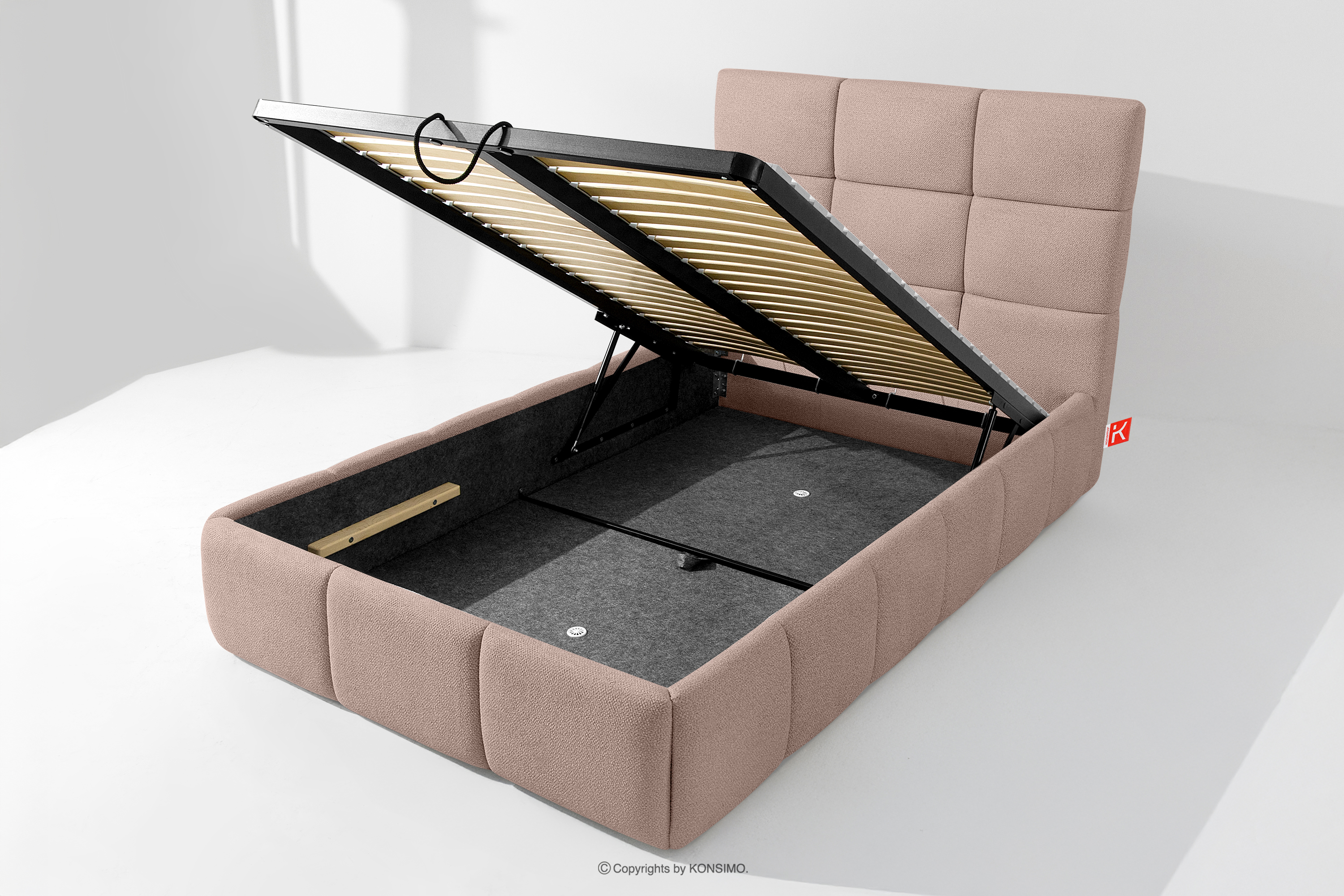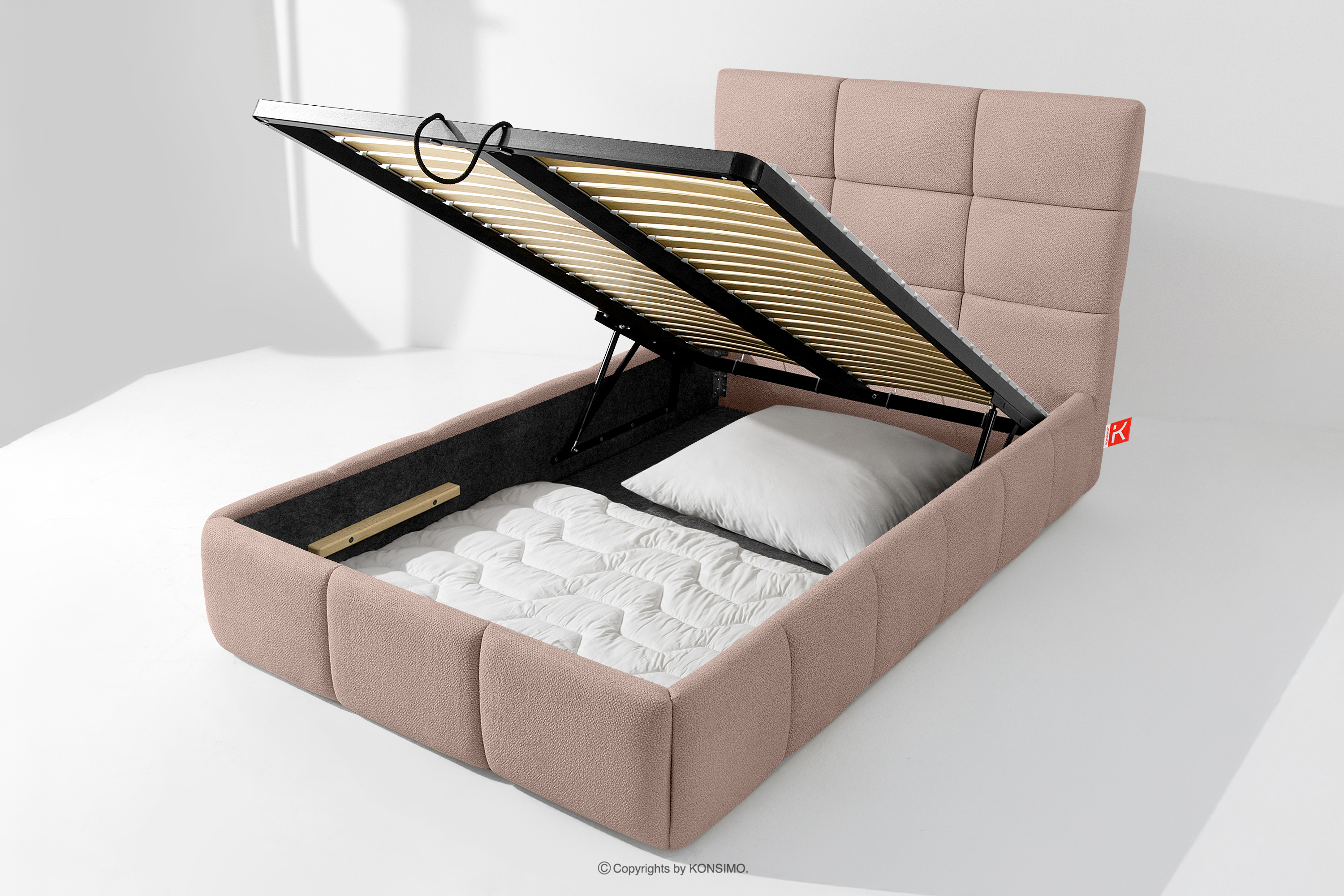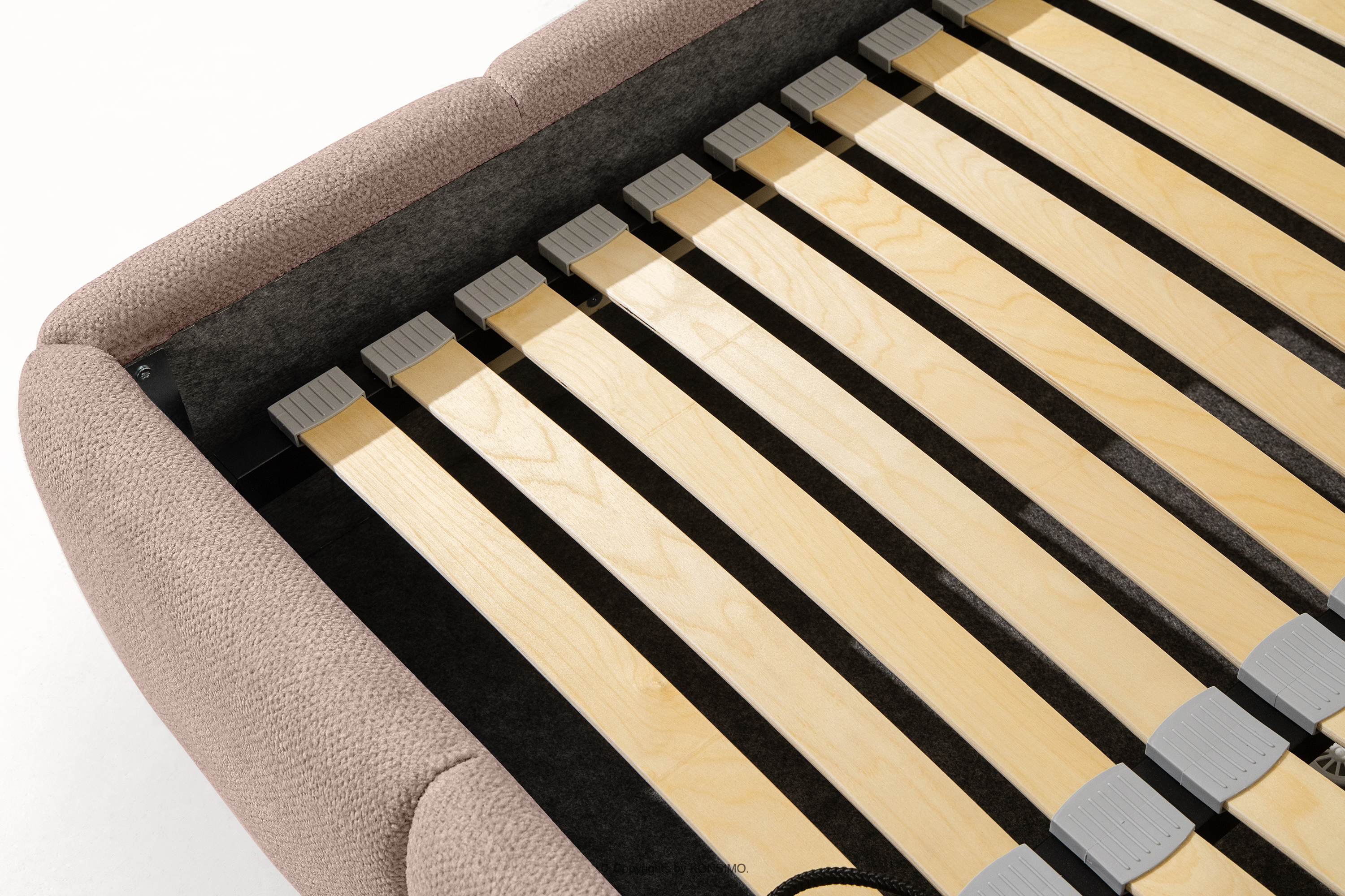 Das 120 cm lange Bett aus rosa Boucle-Stoff verbindet minimalistisches Design mit maximalem Komfort. Seine einzigartige Form lässt es nicht nur bemerkenswert aussehen, sondern bietet auch Komfort auf höchstem Niveau. Das Bett ist mit einem stabilen Rahmen aus flexiblen Holzlatten ausgestattet, die die Matratze optimal stützen und sich den natürlichen Bewegungen des Körpers anpassen.