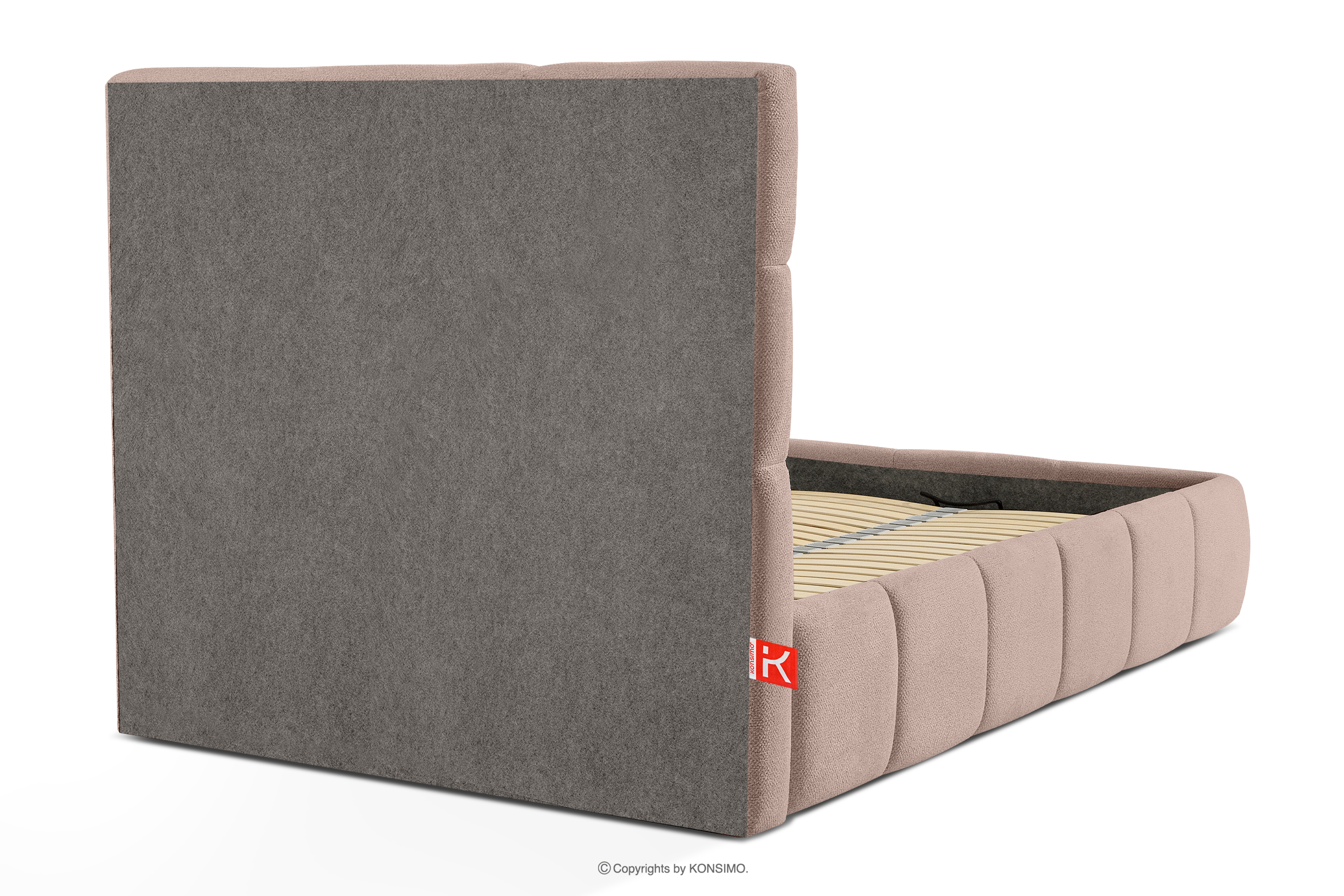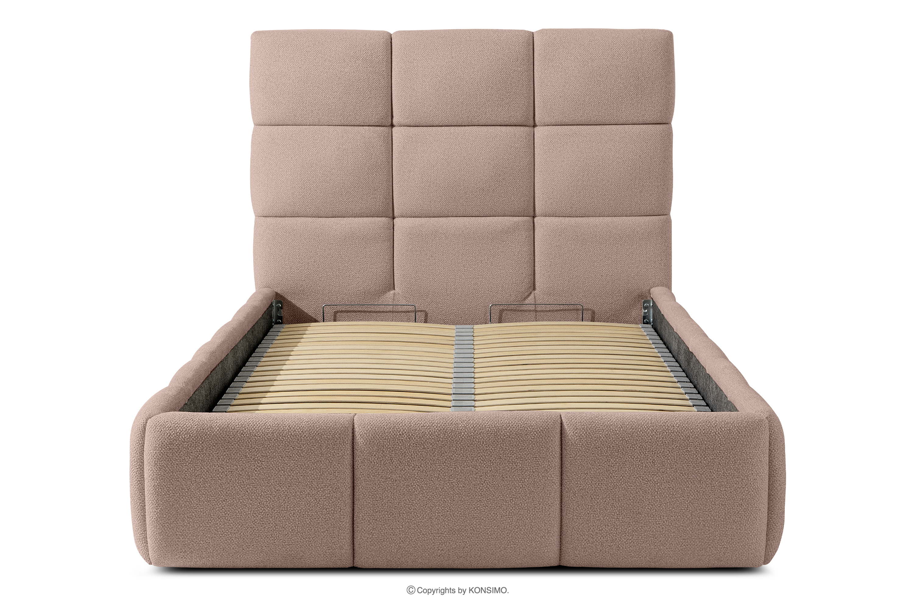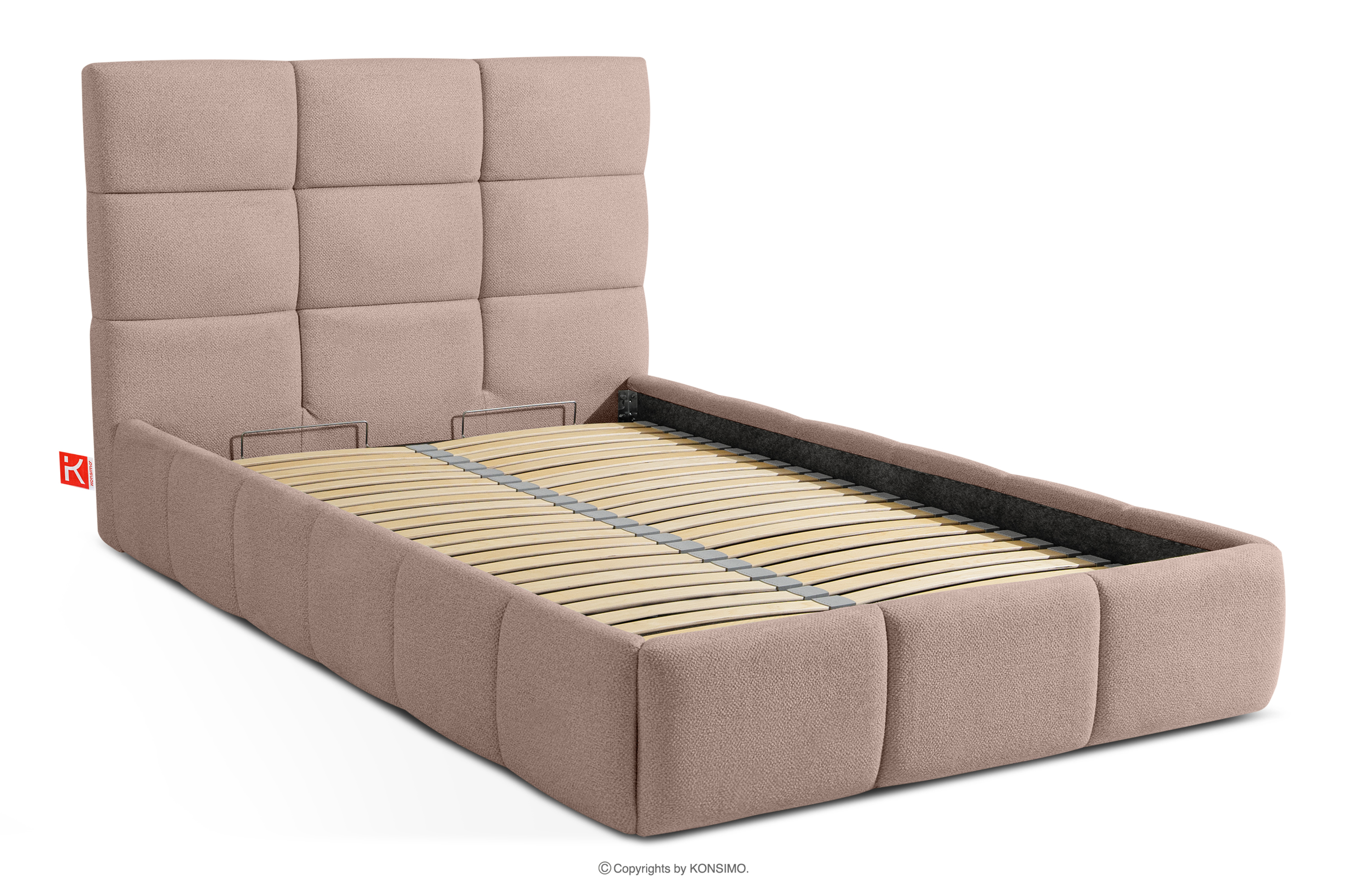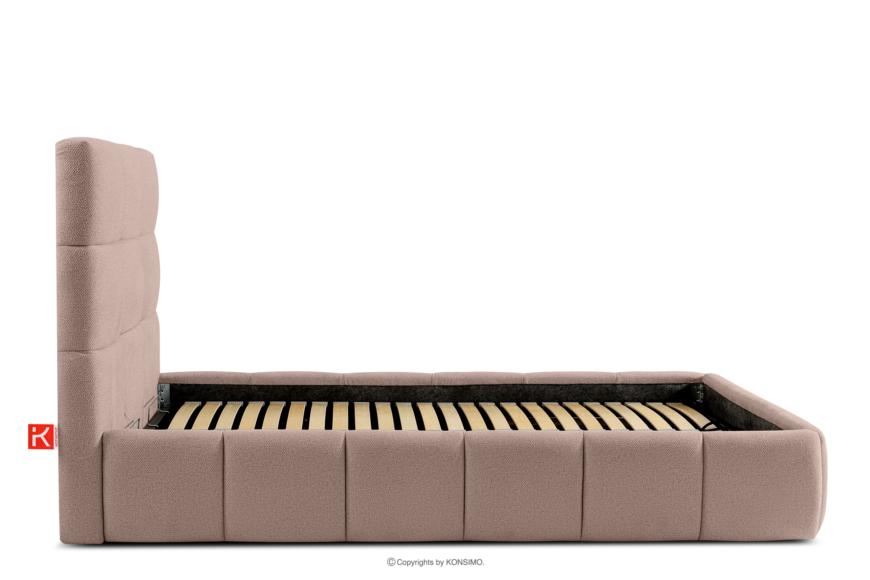 Das 120 cm lange Bett aus rosa Boucle-Stoff verbindet minimalistisches Design mit maximalem Komfort. Seine einzigartige Form lässt es nicht nur bemerkenswert aussehen, sondern bietet auch Komfort auf höchstem Niveau. Das Bett ist mit einem stabilen Rahmen aus flexiblen Holzlatten ausgestattet, die die Matratze optimal stützen und sich den natürlichen Bewegungen des Körpers anpassen.