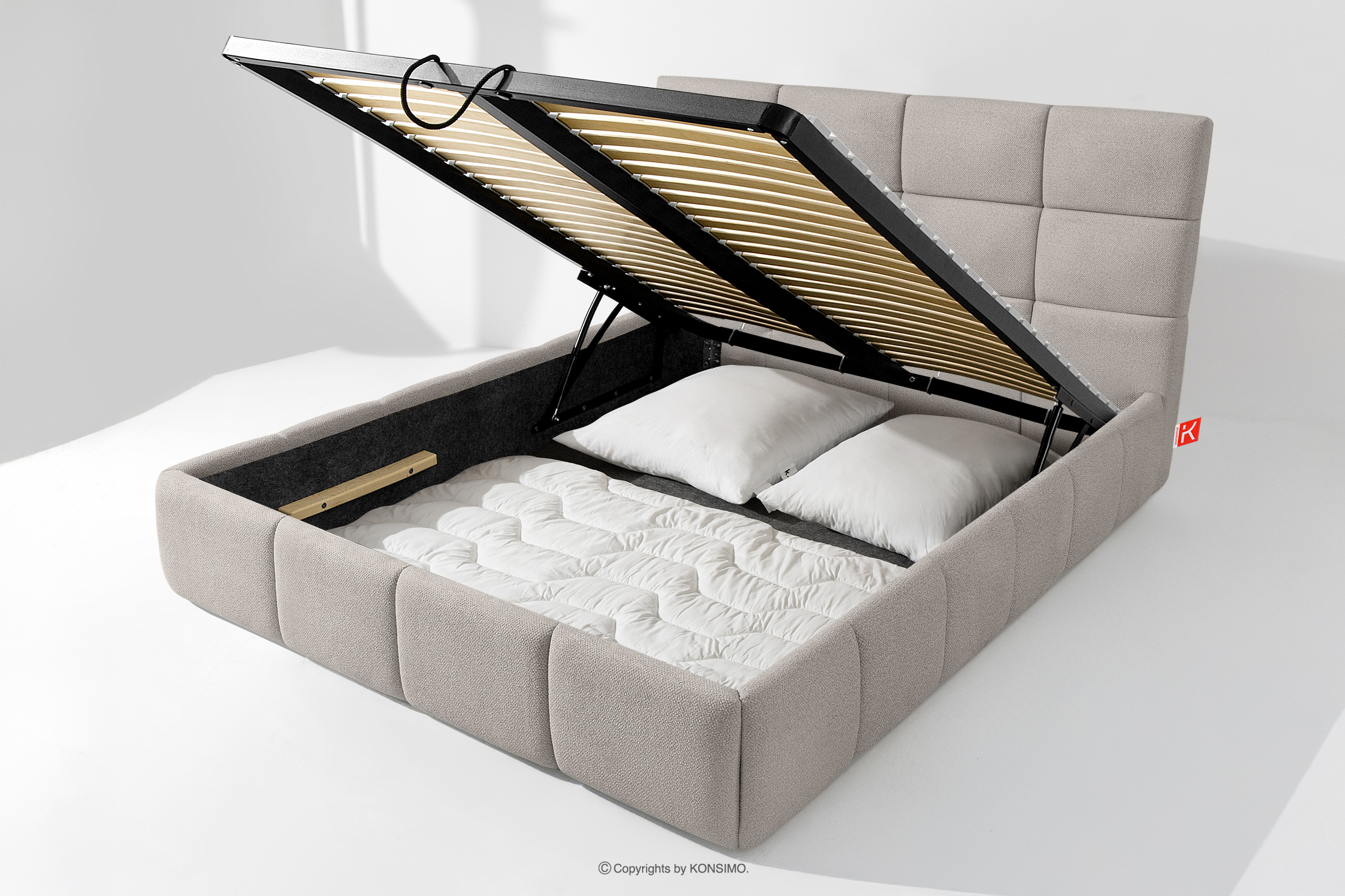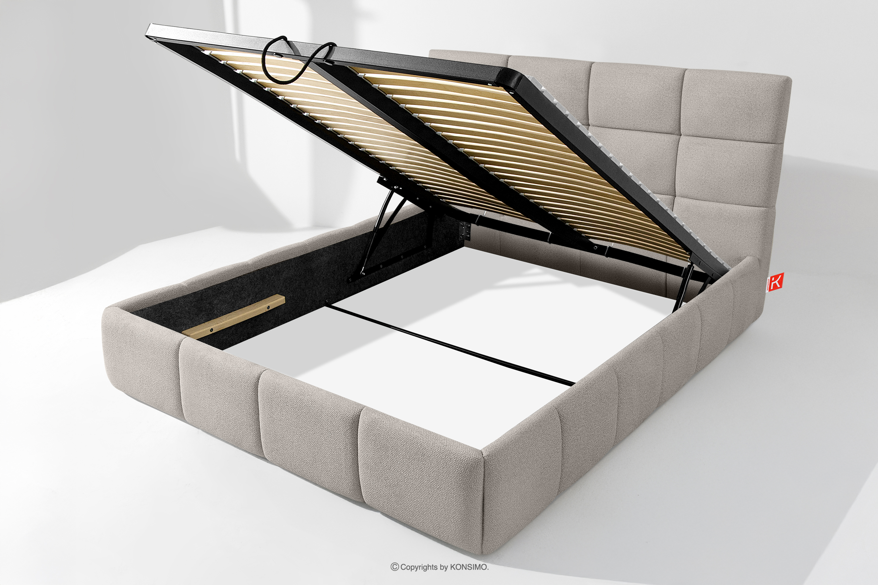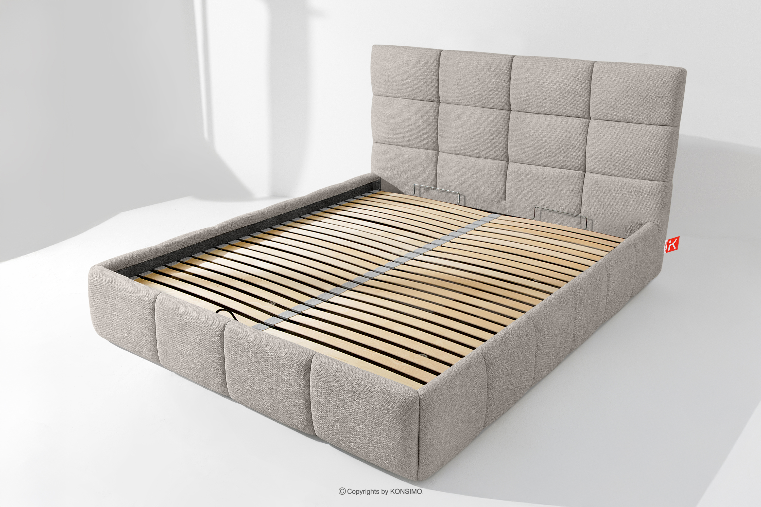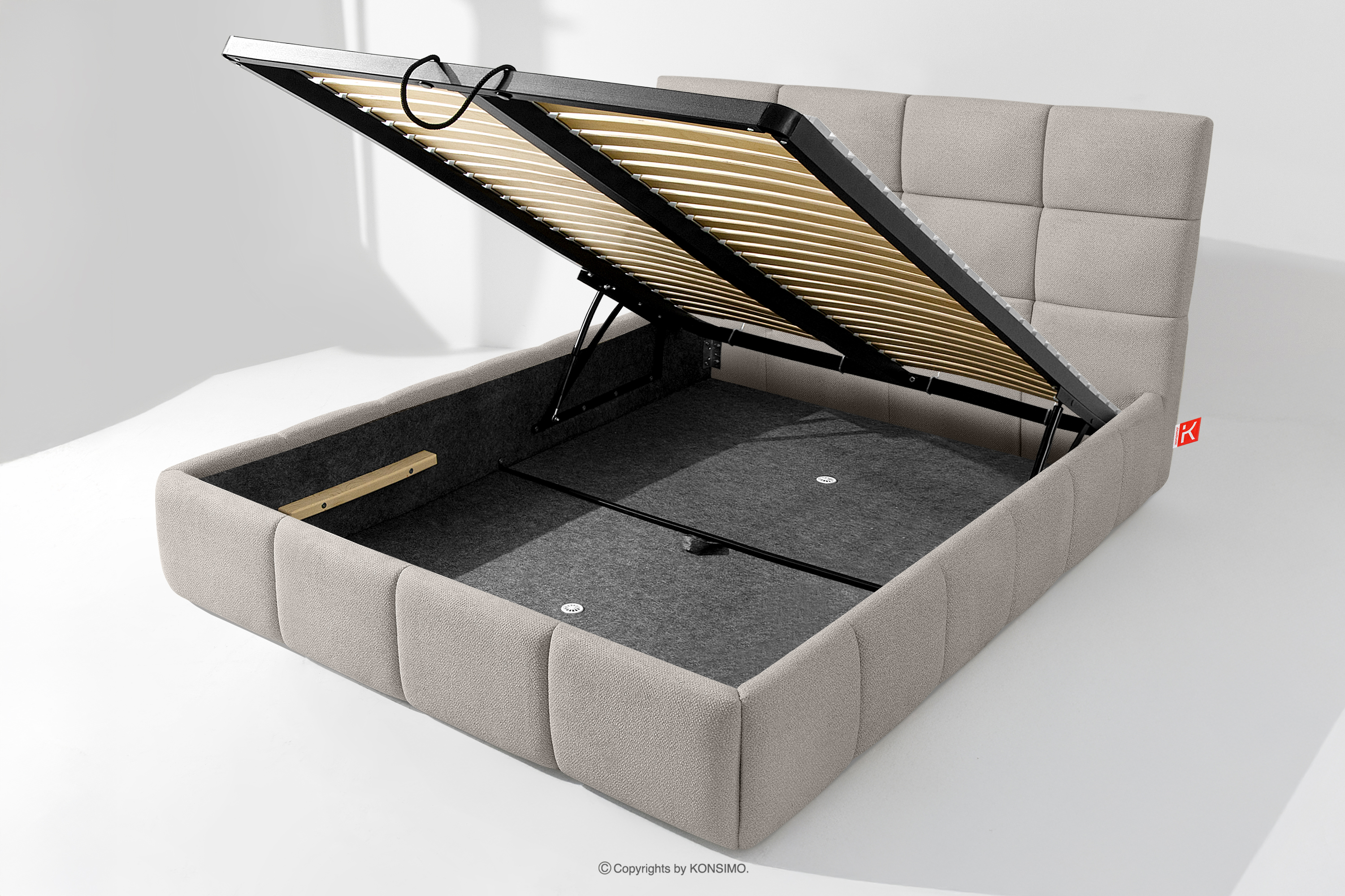 Der für den Bezug des Bettes verwendete Stoff ist von höchster Qualität - er sieht nicht nur schön aus und verleiht dem Interieur Eleganz, sondern ist auch äußerst funktionell. Er ist widerstandsfähig gegen Abrieb und alltägliche Beanspruchung. Der Stoff passt perfekt in moderne und skandinavische Interieurs, in denen Schlichtheit und Funktionalität Hand in Hand gehen. Der Boden des Bettkastens ist herausnehmbar, so dass die Reinigung unter den Möbeln leicht möglich ist. Außerdem sind die Wände und die Bodenplatte des Kastens mit Filz versehen, der das Verrutschen von Bettzeug und anderen gelagerten Gegenständen verhindert und für Ordnung und Ästhetik sorgt.