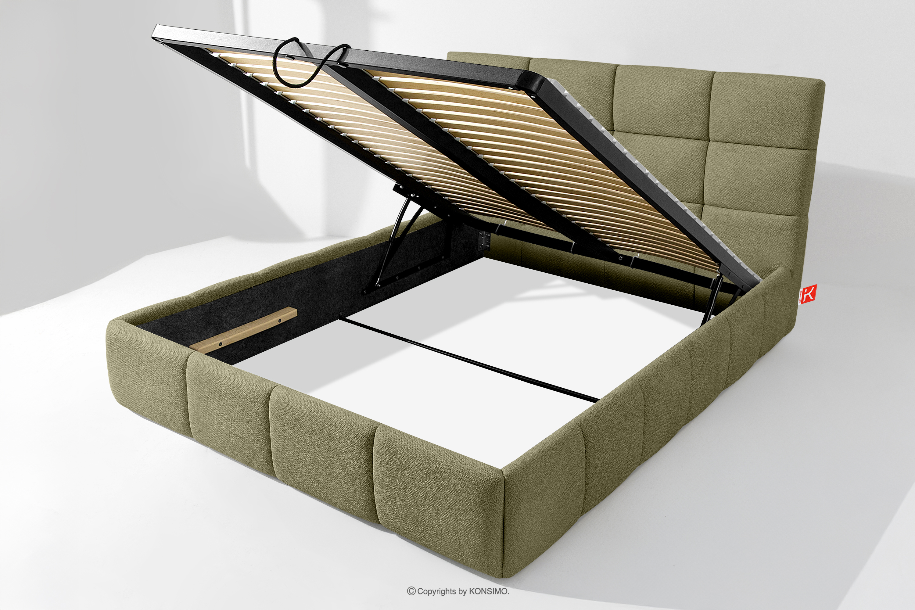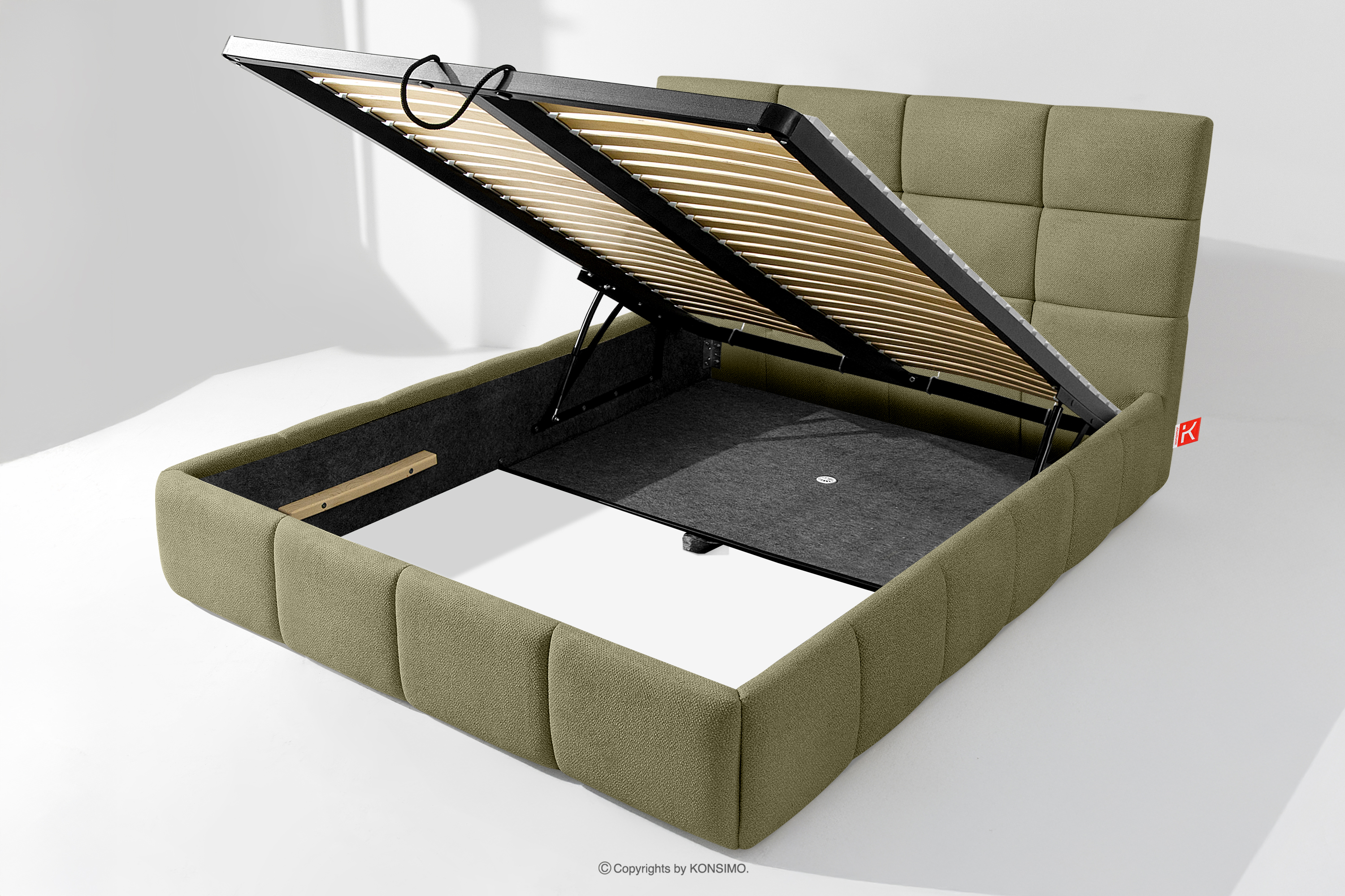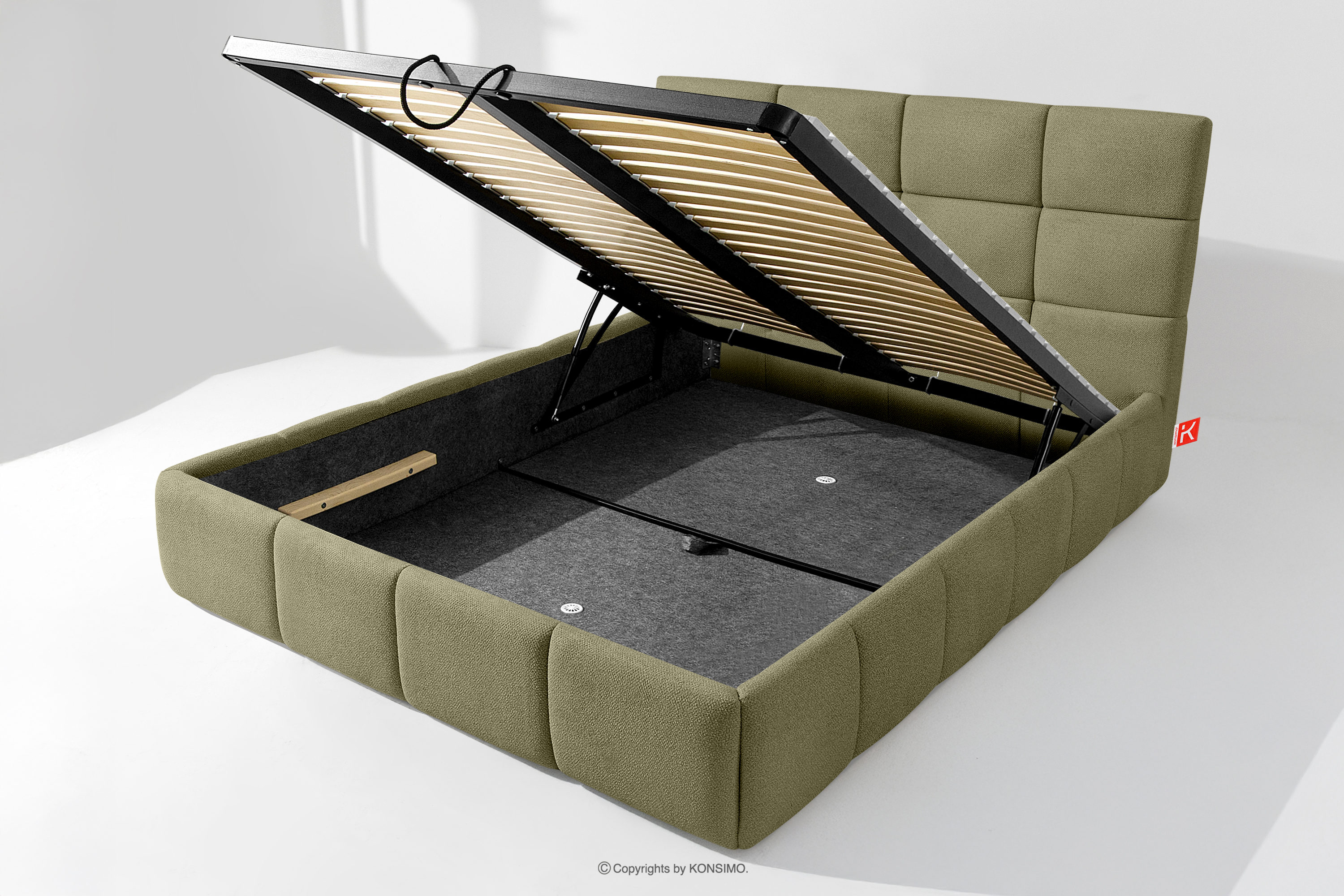 Darüber hinaus hat der Benutzer die Möglichkeit, den Härtegrad des Bettes individuell einzustellen - dank der herausnehmbaren Latten kann eine weichere oder festere Unterlage gewählt werden. Ein weiterer Komfort ist der bequeme Bettzeugbehälter, der sich dank moderner Gasflaschen mühelos und vollautomatisch öffnet. Diese praktische Lösung ermöglicht einen schnellen Zugriff auf das gelagerte Bettzeug, ohne die schwere Matratze manuell anheben zu müssen.