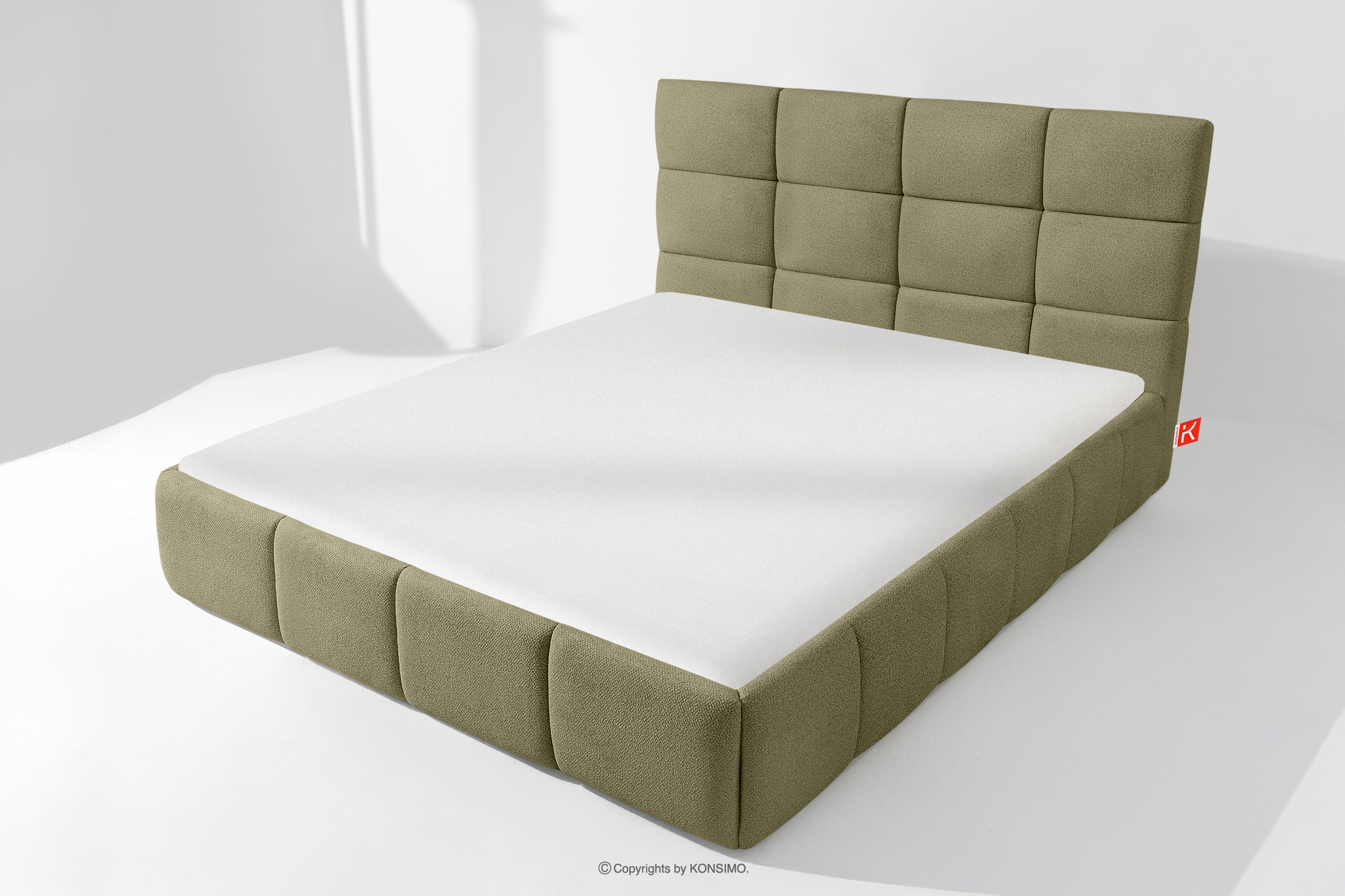 Das 140 cm lange Bett aus grünem Boucle-Stoff verbindet minimalistisches Design mit maximalem Komfort. Seine einzigartige Form lässt es nicht nur bemerkenswert aussehen, sondern bietet auch Komfort auf höchstem Niveau. Das Bett ist mit einem stabilen Rahmen aus flexiblen Holzlatten ausgestattet, die die Matratze optimal stützen und sich den natürlichen Bewegungen des Körpers anpassen.