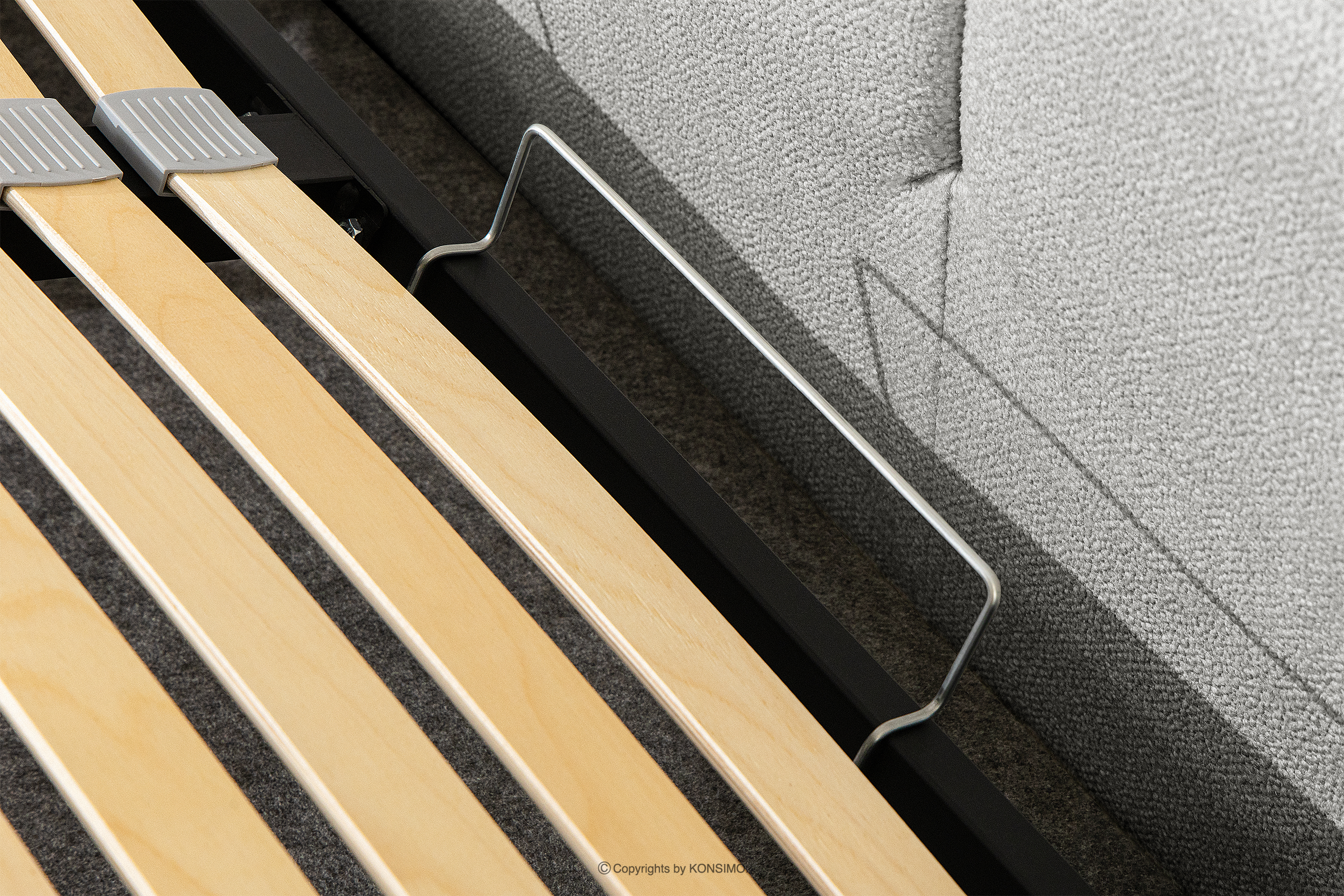 Das 160 cm lange Bett aus grauem Boucle-Stoff verbindet minimalistisches Design mit maximalem Komfort. Seine einzigartige Form lässt es nicht nur bemerkenswert aussehen, sondern bietet auch Komfort auf höchstem Niveau. Das Bett ist mit einem stabilen Rahmen aus flexiblen Holzlatten ausgestattet, die die Matratze optimal stützen und sich den natürlichen Bewegungen des Körpers anpassen.