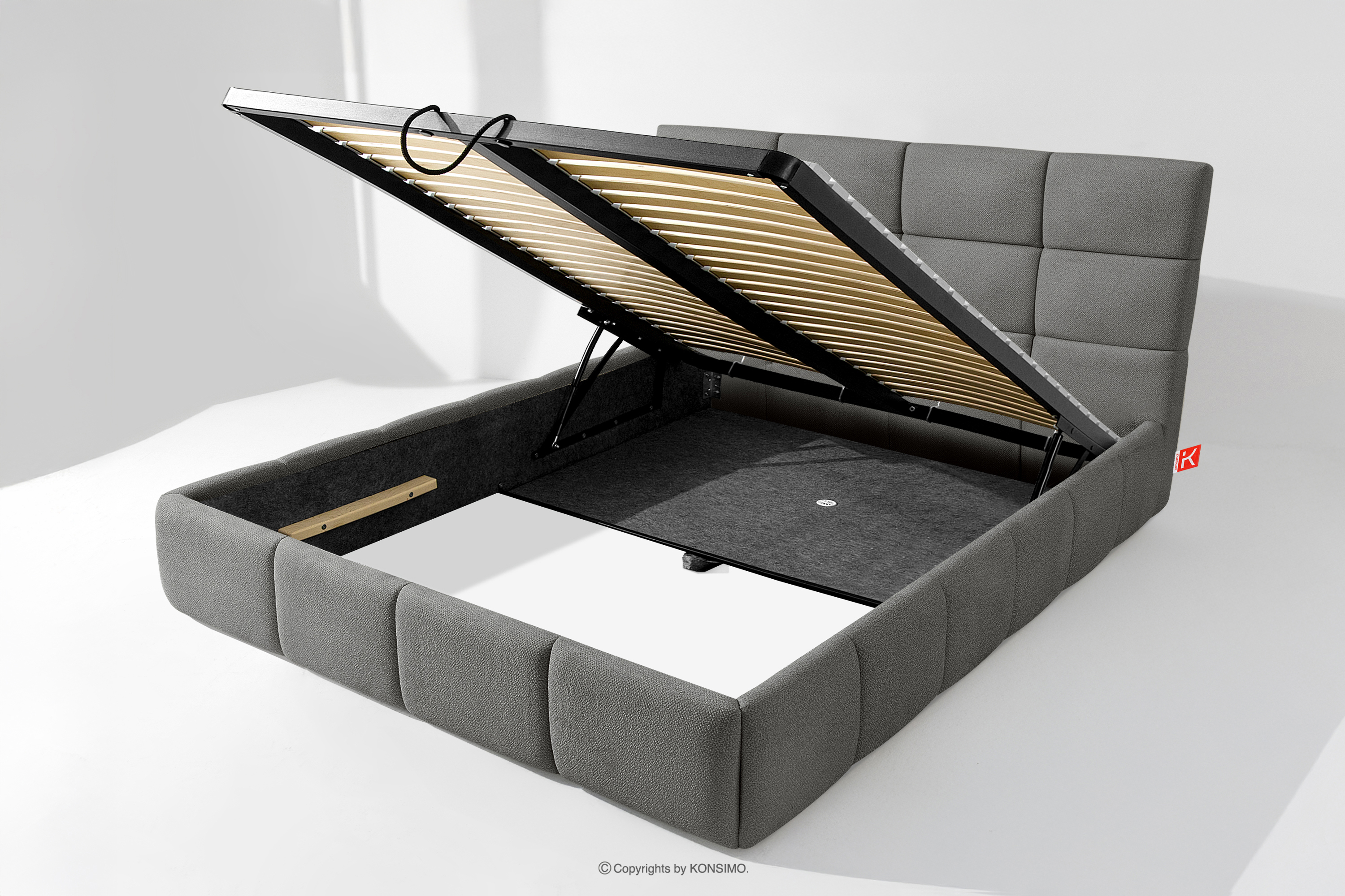 Das 160 cm lange Bett aus dunkelgrauem Boucle-Stoff verbindet minimalistisches Design mit maximalem Komfort. Seine einzigartige Form lässt es nicht nur bemerkenswert aussehen, sondern bietet auch Komfort auf höchstem Niveau. Das Bett ist mit einem stabilen Rahmen aus flexiblen Holzlatten ausgestattet, die die Matratze optimal stützen und sich den natürlichen Bewegungen des Körpers anpassen.