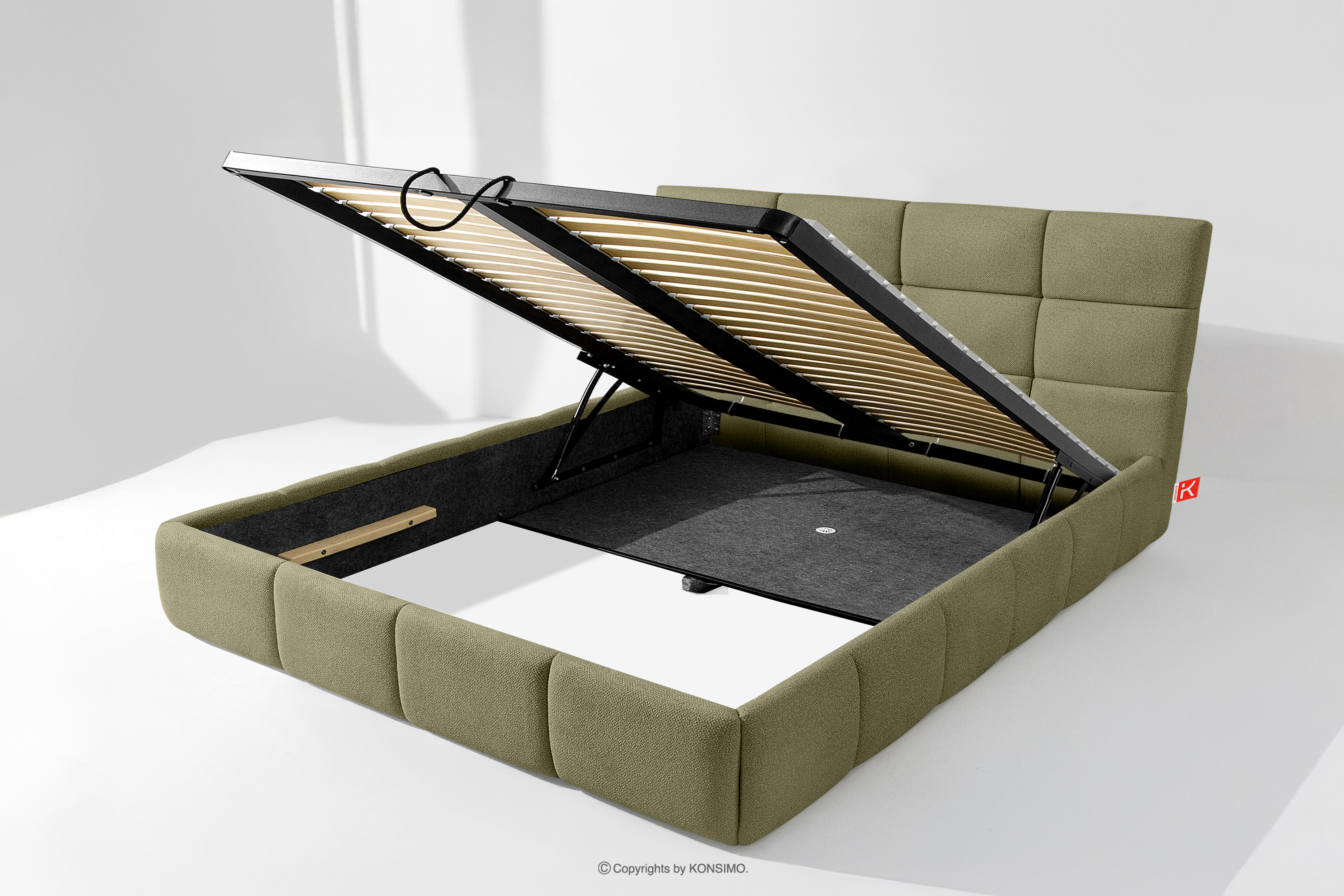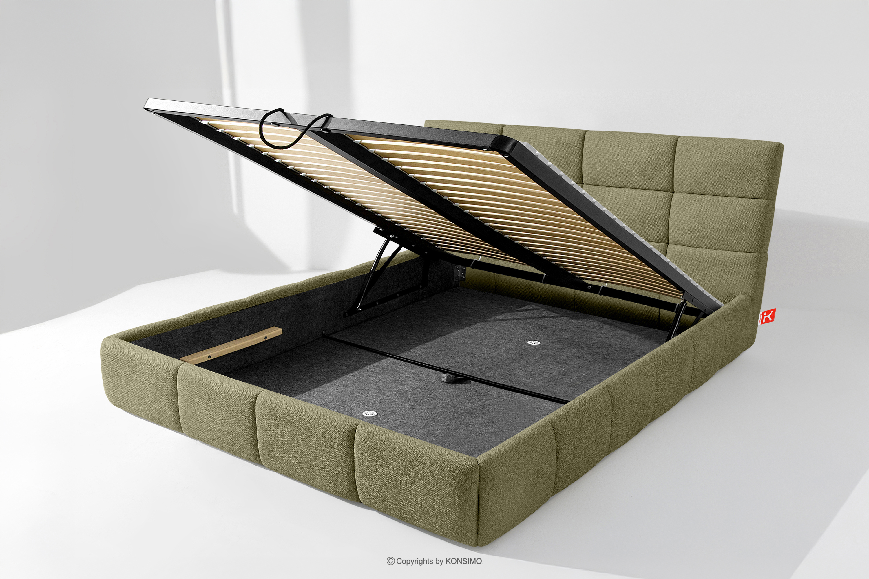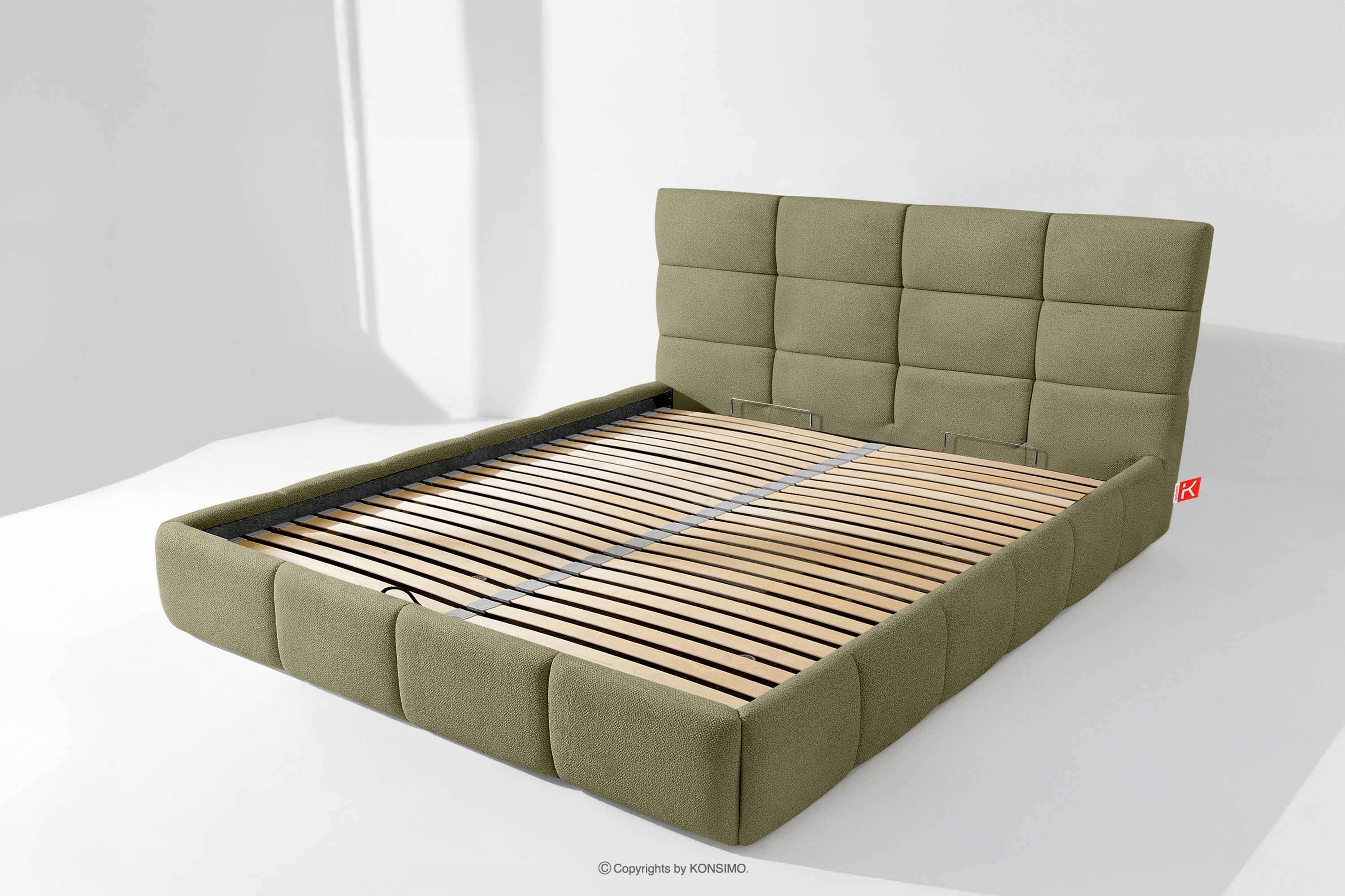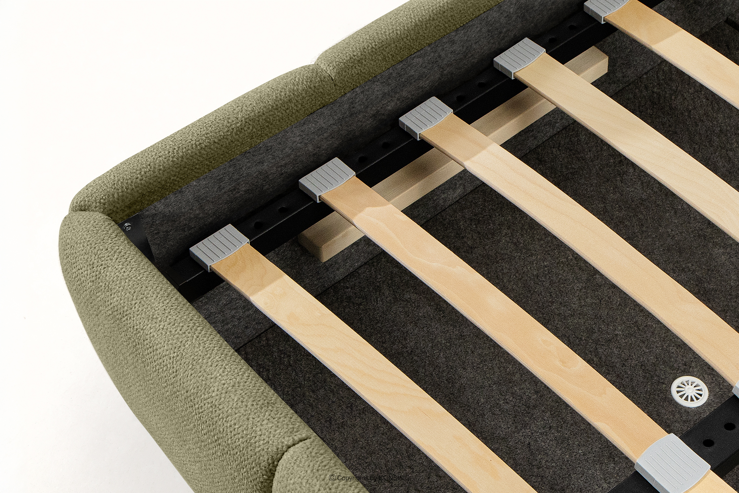 Das 180 cm lange Bett aus grünem Boucle-Stoff verbindet minimalistisches Design mit maximalem Komfort. Seine einzigartige Form lässt es nicht nur bemerkenswert aussehen, sondern bietet auch Komfort auf höchstem Niveau. Das Bett ist mit einem stabilen Rahmen aus flexiblen Holzlatten ausgestattet, die die Matratze optimal stützen und sich den natürlichen Bewegungen des Körpers anpassen.