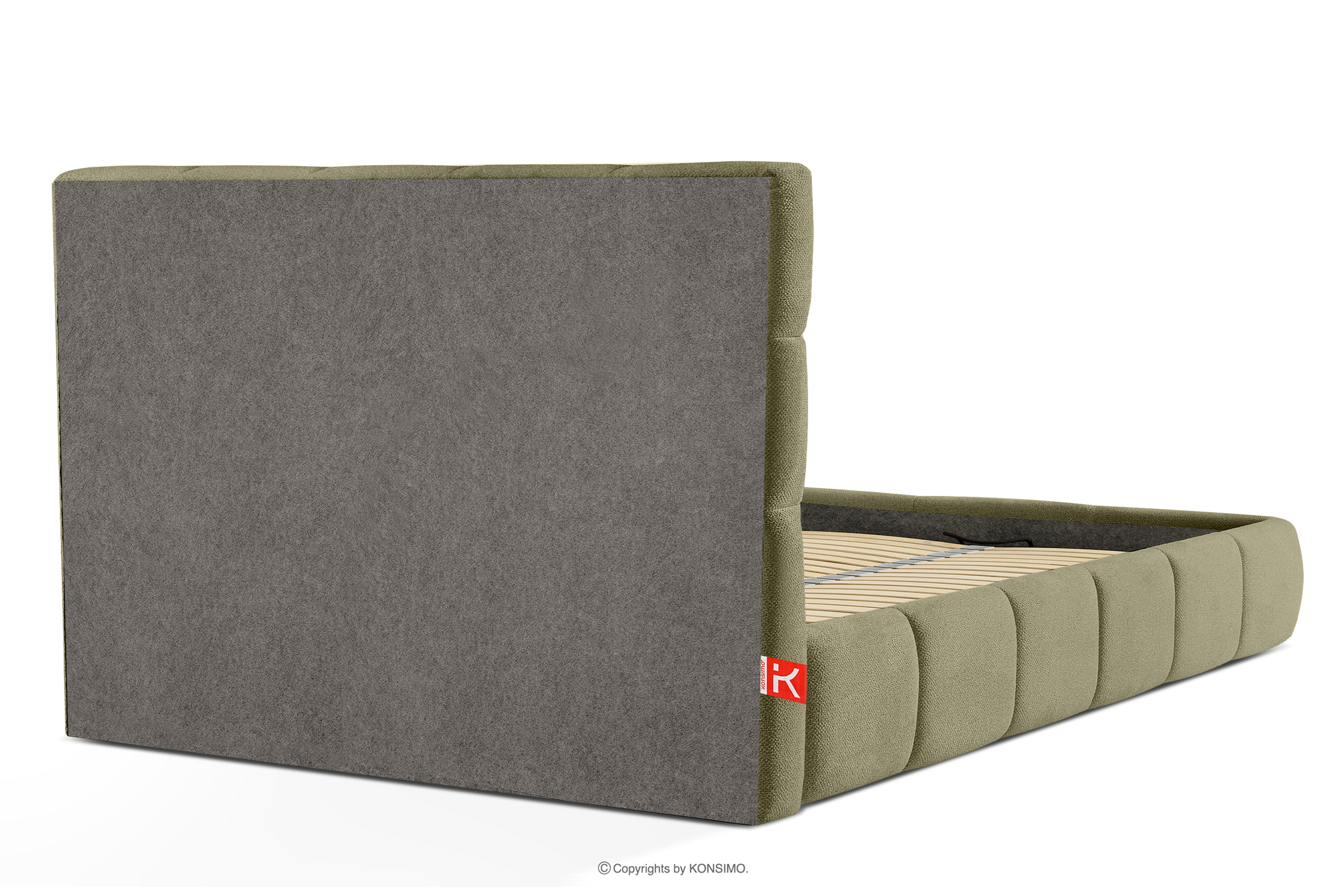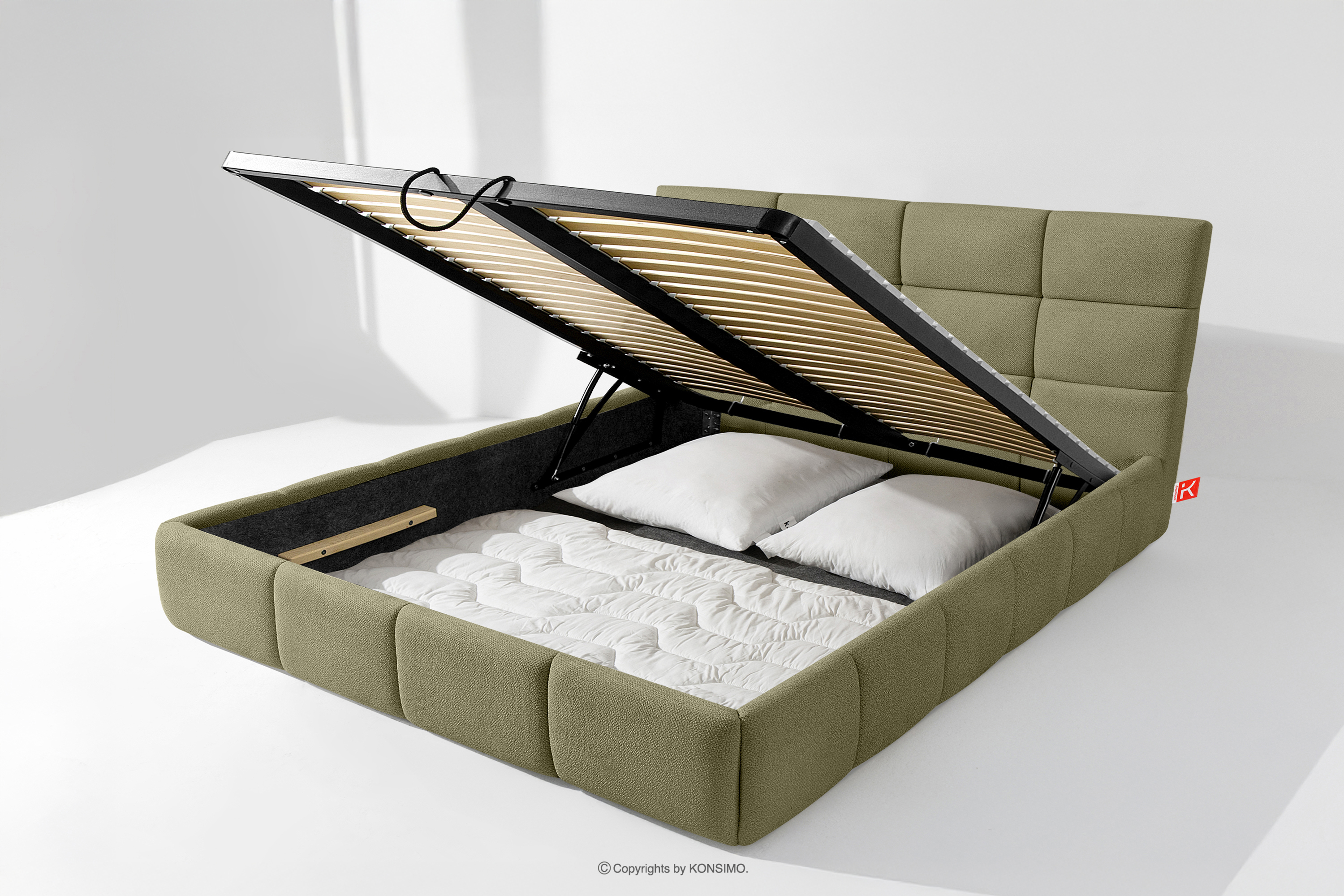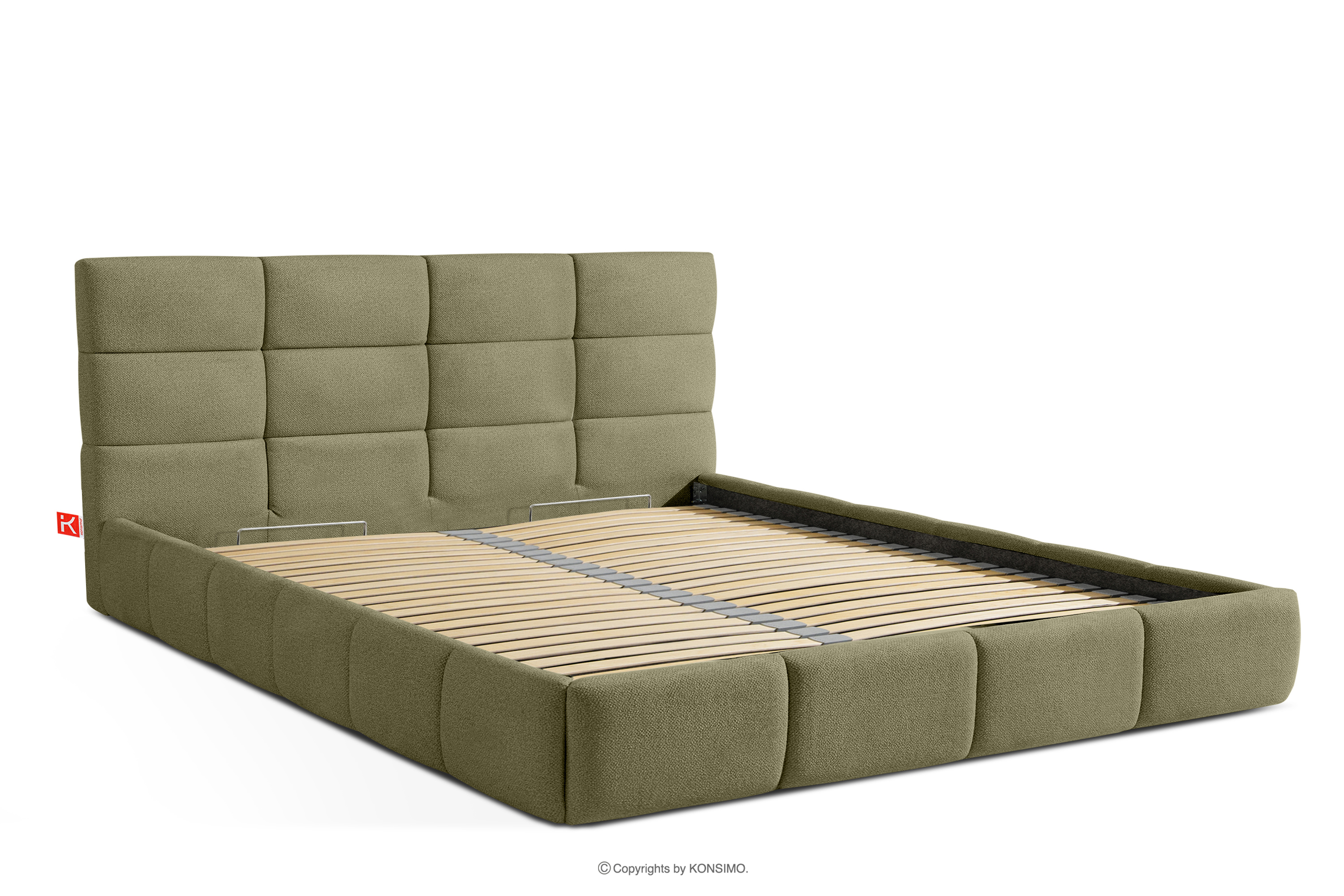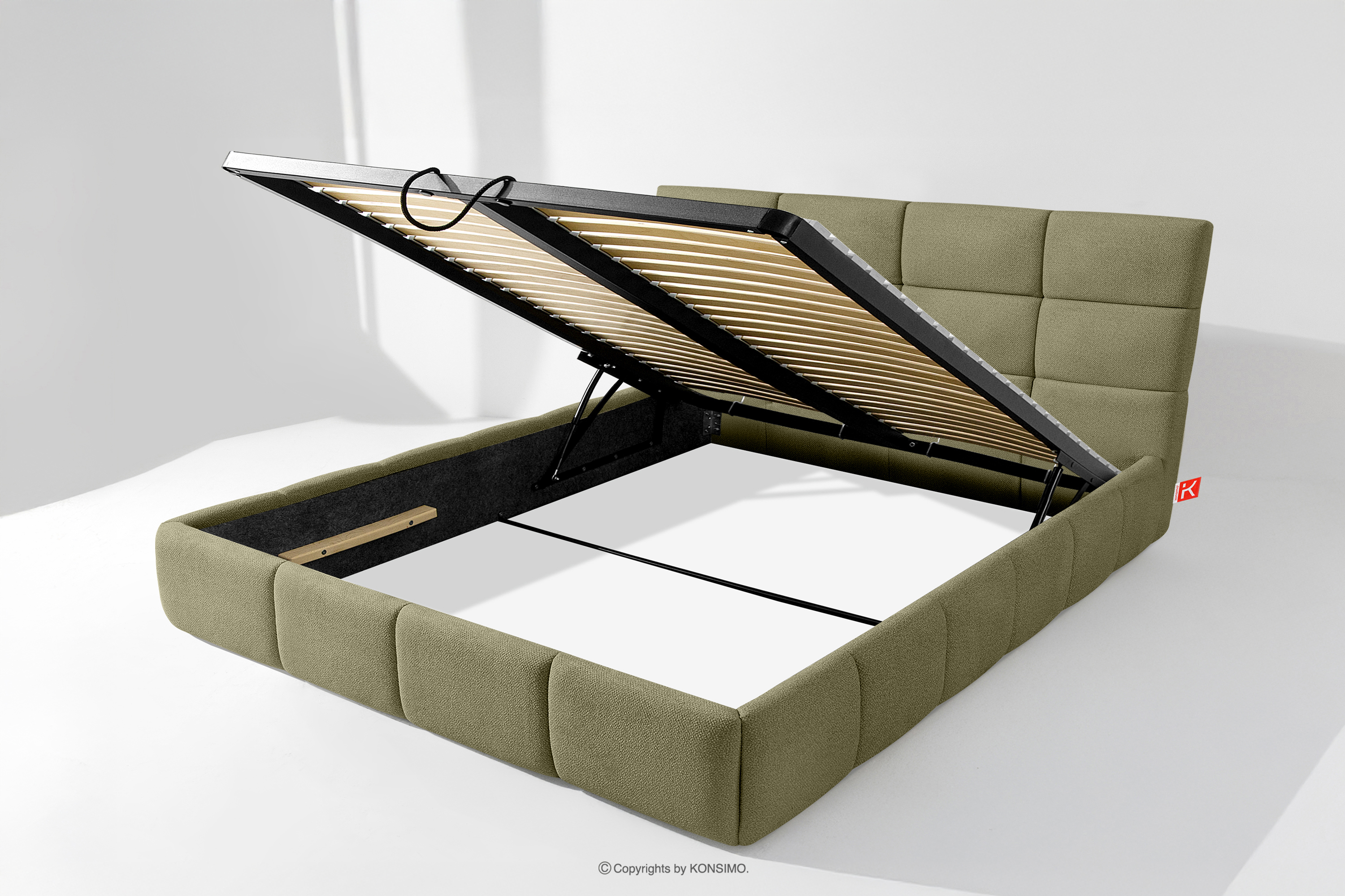 Das 180 cm lange Bett aus grünem Boucle-Stoff verbindet minimalistisches Design mit maximalem Komfort. Seine einzigartige Form lässt es nicht nur bemerkenswert aussehen, sondern bietet auch Komfort auf höchstem Niveau. Das Bett ist mit einem stabilen Rahmen aus flexiblen Holzlatten ausgestattet, die die Matratze optimal stützen und sich den natürlichen Bewegungen des Körpers anpassen.
