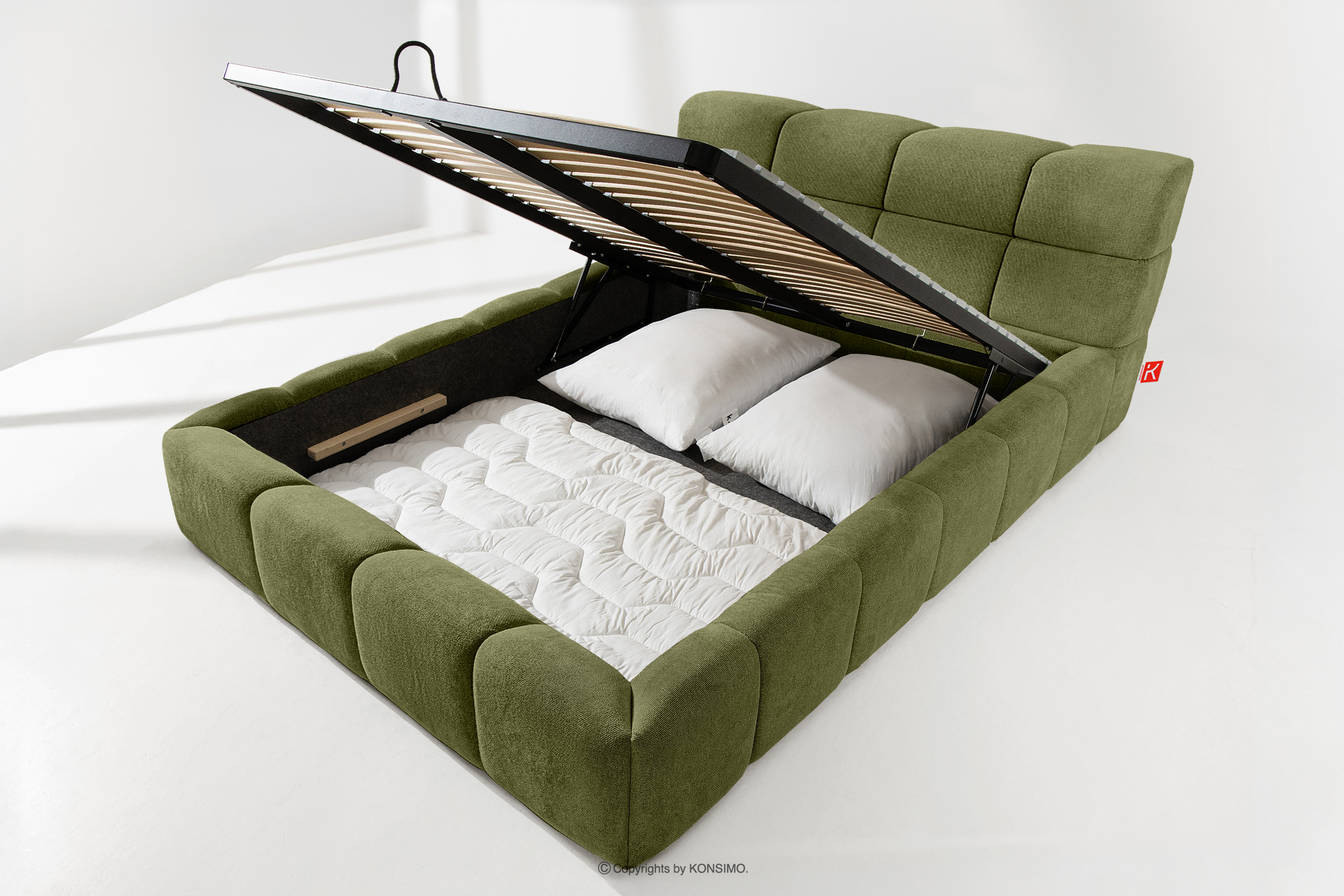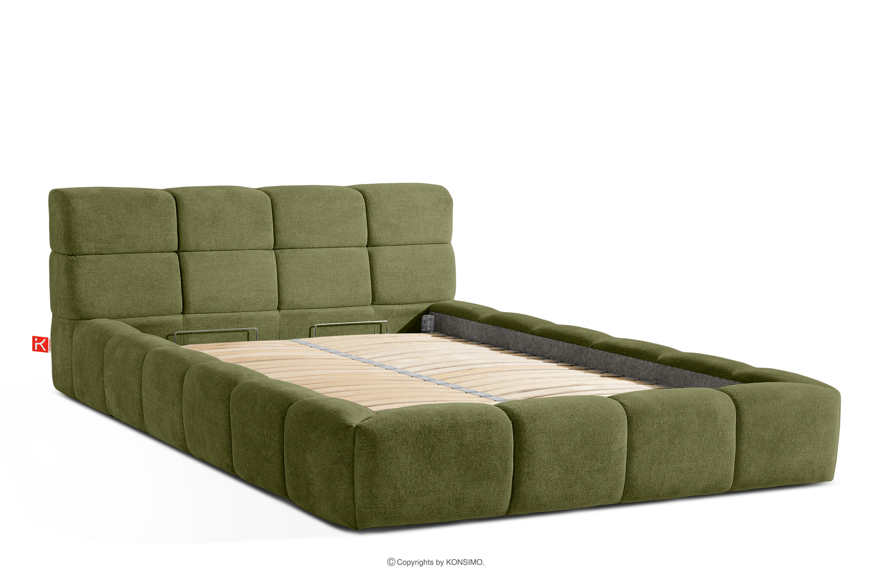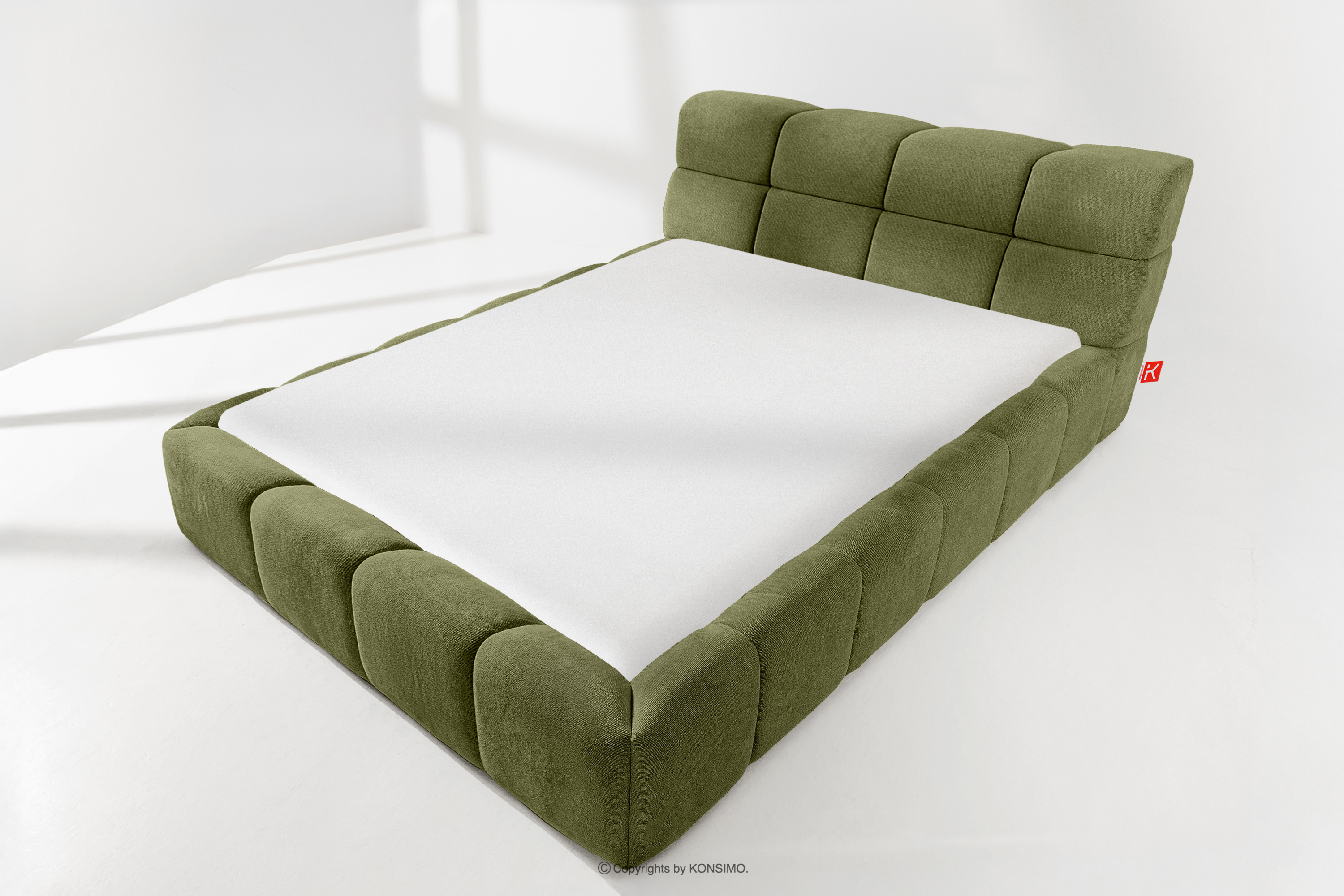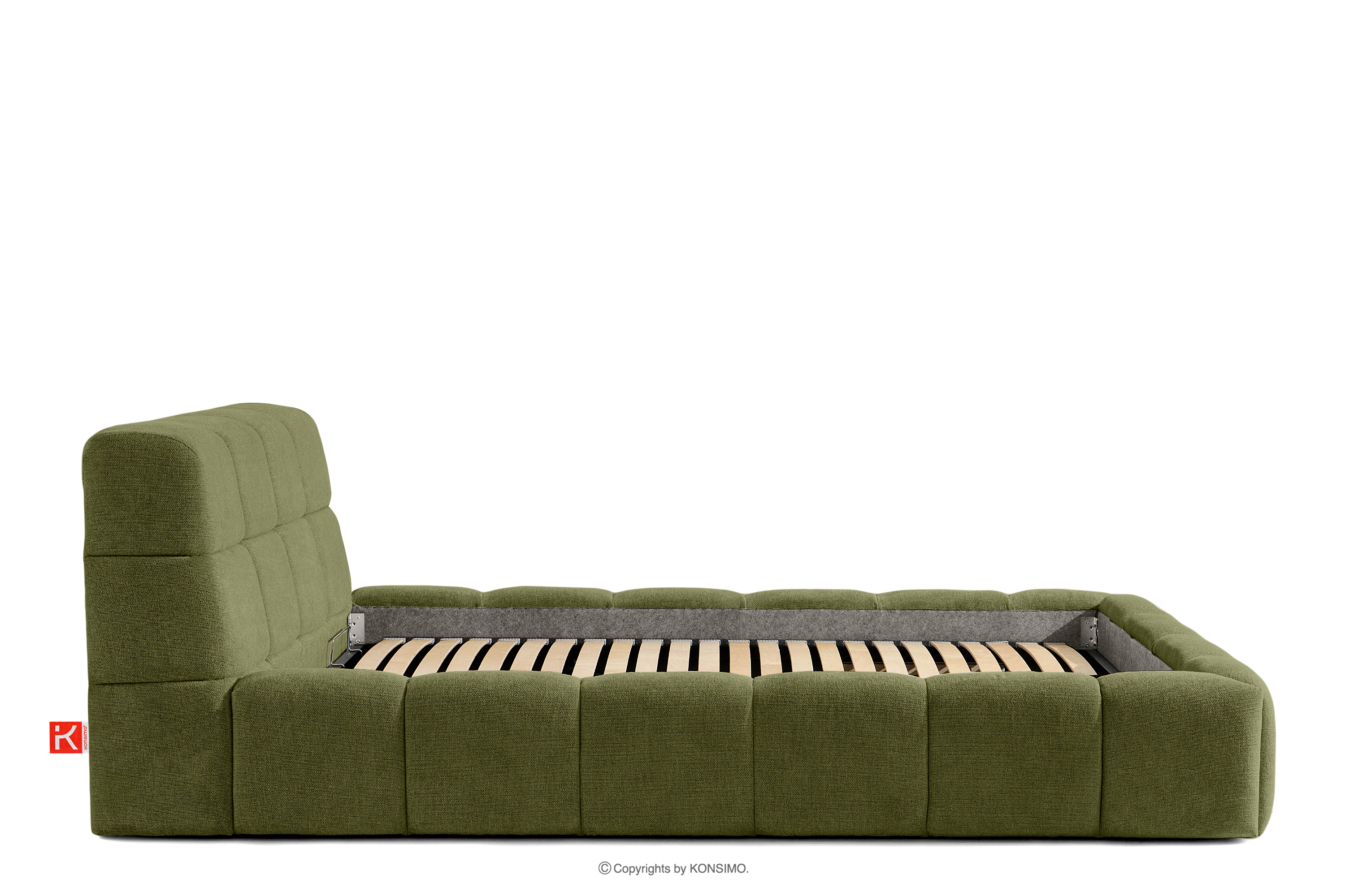 Das Bett 140 mit olivgrünem Kopfteil ist eine harmonische Kombination aus der Schlichtheit des skandinavischen Stils und außergewöhnlichem Nutzungskomfort. Seine einzigartige Form, die von der Form einer Wolke inspiriert ist, zieht mit ihrem originellen Design die Aufmerksamkeit auf sich und bietet gleichzeitig Komfort auf höchstem Niveau. Die Konstruktion basiert auf einem flexiblen Rahmen aus Holzlatten, dessen zusätzlicher Vorteil die Möglichkeit ist, die Härte des Bettes einzustellen - dank der herausnehmbaren Latten kann man den Grad der Weichheit den individuellen Vorlieben anpassen.