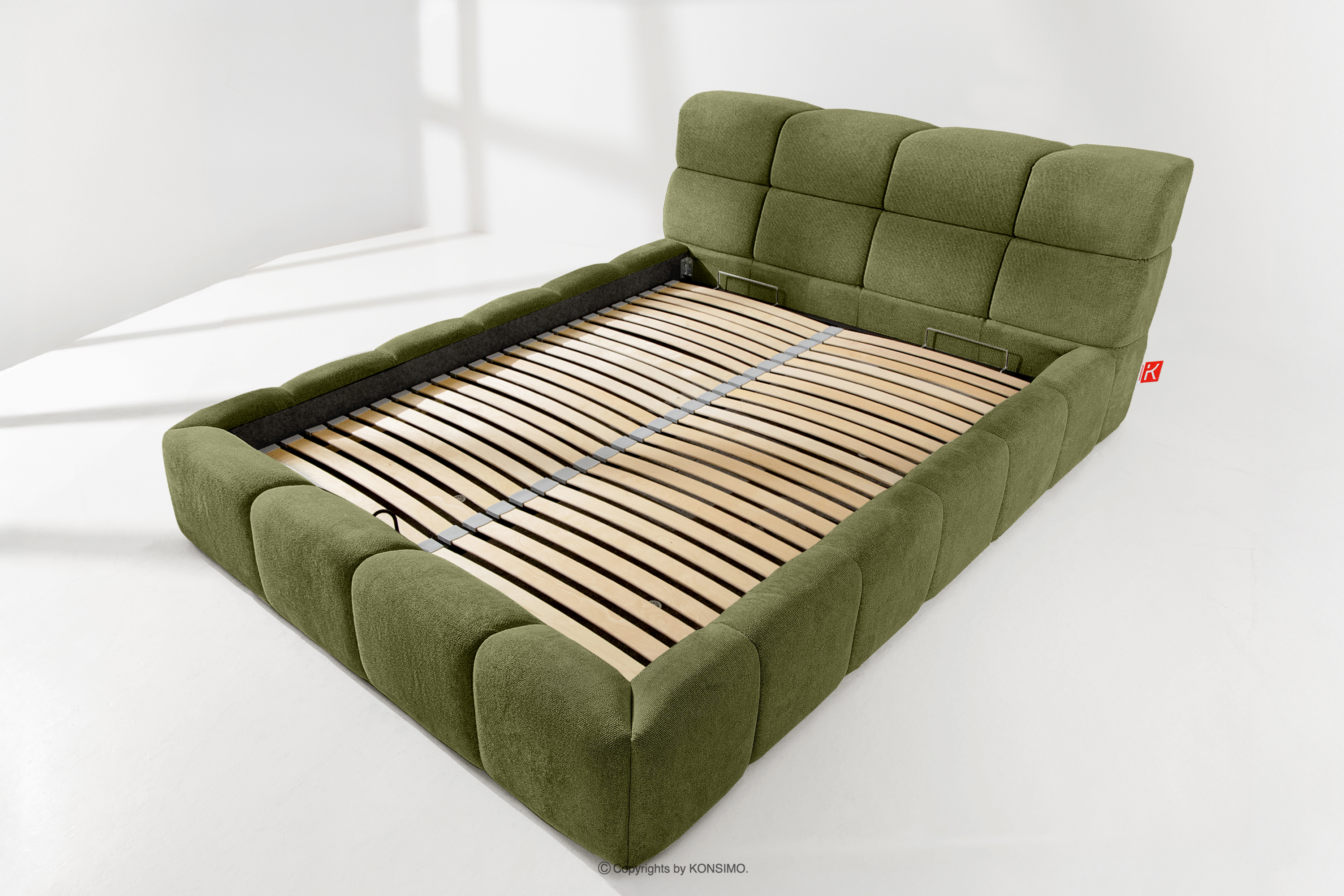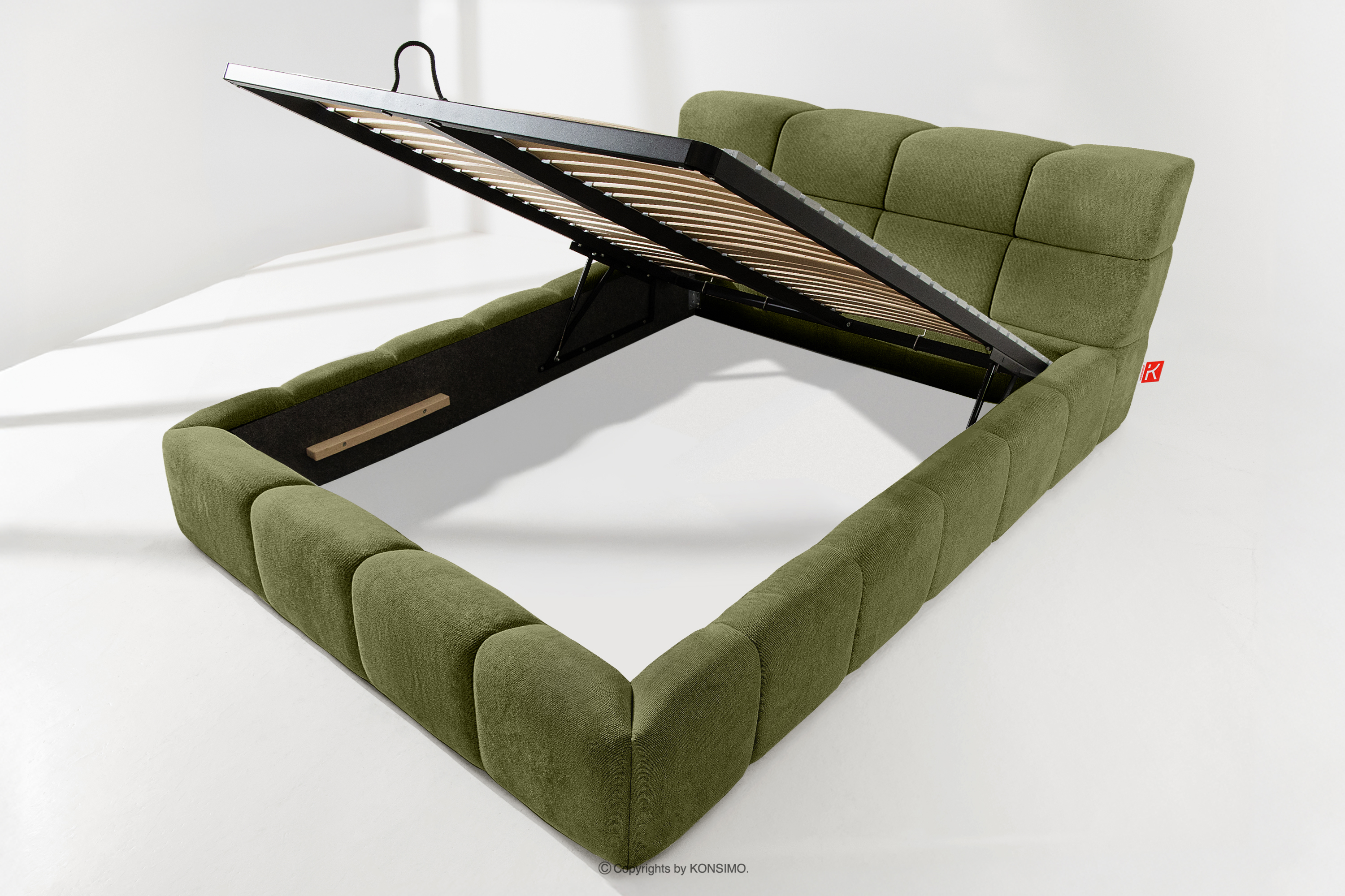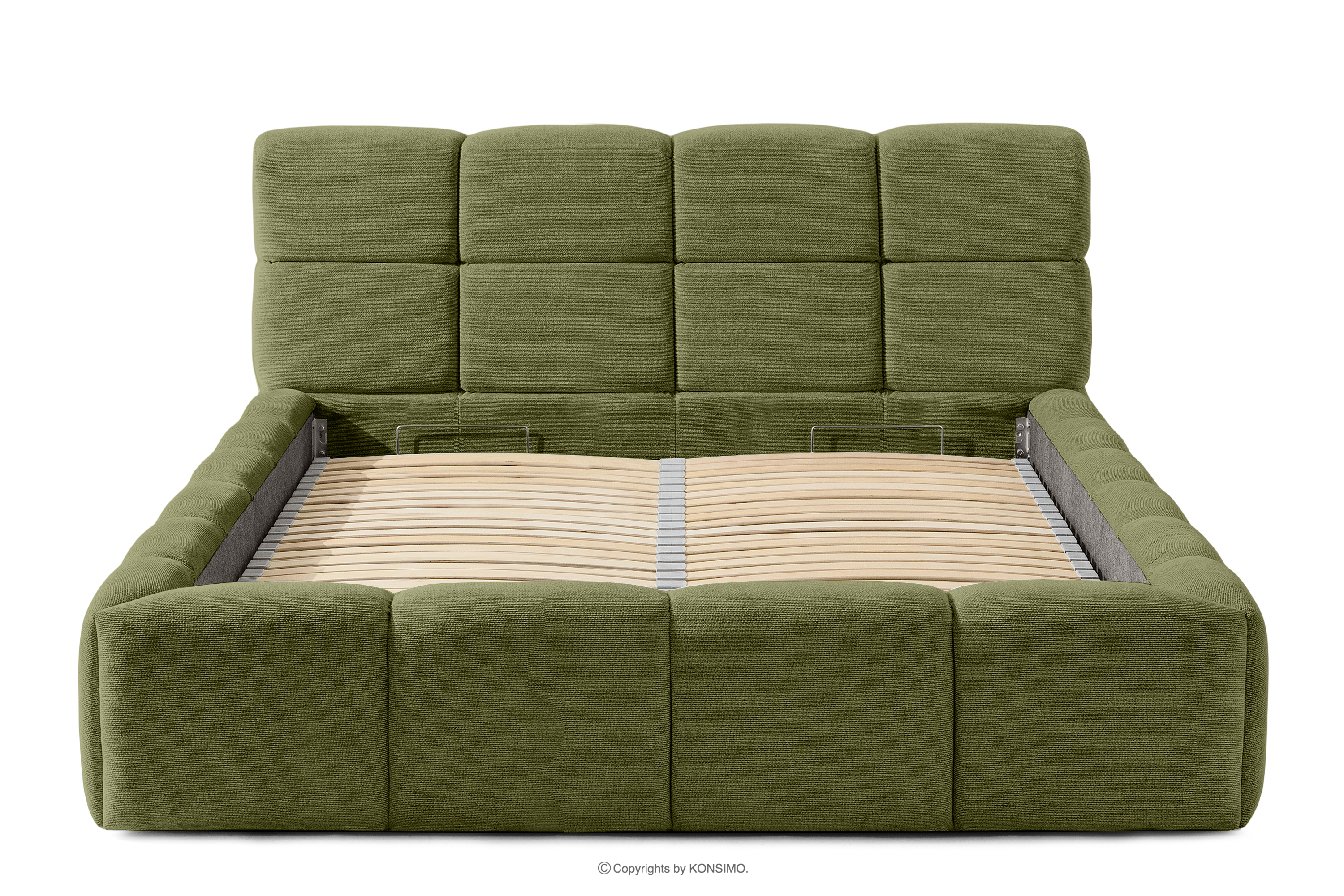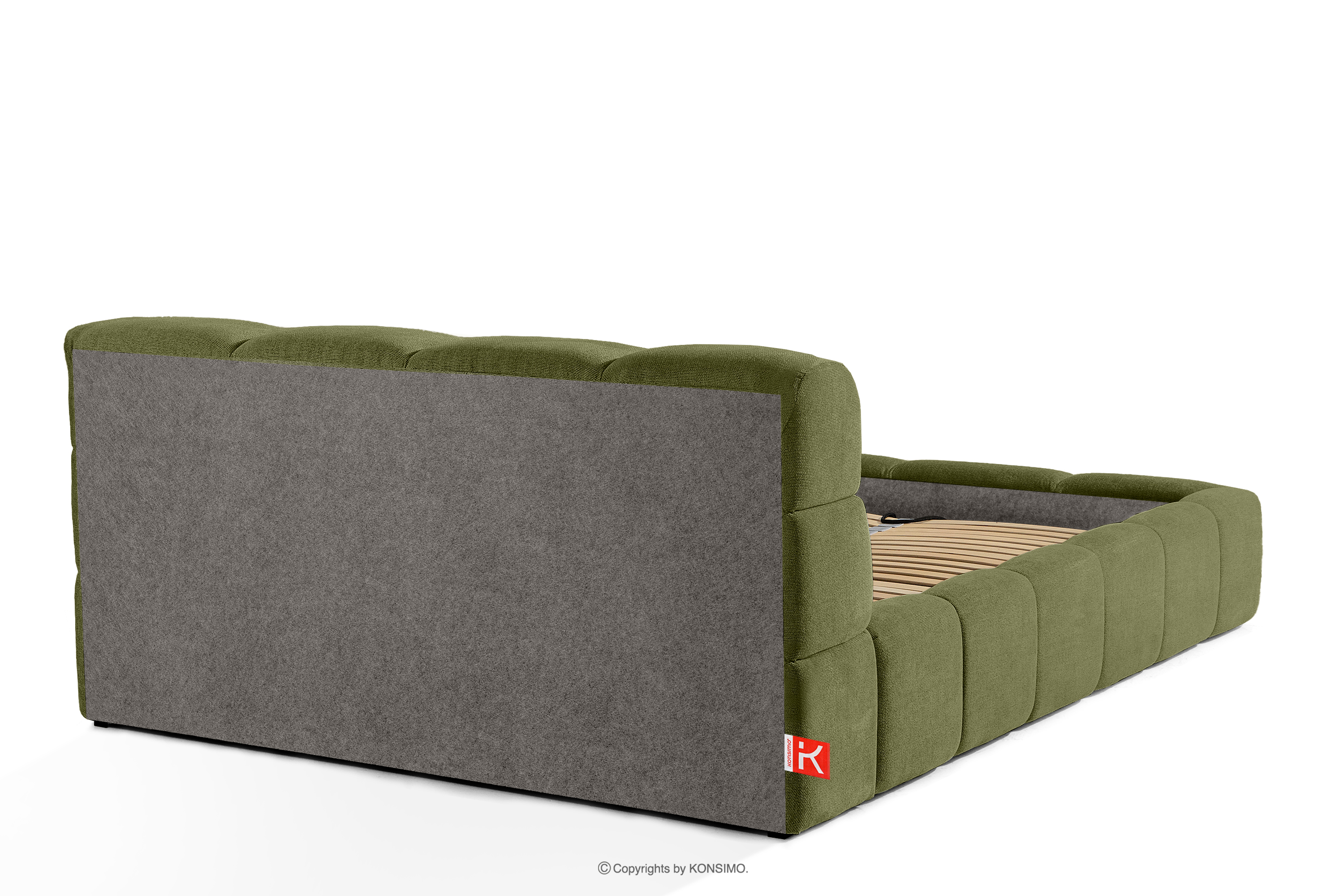 Das Bett 140 mit olivgrünem Kopfteil ist eine harmonische Kombination aus der Schlichtheit des skandinavischen Stils und außergewöhnlichem Nutzungskomfort. Seine einzigartige Form, die von der Form einer Wolke inspiriert ist, zieht mit ihrem originellen Design die Aufmerksamkeit auf sich und bietet gleichzeitig Komfort auf höchstem Niveau. Die Konstruktion basiert auf einem flexiblen Rahmen aus Holzlatten, dessen zusätzlicher Vorteil die Möglichkeit ist, die Härte des Bettes einzustellen - dank der herausnehmbaren Latten kann man den Grad der Weichheit den individuellen Vorlieben anpassen.