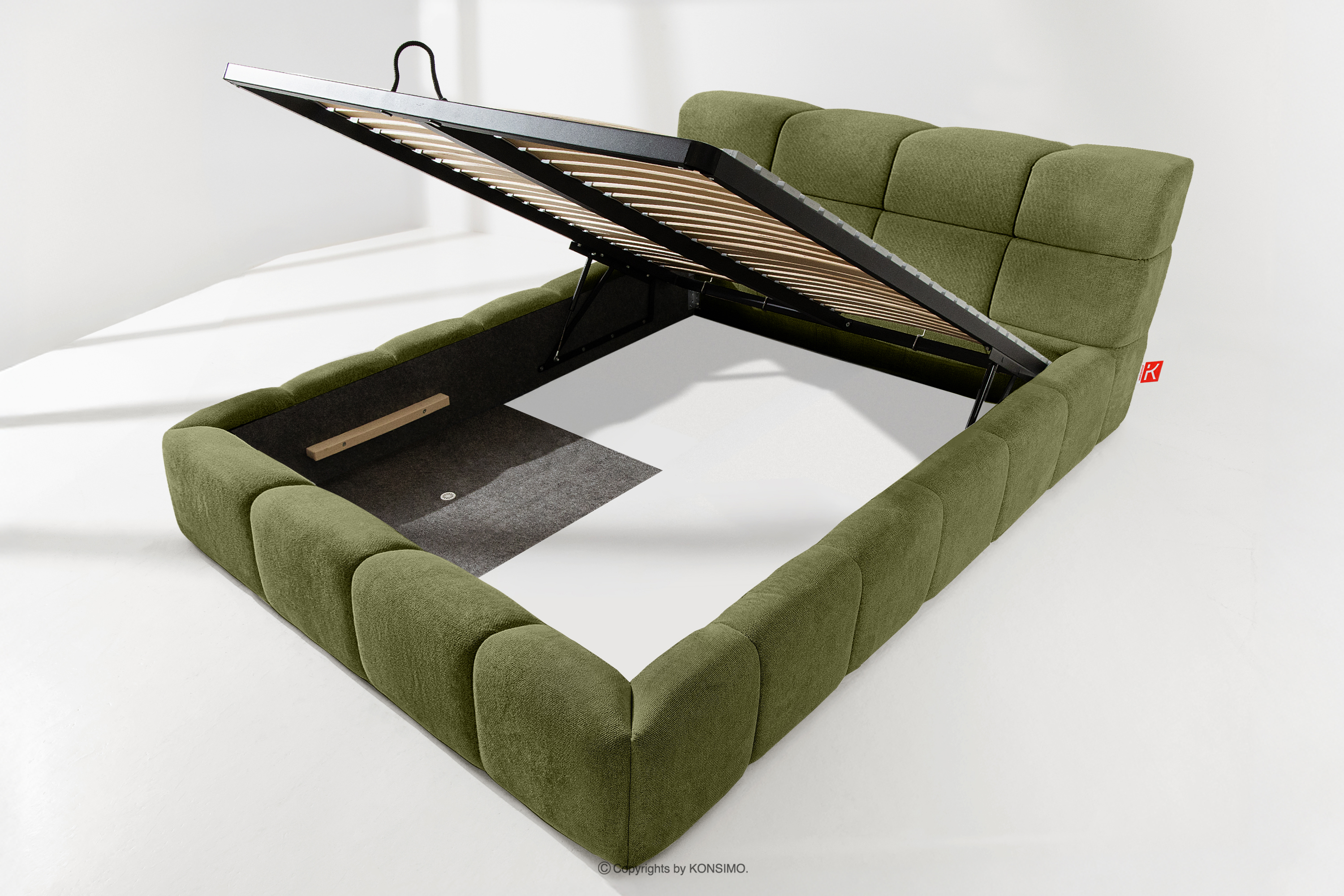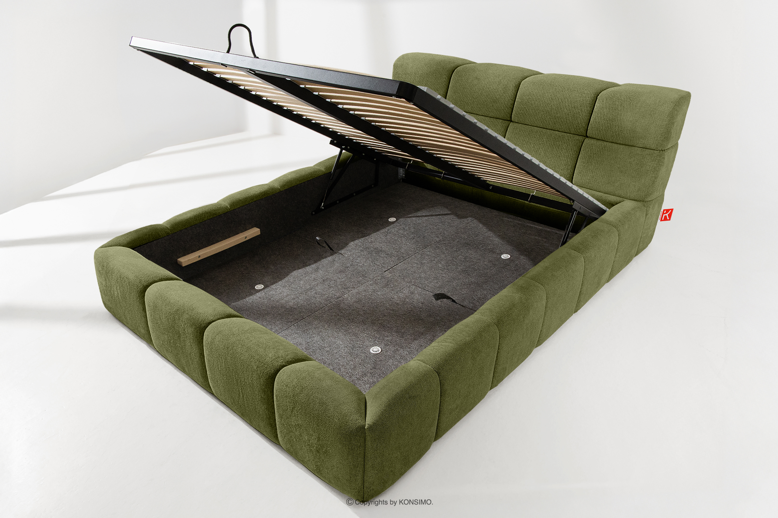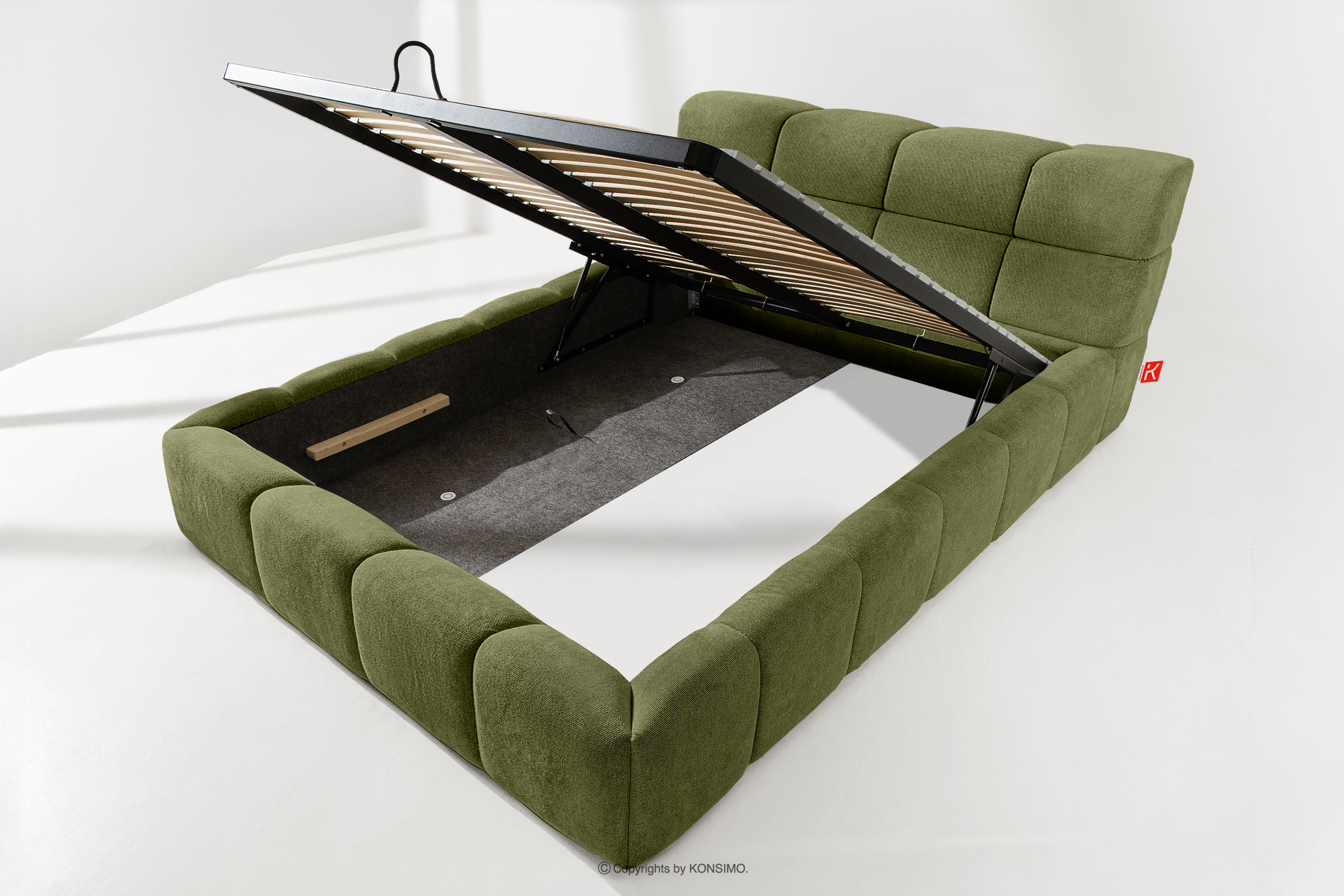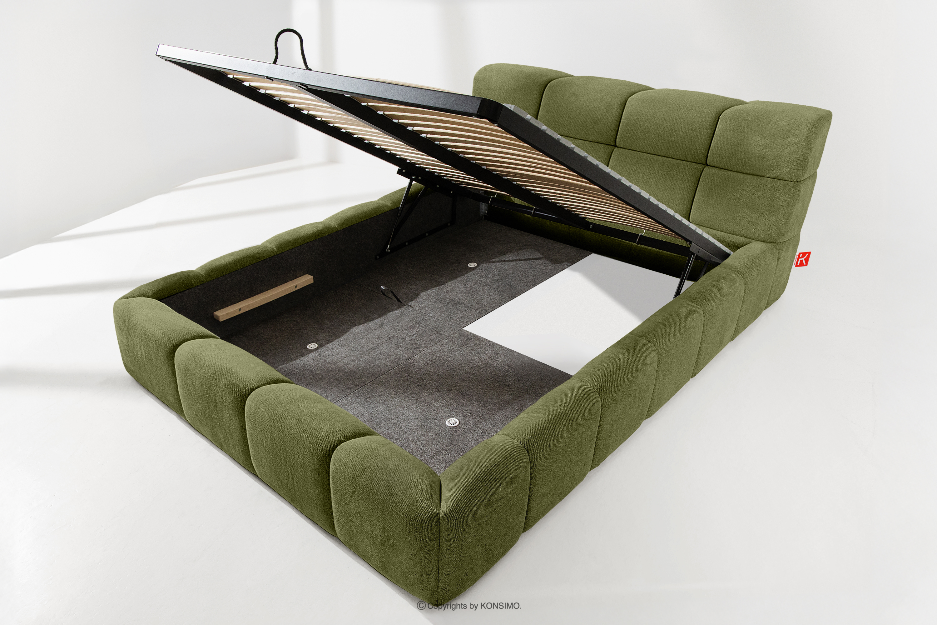 Das Bett 140 mit olivgrünem Kopfteil ist eine harmonische Kombination aus der Schlichtheit des skandinavischen Stils und außergewöhnlichem Nutzungskomfort. Seine einzigartige Form, die von der Form einer Wolke inspiriert ist, zieht mit ihrem originellen Design die Aufmerksamkeit auf sich und bietet gleichzeitig Komfort auf höchstem Niveau. Die Konstruktion basiert auf einem flexiblen Rahmen aus Holzlatten, dessen zusätzlicher Vorteil die Möglichkeit ist, die Härte des Bettes einzustellen - dank der herausnehmbaren Latten kann man den Grad der Weichheit den individuellen Vorlieben anpassen.