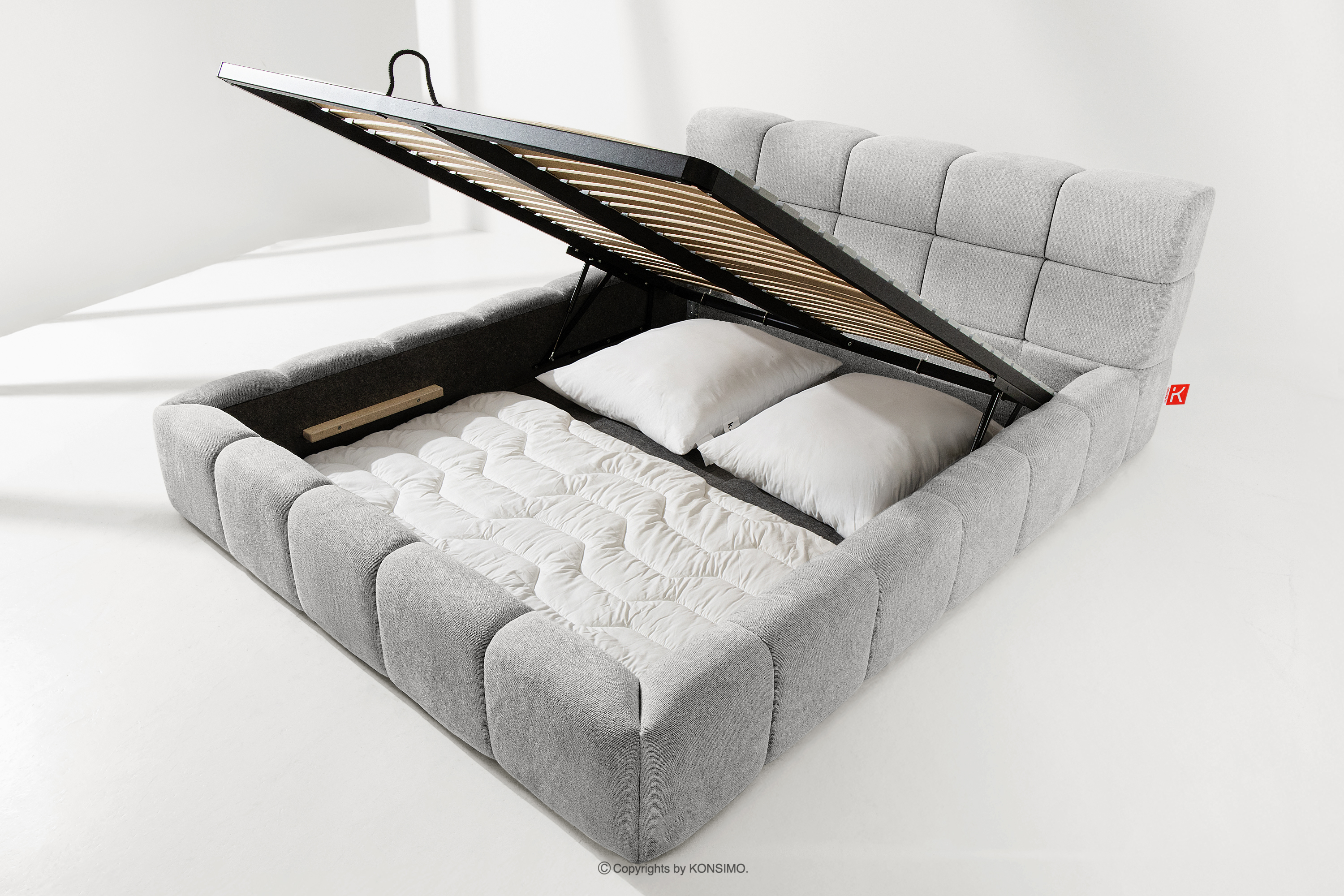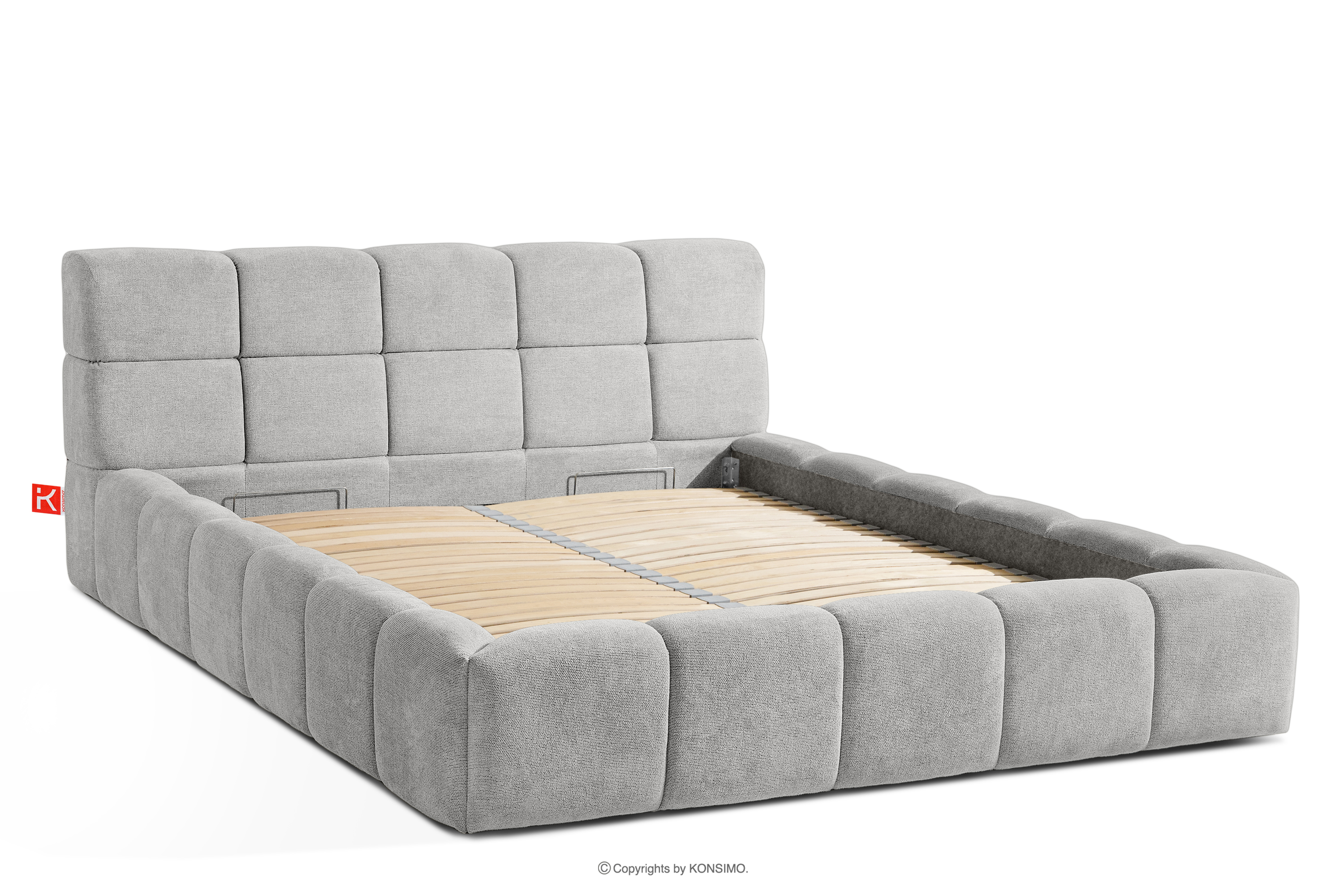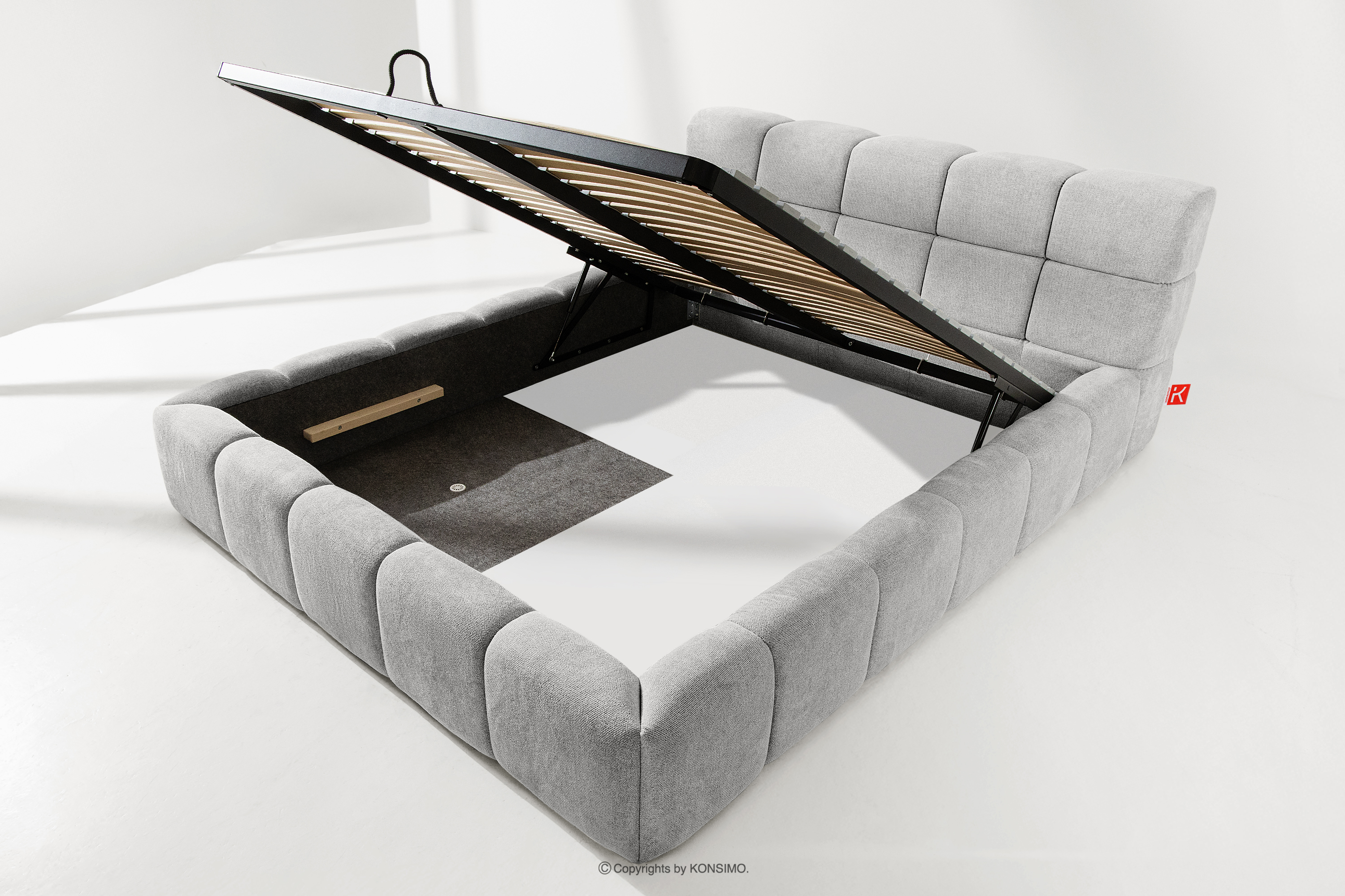 Das Bett 160 mit Kopfteil in Hellgrau ist eine harmonische Kombination aus der Schlichtheit des skandinavischen Stils und außergewöhnlichem Nutzungskomfort. Seine einzigartige Form, die von der Form einer Wolke inspiriert ist, zieht mit ihrem originellen Design die Aufmerksamkeit auf sich und bietet gleichzeitig Komfort auf höchstem Niveau. Die Konstruktion basiert auf einem flexiblen Rahmen aus Holzlatten, dessen zusätzlicher Vorteil die Möglichkeit ist, die Härte des Bettes einzustellen - dank der herausnehmbaren Latten kann man den Grad der Weichheit den individuellen Vorlieben anpassen.