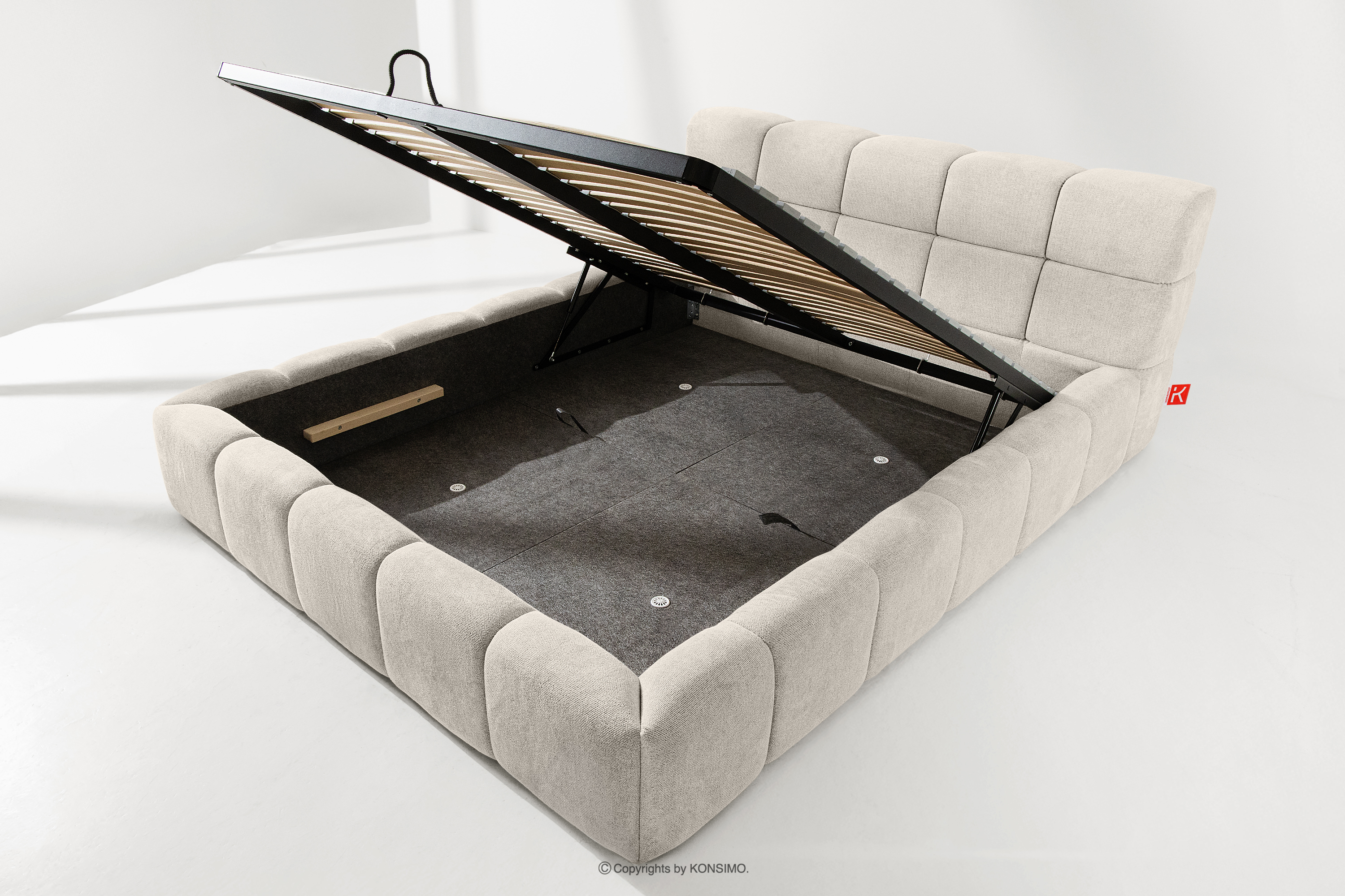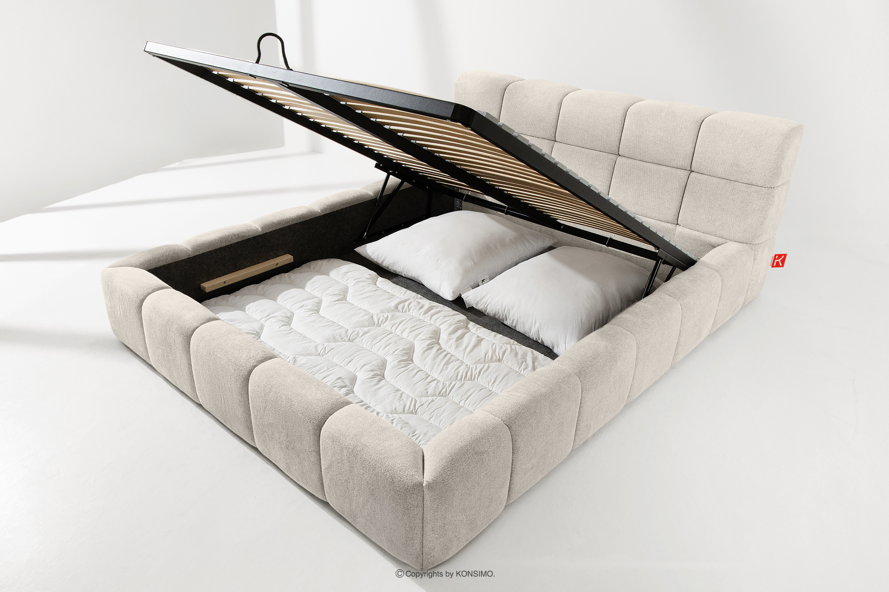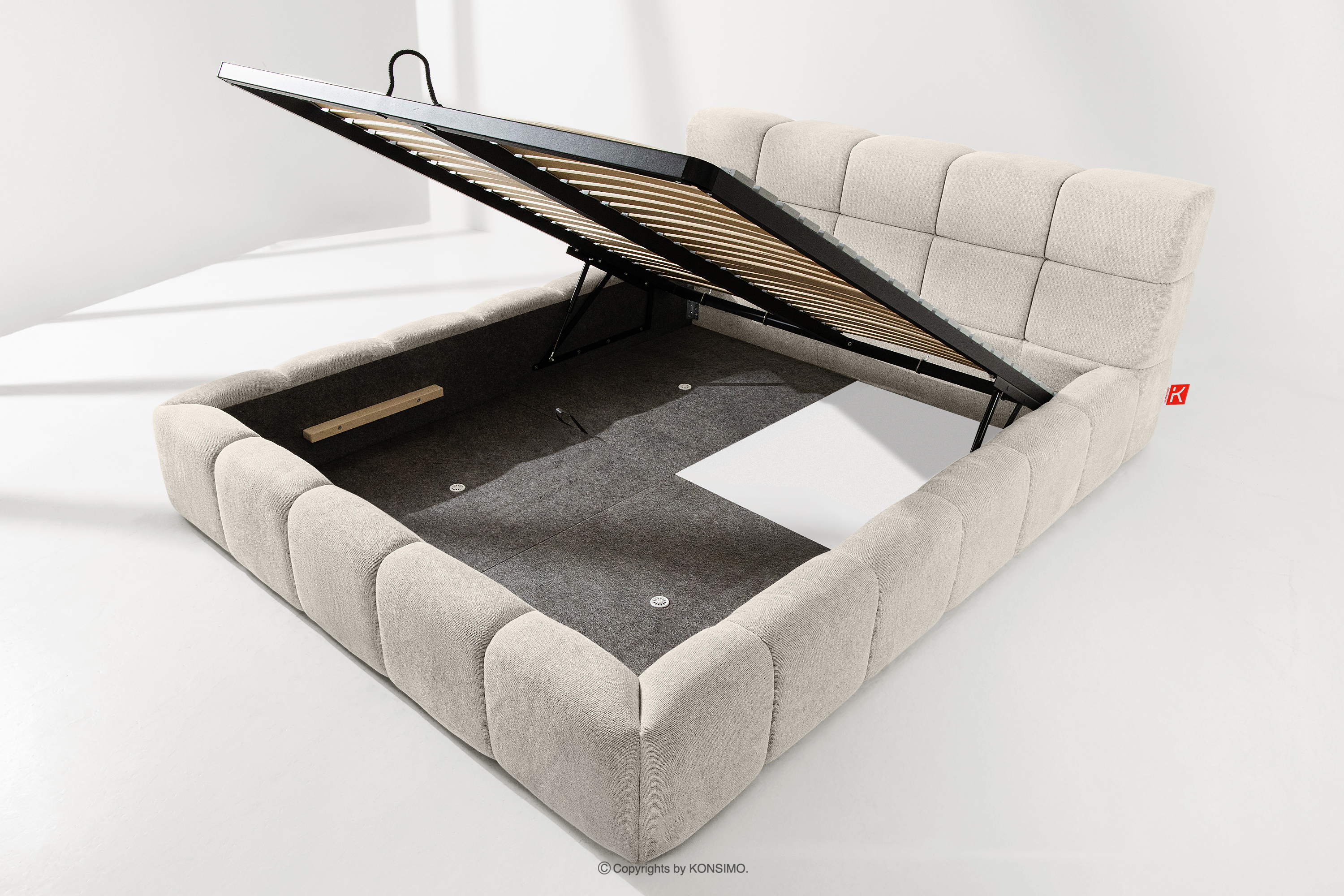 Der praktische Bettkasten, der durch Gasflaschen geöffnet wird, ist eine moderne Lösung, die den Zugriff auf die gelagerten Gegenstände ohne großen Aufwand ermöglicht. Dank der Funktionalität dieses Mechanismus lässt sich der Behälter sanft und leicht öffnen, was den Nutzungskomfort weiter erhöht.