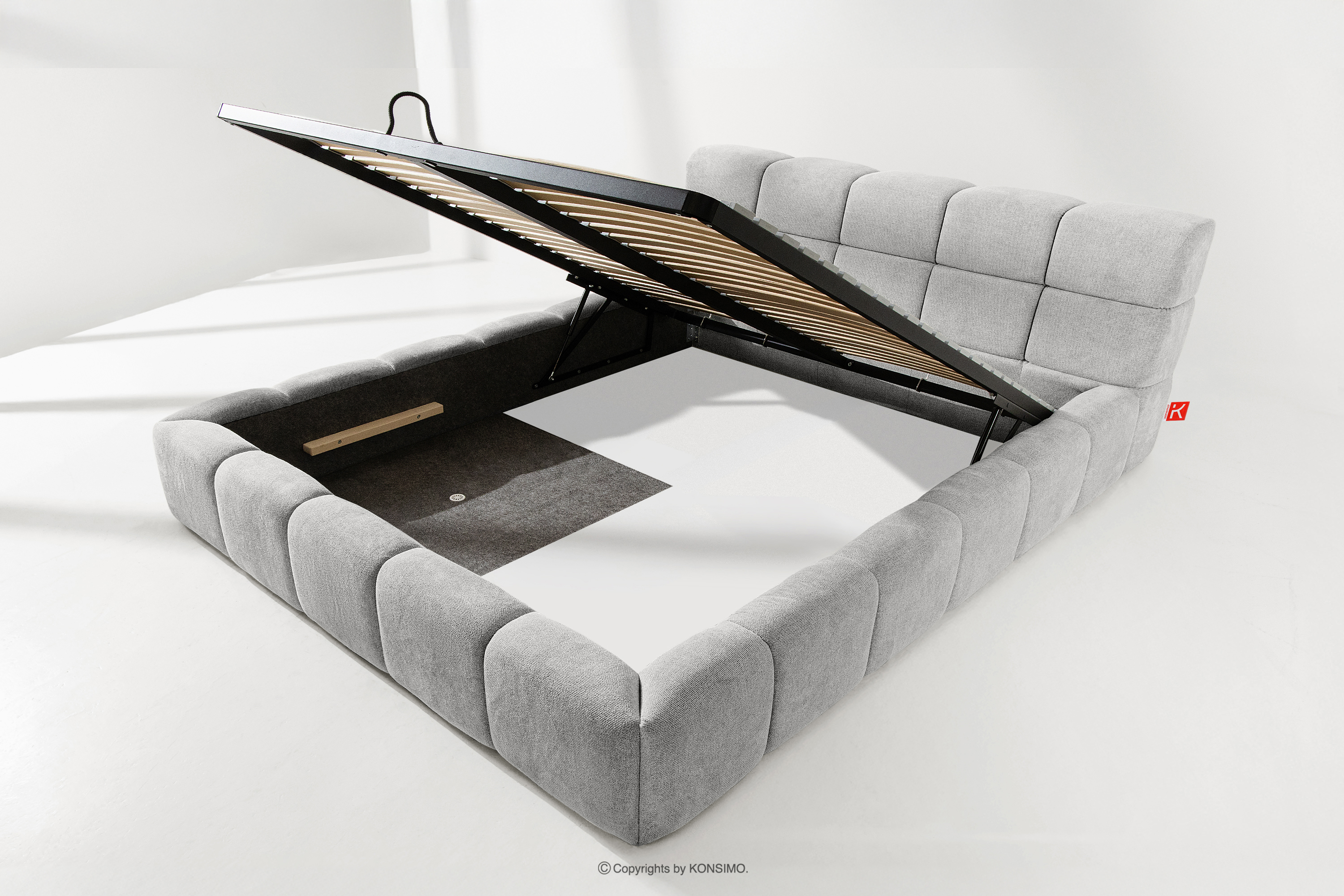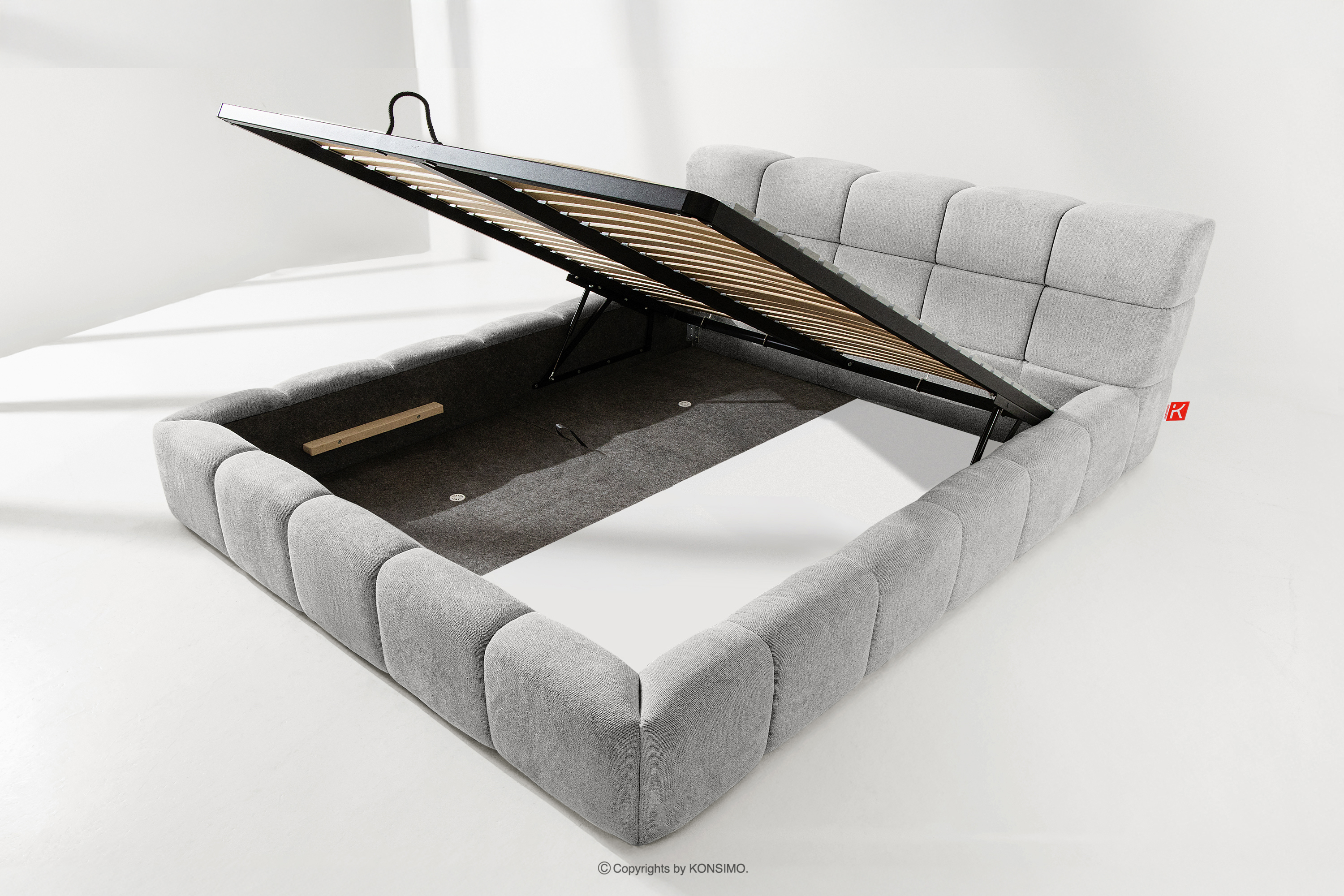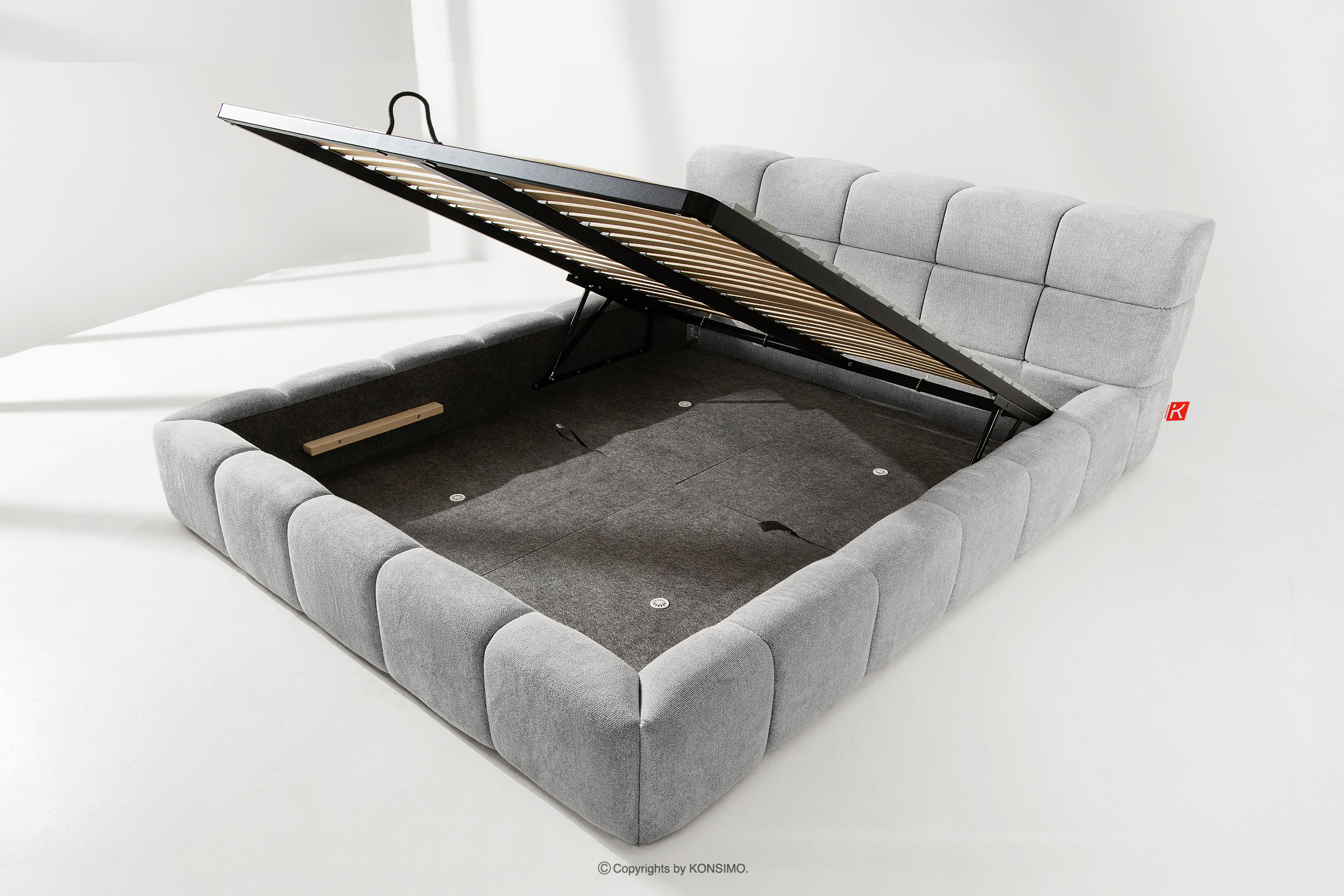 Der praktische Bettkasten, der durch Gasflaschen geöffnet wird, ist eine moderne Lösung, die den Zugriff auf die gelagerten Gegenstände ohne großen Aufwand ermöglicht. Dank der Funktionalität dieses Mechanismus lässt sich der Behälter sanft und leicht öffnen, was den Nutzungskomfort weiter erhöht.