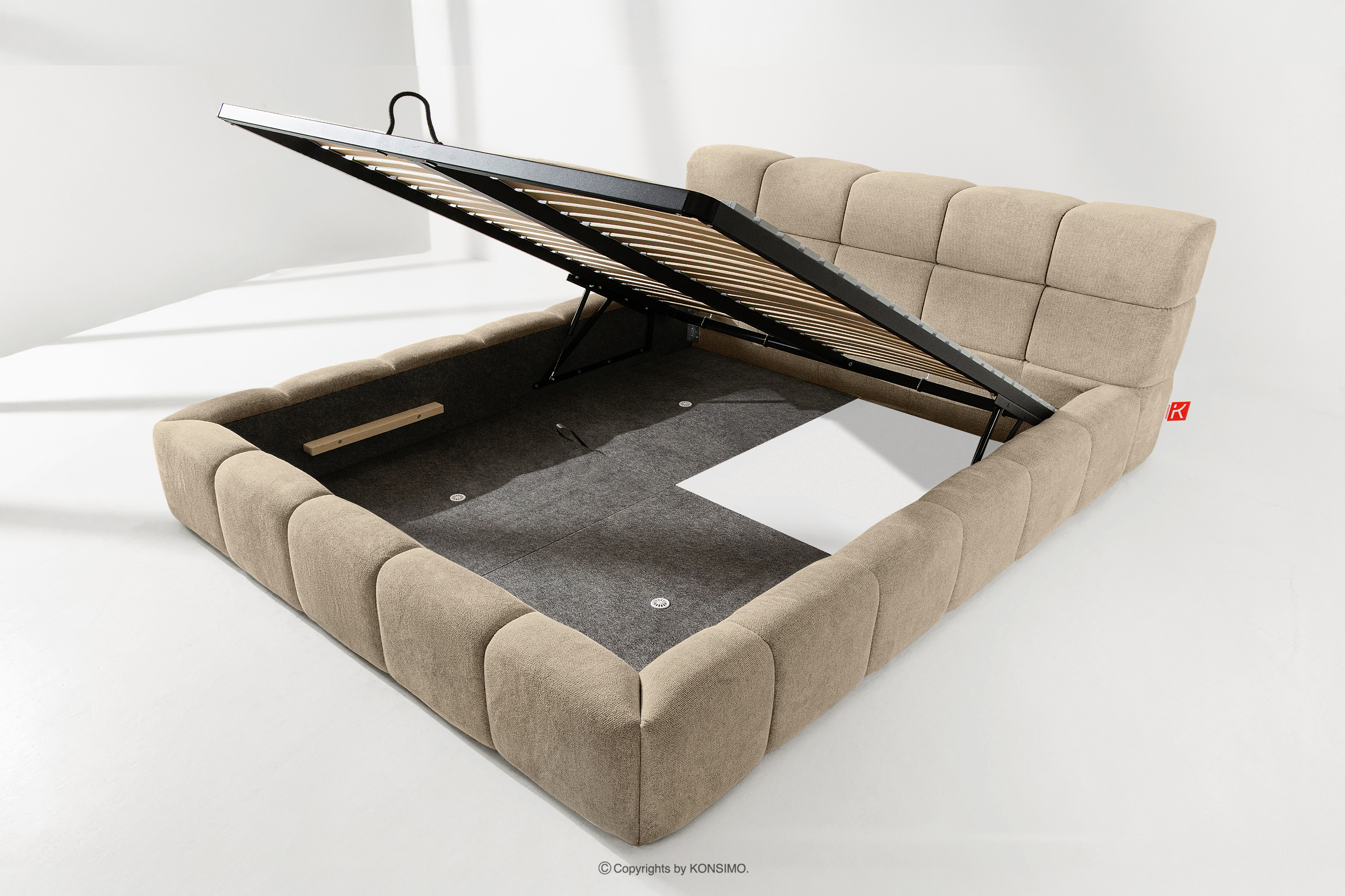 Der praktische Bettkasten, der durch Gasflaschen geöffnet wird, ist eine moderne Lösung, die den Zugriff auf die gelagerten Gegenstände ohne großen Aufwand ermöglicht. Dank der Funktionalität dieses Mechanismus lässt sich der Behälter sanft und leicht öffnen, was den Nutzungskomfort weiter erhöht.