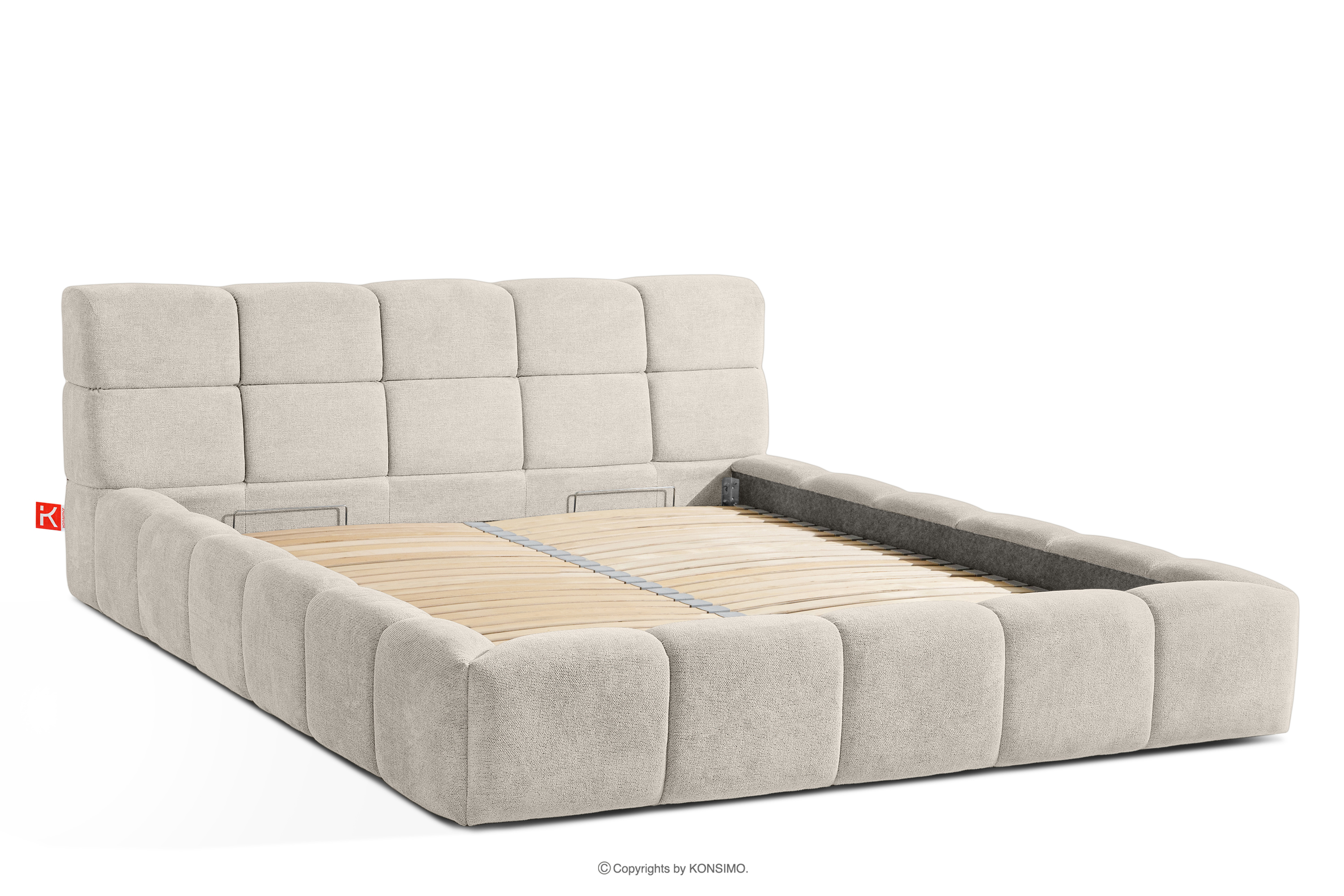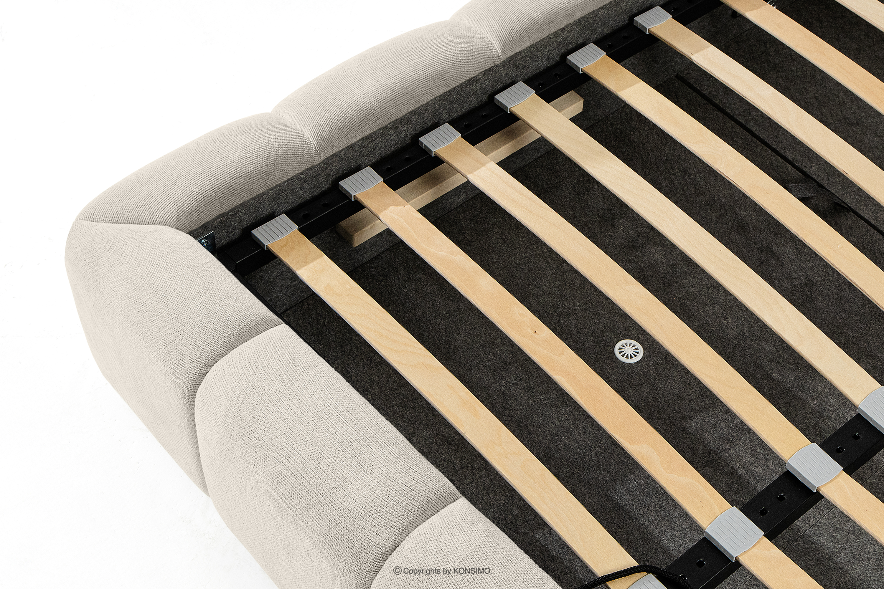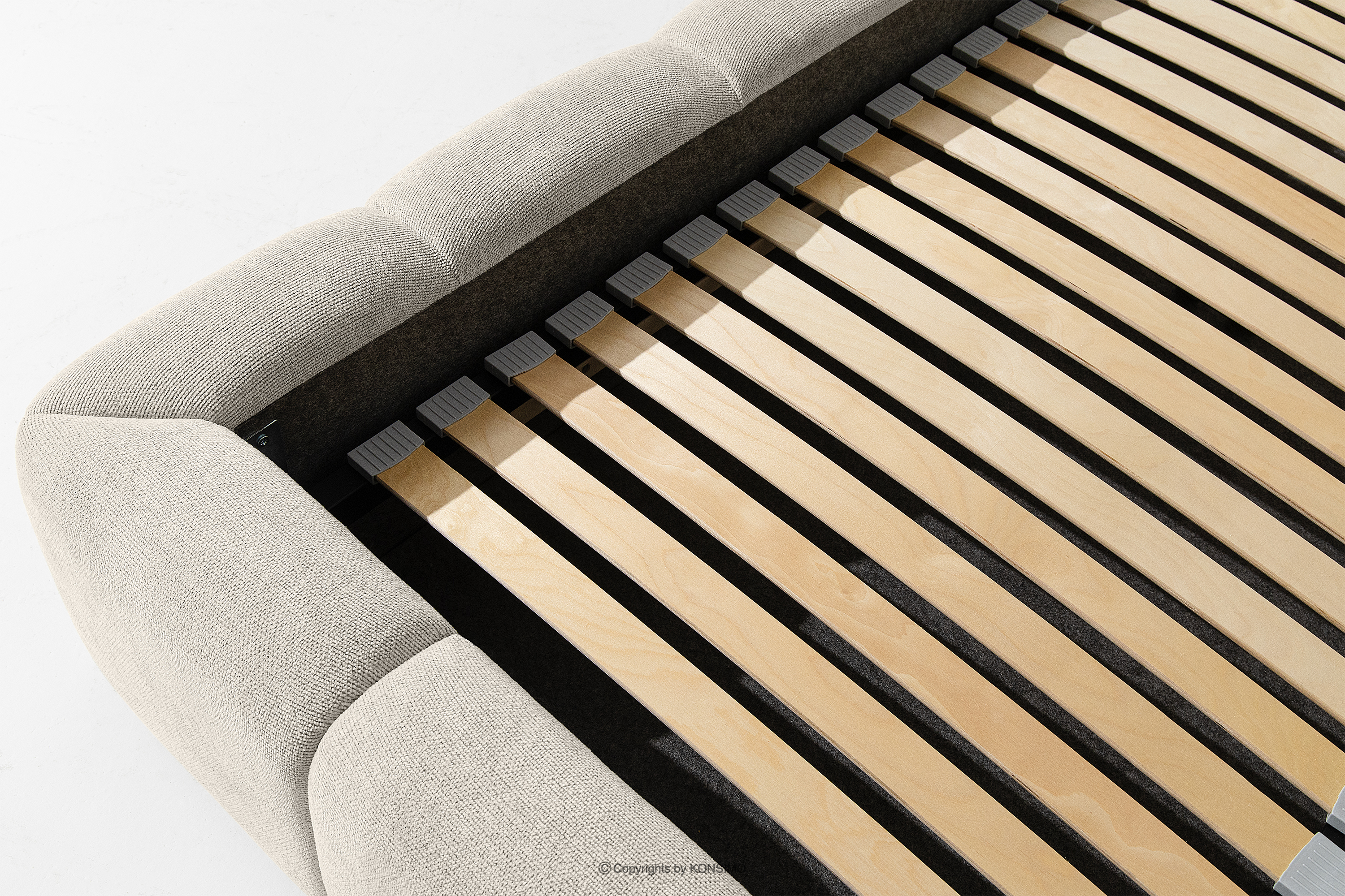 Das Polsterbett mit ecrufarbenem Kopfteil 180 cm ist eine harmonische Kombination aus der Schlichtheit des skandinavischen Stils und außergewöhnlichem Nutzungskomfort. Seine einzigartige Form, die von der Form einer Wolke inspiriert ist, zieht mit ihrem originellen Aussehen die Aufmerksamkeit auf sich und bietet gleichzeitig Komfort auf höchstem Niveau. Die Konstruktion basiert auf einem flexiblen Rahmen aus Holzlatten, dessen zusätzlicher Vorteil die Möglichkeit ist, die Härte des Bettes einzustellen - dank der herausnehmbaren Latten kann man den Grad der Weichheit den individuellen Vorlieben anpassen.