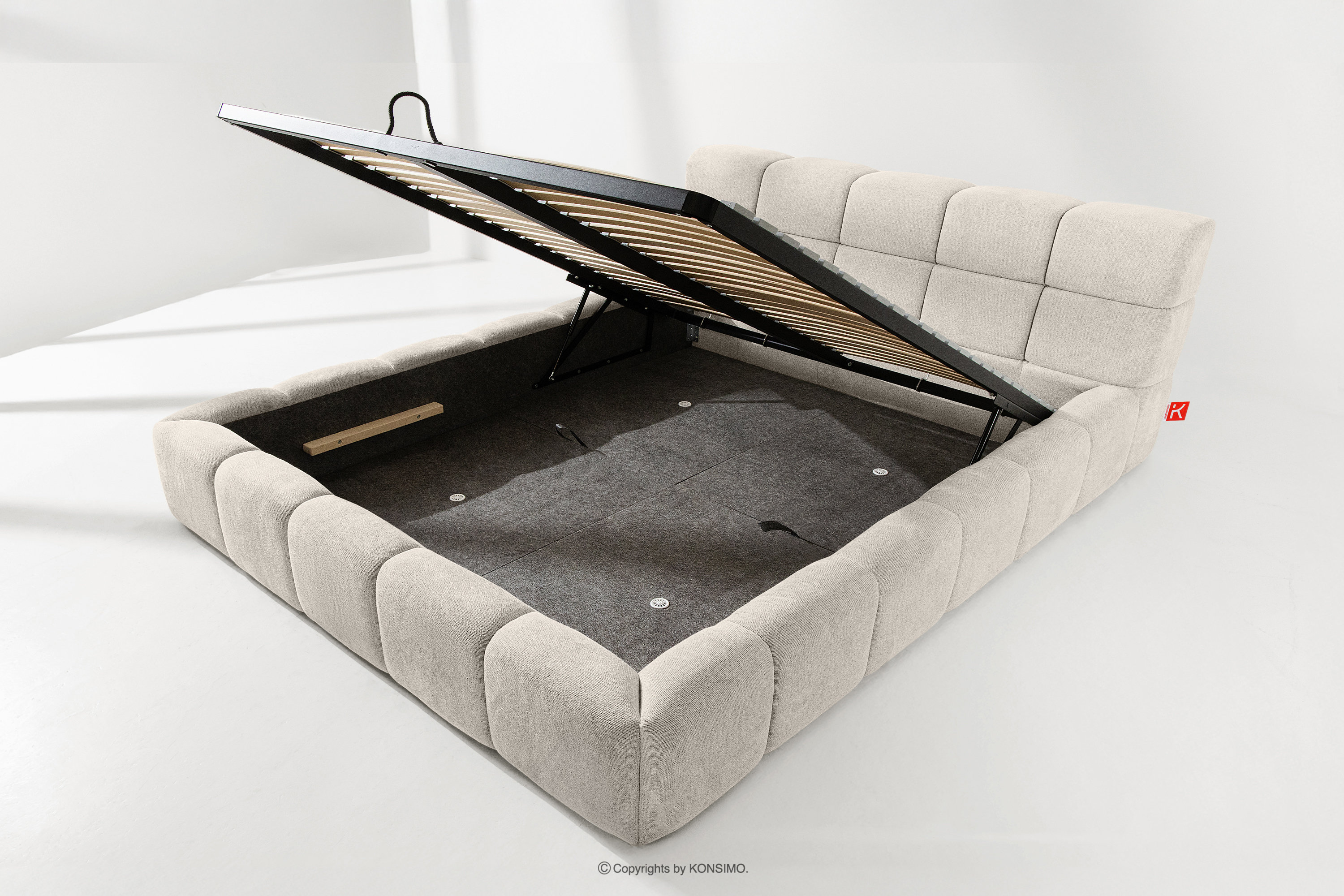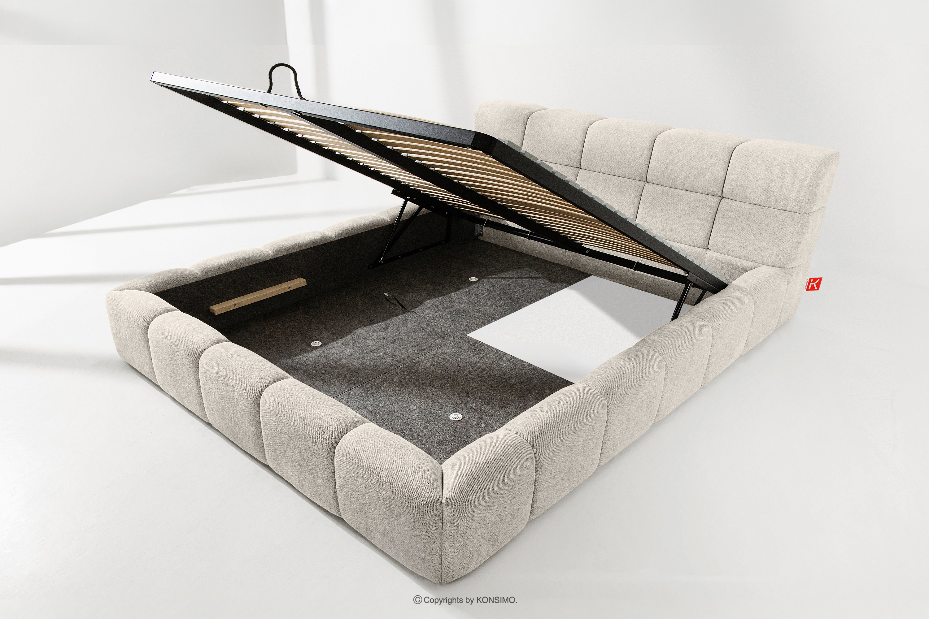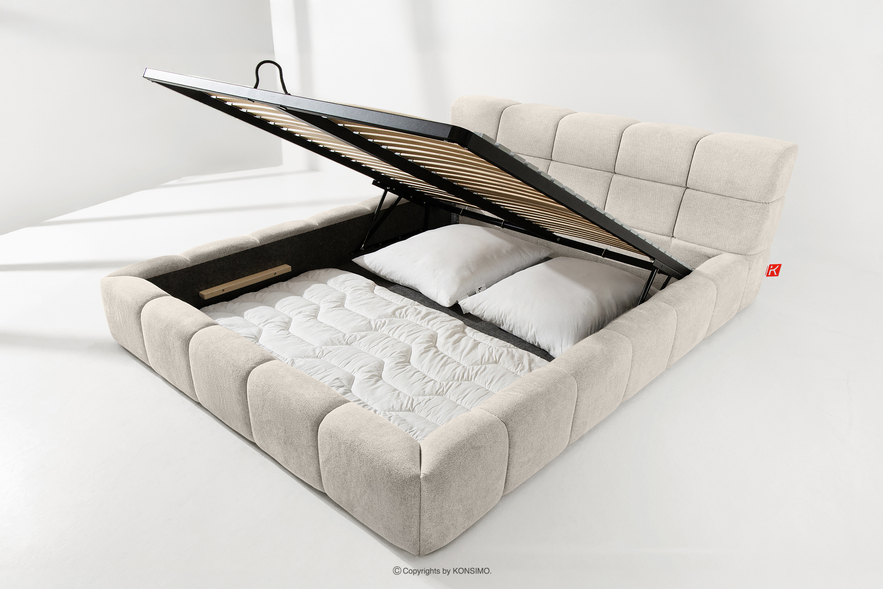 Der praktische Bettkasten, der durch Gasflaschen geöffnet wird, ist eine moderne Lösung, die den Zugriff auf die gelagerten Gegenstände ohne großen Aufwand ermöglicht. Dank der Funktionalität dieses Mechanismus lässt sich der Behälter sanft und leicht öffnen, was den Nutzungskomfort weiter erhöht.