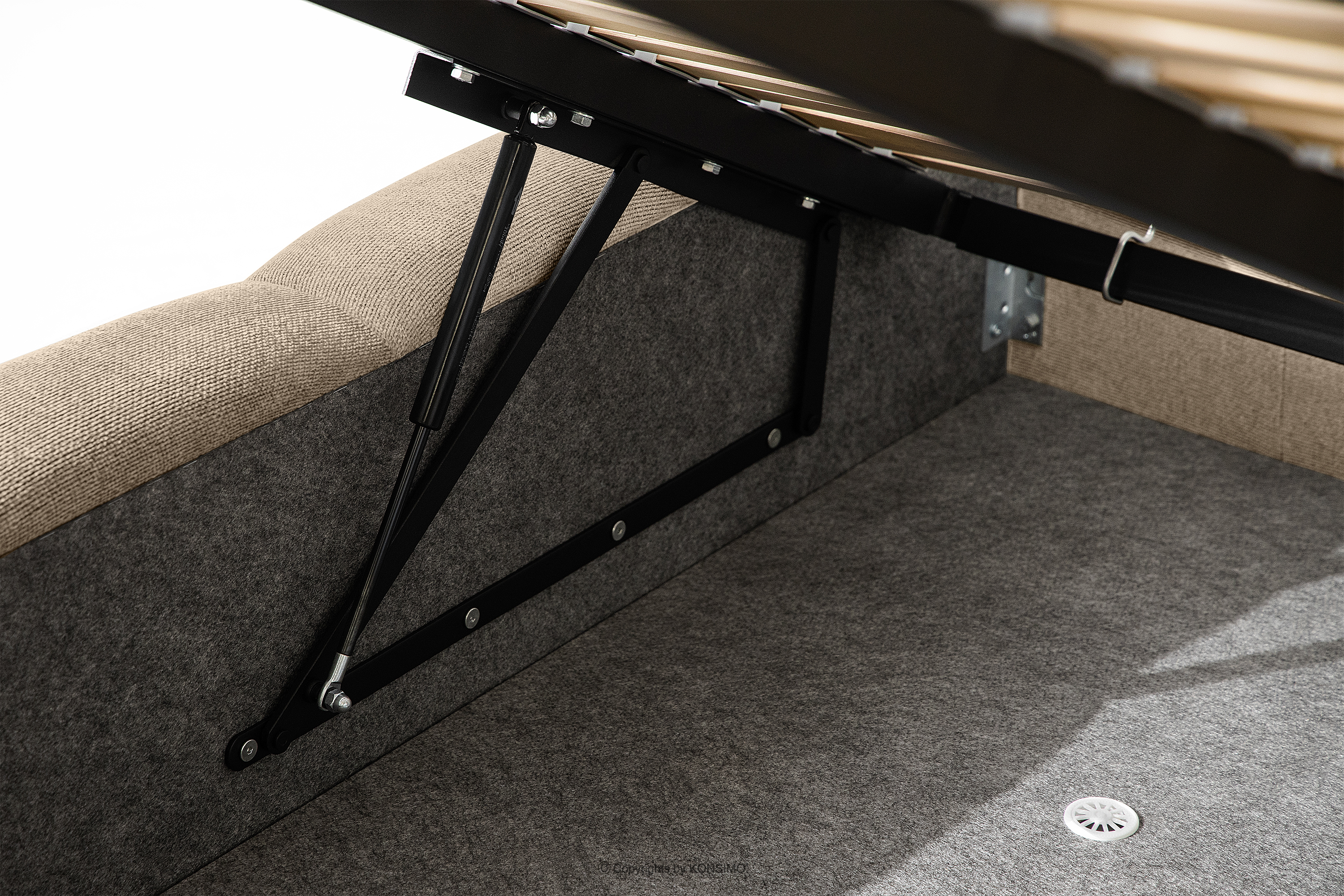 Der praktische Bettkasten, der durch Gasflaschen geöffnet wird, ist eine moderne Lösung, die den Zugriff auf die gelagerten Gegenstände ohne großen Aufwand ermöglicht. Dank der Funktionalität dieses Mechanismus lässt sich der Behälter sanft und leicht öffnen, was den Nutzungskomfort weiter erhöht.
