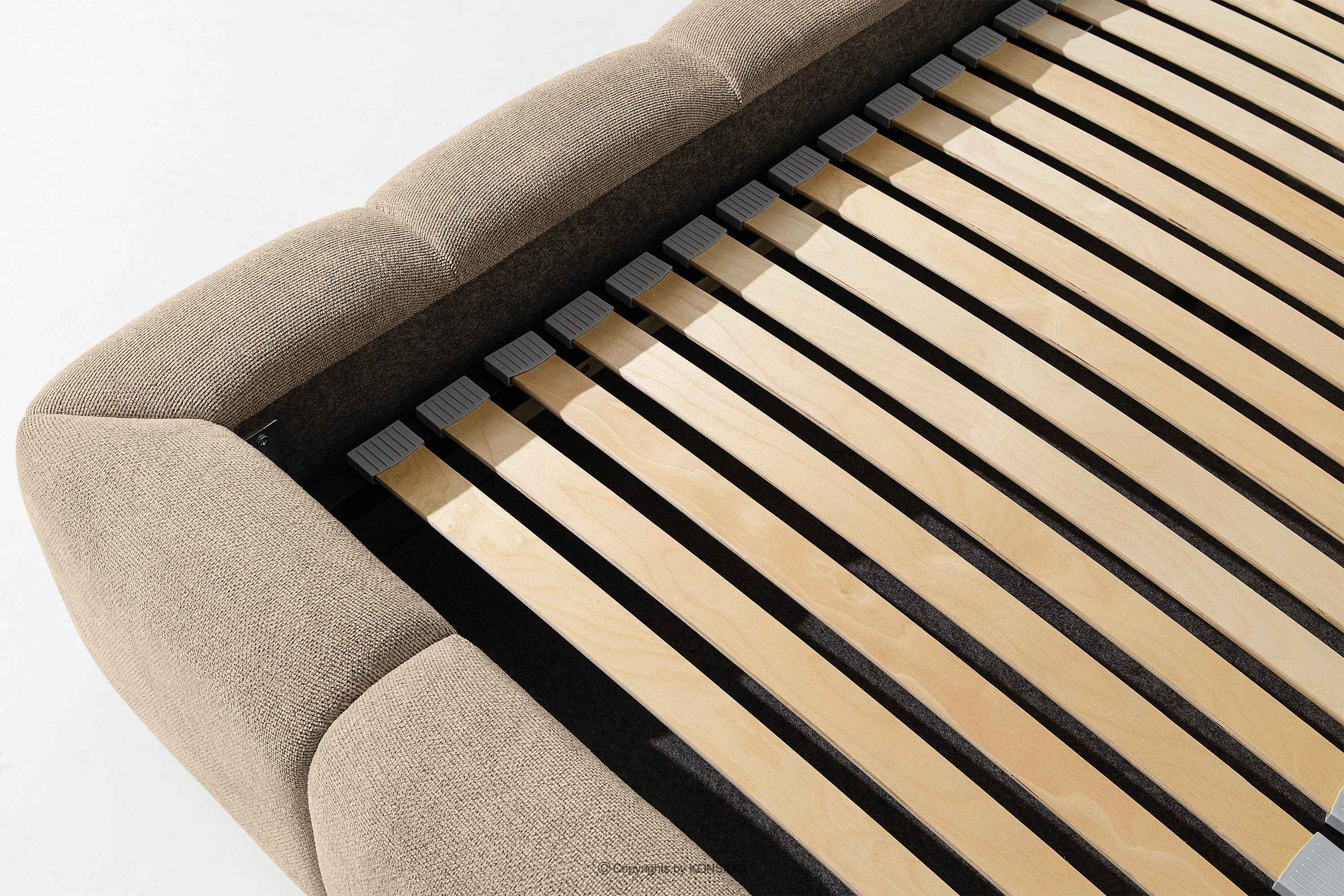 Das Polsterbett mit Kopfteil beige 200 cm ist eine harmonische Kombination aus der Schlichtheit des skandinavischen Stils und außergewöhnlichem Nutzungskomfort. Seine einzigartige Form, inspiriert von der Form einer Wolke, zieht mit seinem originellen Design die Aufmerksamkeit auf sich und bietet gleichzeitig Komfort auf höchstem Niveau. Die Konstruktion basiert auf einem flexiblen Rahmen aus Holzlatten, dessen zusätzlicher Vorteil die Möglichkeit ist, die Härte des Bettes einzustellen - dank der herausnehmbaren Latten kann man den Grad der Weichheit den individuellen Vorlieben anpassen.
