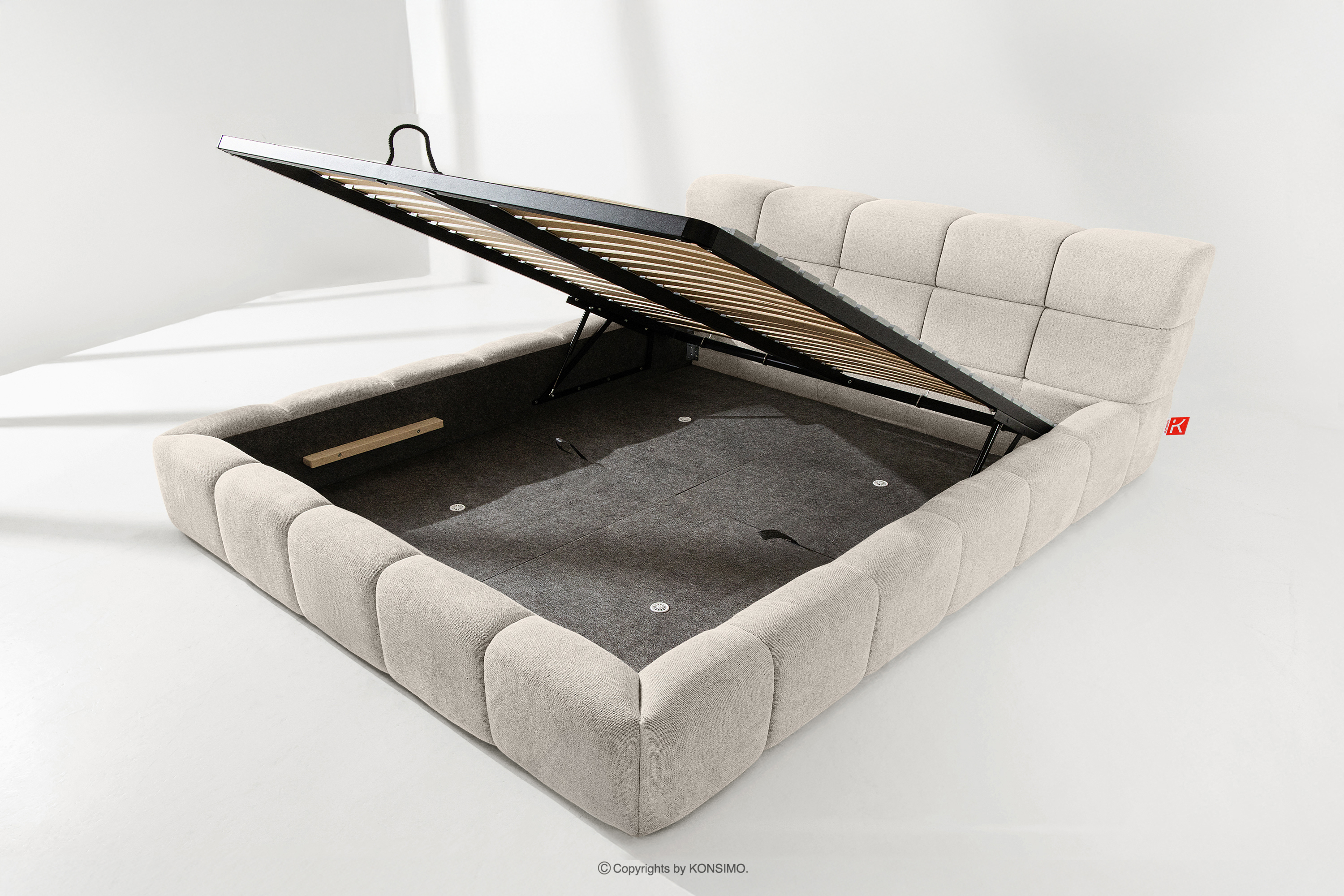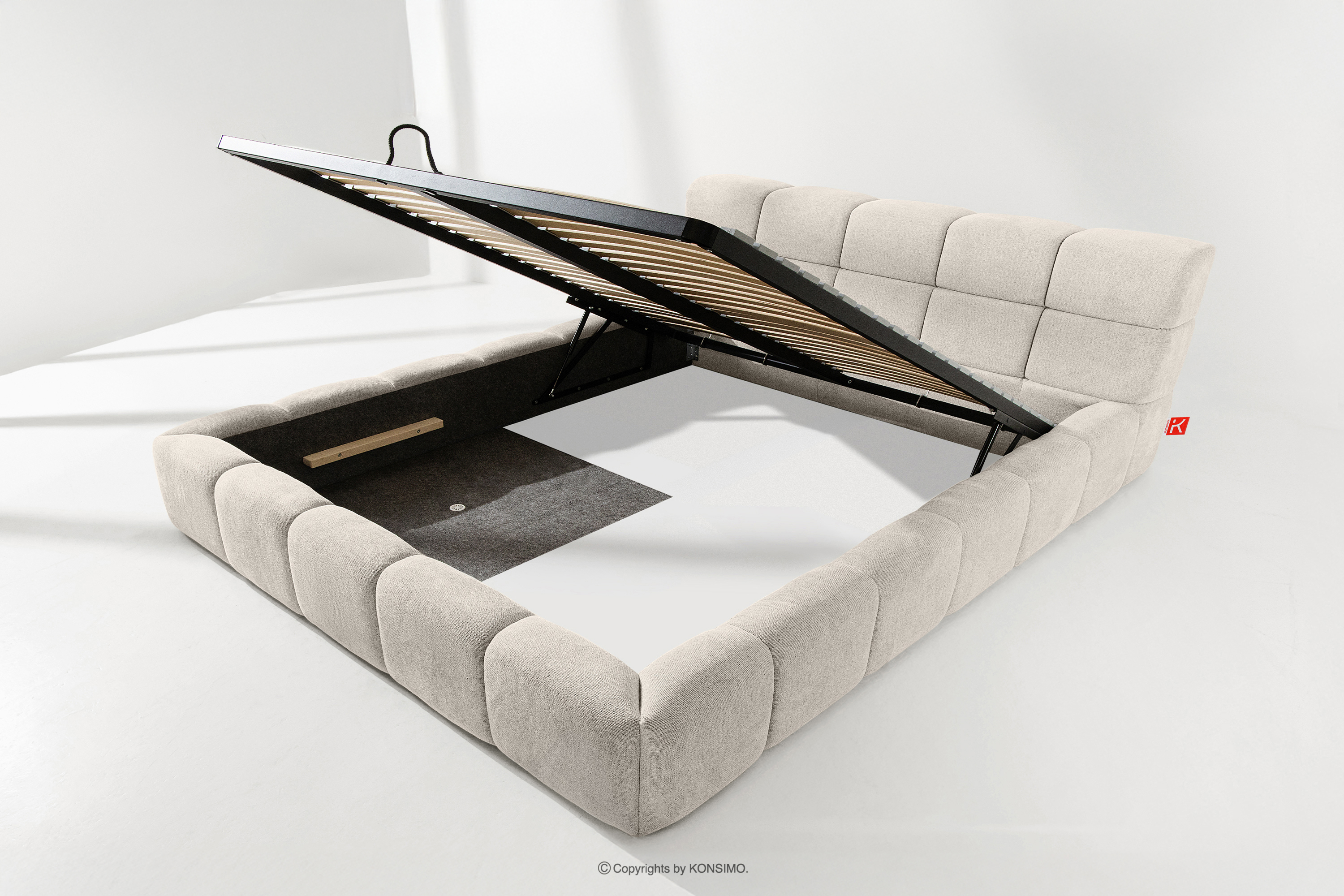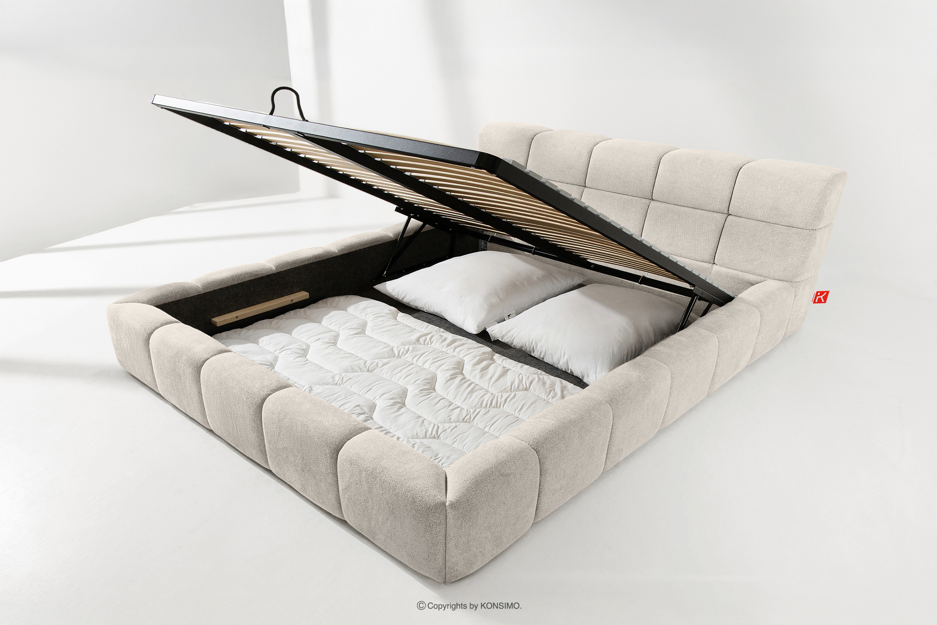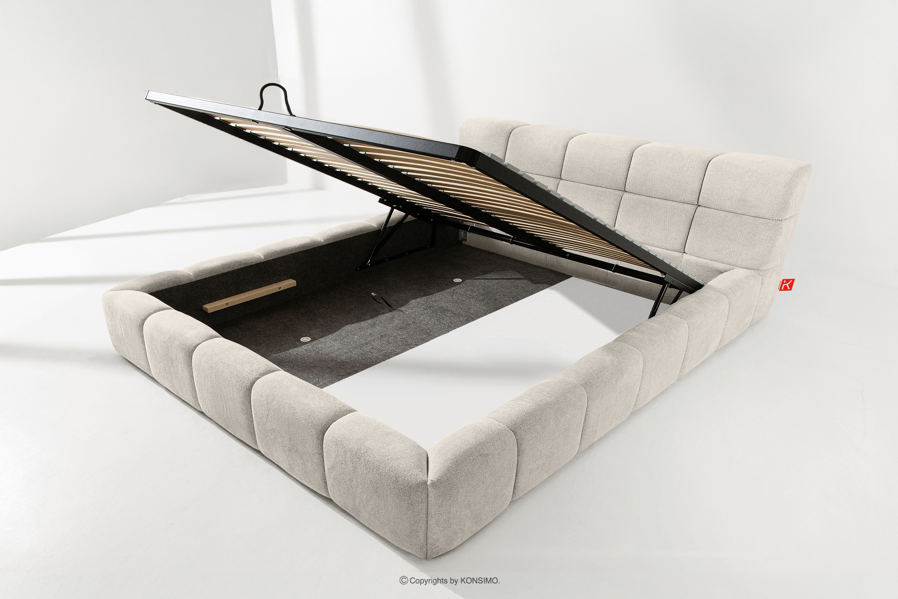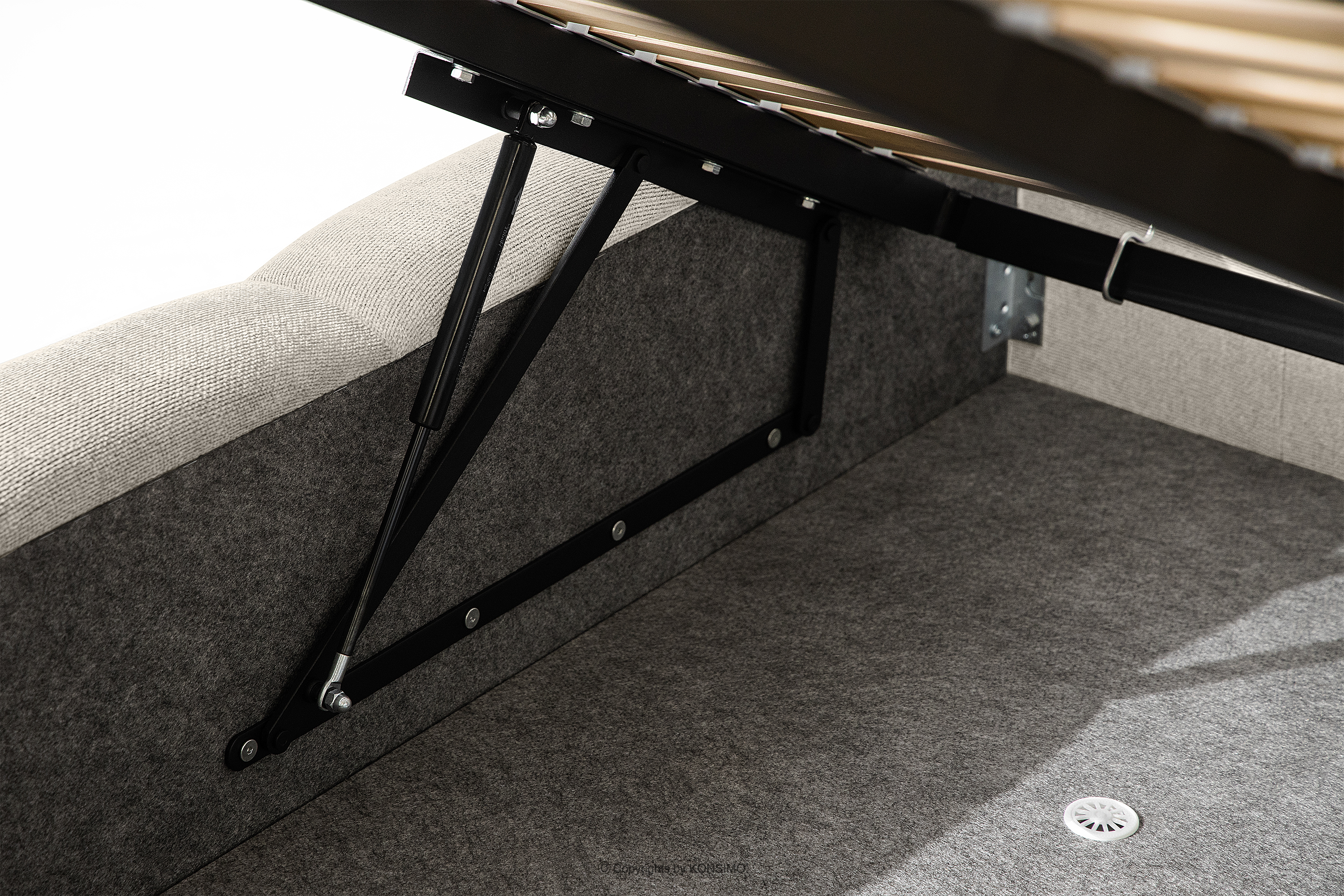 Der praktische Bettkasten, der durch Gasflaschen geöffnet wird, ist eine moderne Lösung, die den Zugriff auf die gelagerten Gegenstände ohne großen Aufwand ermöglicht. Dank der Funktionalität dieses Mechanismus lässt sich der Behälter sanft und leicht öffnen, was den Nutzungskomfort weiter erhöht.