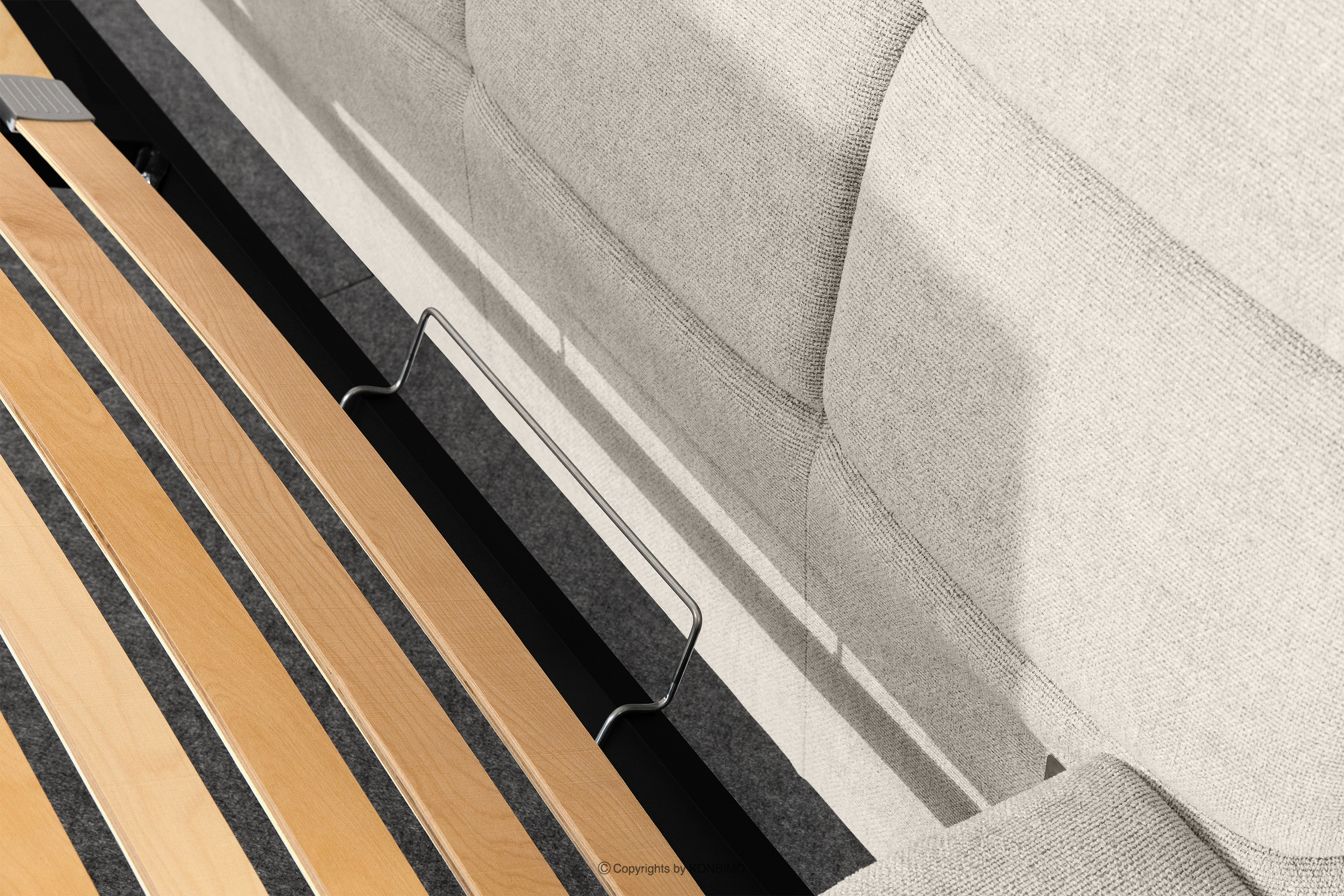 Das Polsterbett mit ecrufarbenem Kopfteil 200 cm ist eine harmonische Kombination aus der Schlichtheit des skandinavischen Stils und außergewöhnlichem Nutzungskomfort. Seine einzigartige Form, die von der Form einer Wolke inspiriert ist, zieht mit ihrem originellen Design die Aufmerksamkeit auf sich und bietet gleichzeitig Komfort auf höchstem Niveau. Die Konstruktion basiert auf einem flexiblen Rahmen aus Holzlatten, dessen zusätzlicher Vorteil die Möglichkeit ist, die Härte des Bettes einzustellen - dank der herausnehmbaren Latten kann man den Grad der Weichheit den individuellen Vorlieben anpassen.