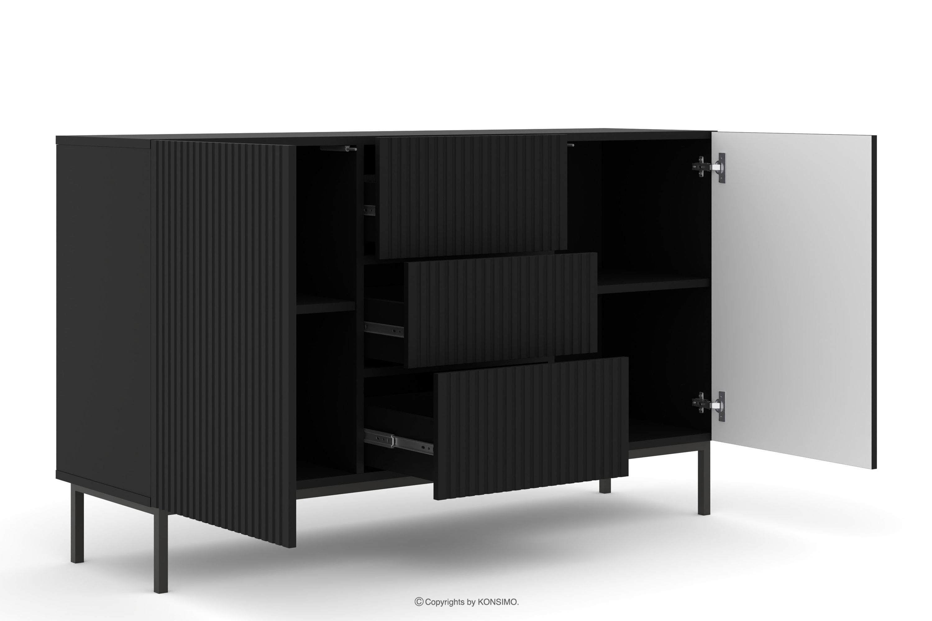Die elegante schwarze Wohnzimmerkommode mit den schwarzen Beinen ist eine Kombination aus außergewöhnlichem Design, solider Verarbeitung und Funktionalität. Sie wurde für Menschen geschaffen, die Wert auf Ästhetik und Komfort im täglichen Gebrauch legen. Schlichte, minimalistische Formen, angereichert mit subtilen Details, entsprechen den neuesten Trends in der Inneneinrichtung und fügen sich harmonisch in eine Vielzahl von Arrangements ein.