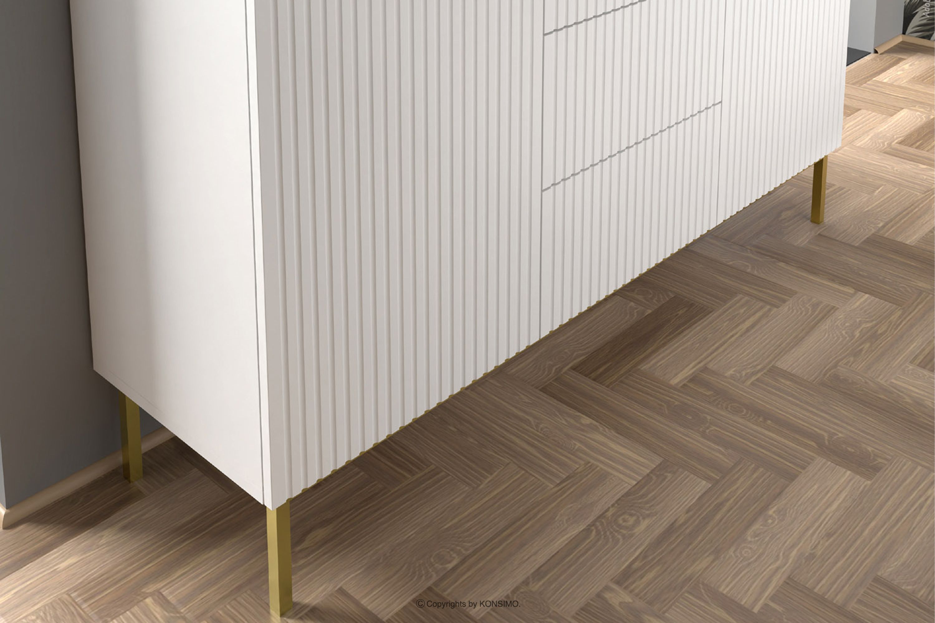 Die elegante weiße Kommode auf goldenen Füßen ist eine Kombination aus außergewöhnlichem Design, solider Verarbeitung und Funktionalität. Sie wurde für Menschen geschaffen, die Wert auf Ästhetik und Komfort im täglichen Gebrauch legen. Schlichte, minimalistische Formen, die mit subtilen Details angereichert sind, entsprechen den neuesten Einrichtungstrends und fügen sich harmonisch in eine Vielzahl von Arrangements ein.