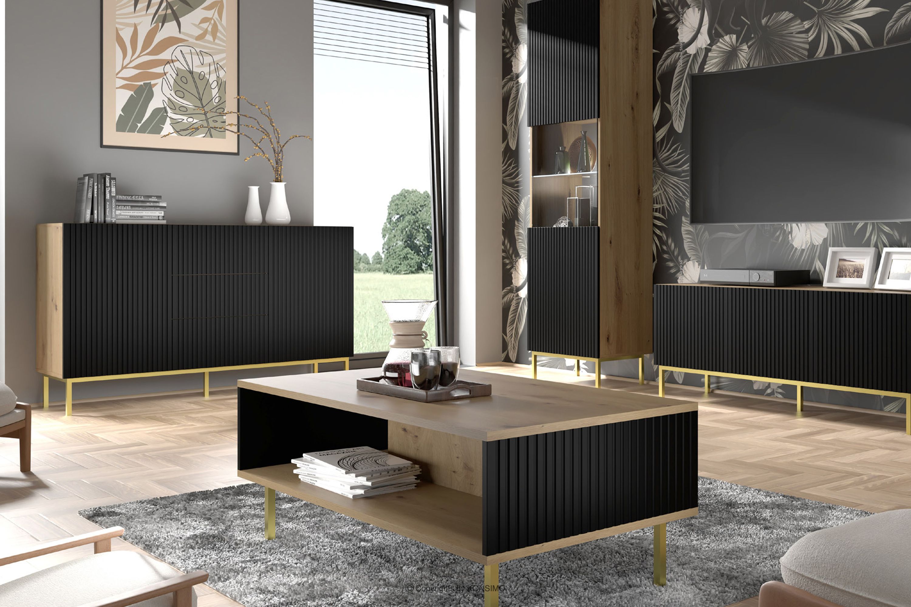 Die elegante Kommode auf goldenen Beinen Eiche artisan/schwarz ist eine Kombination aus außergewöhnlichem Design, solider Verarbeitung und Funktionalität. Sie wurde für Menschen geschaffen, die Wert auf Ästhetik und Komfort im täglichen Gebrauch legen. Schlichte, minimalistische Formen, angereichert mit subtilen Details, entsprechen den neuesten Trends in der Inneneinrichtung und fügen sich harmonisch in eine Vielzahl von Arrangements ein.