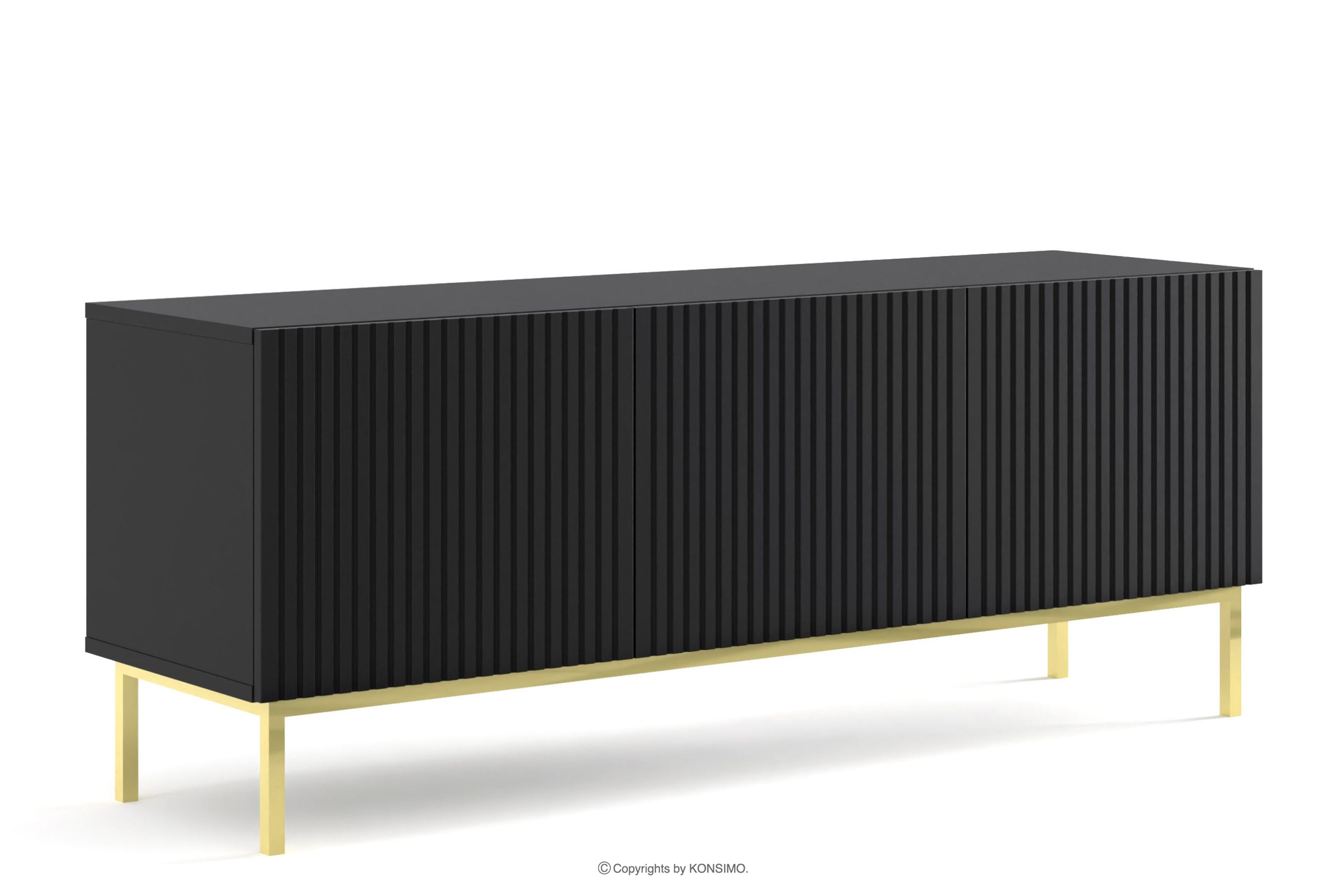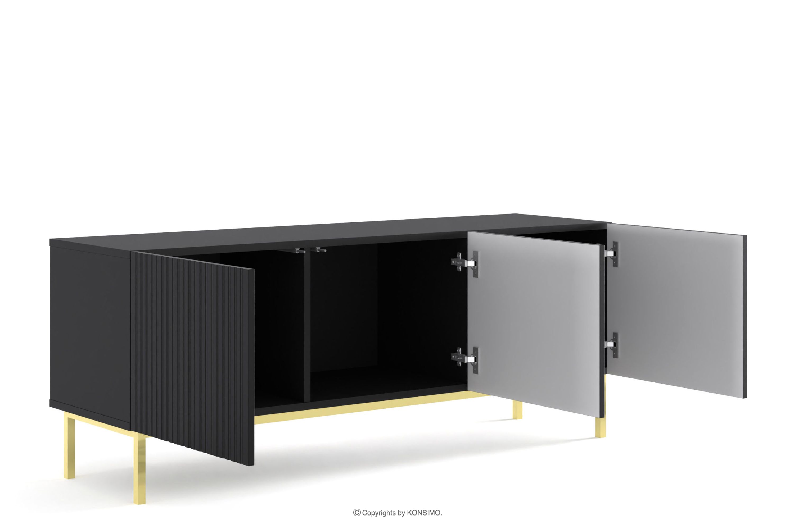 Der große RTV-Schrank auf goldenen Beinen schwarz ist eine Kombination aus außergewöhnlichem Design, solider Verarbeitung und Funktionalität. Er wurde für Menschen geschaffen, die Wert auf Ästhetik und Komfort im täglichen Gebrauch legen. Schlichte, minimalistische Formen, die mit subtilen Details angereichert sind, entsprechen den neuesten Trends in der Inneneinrichtung und fügen sich harmonisch in eine Vielzahl von Arrangements ein.