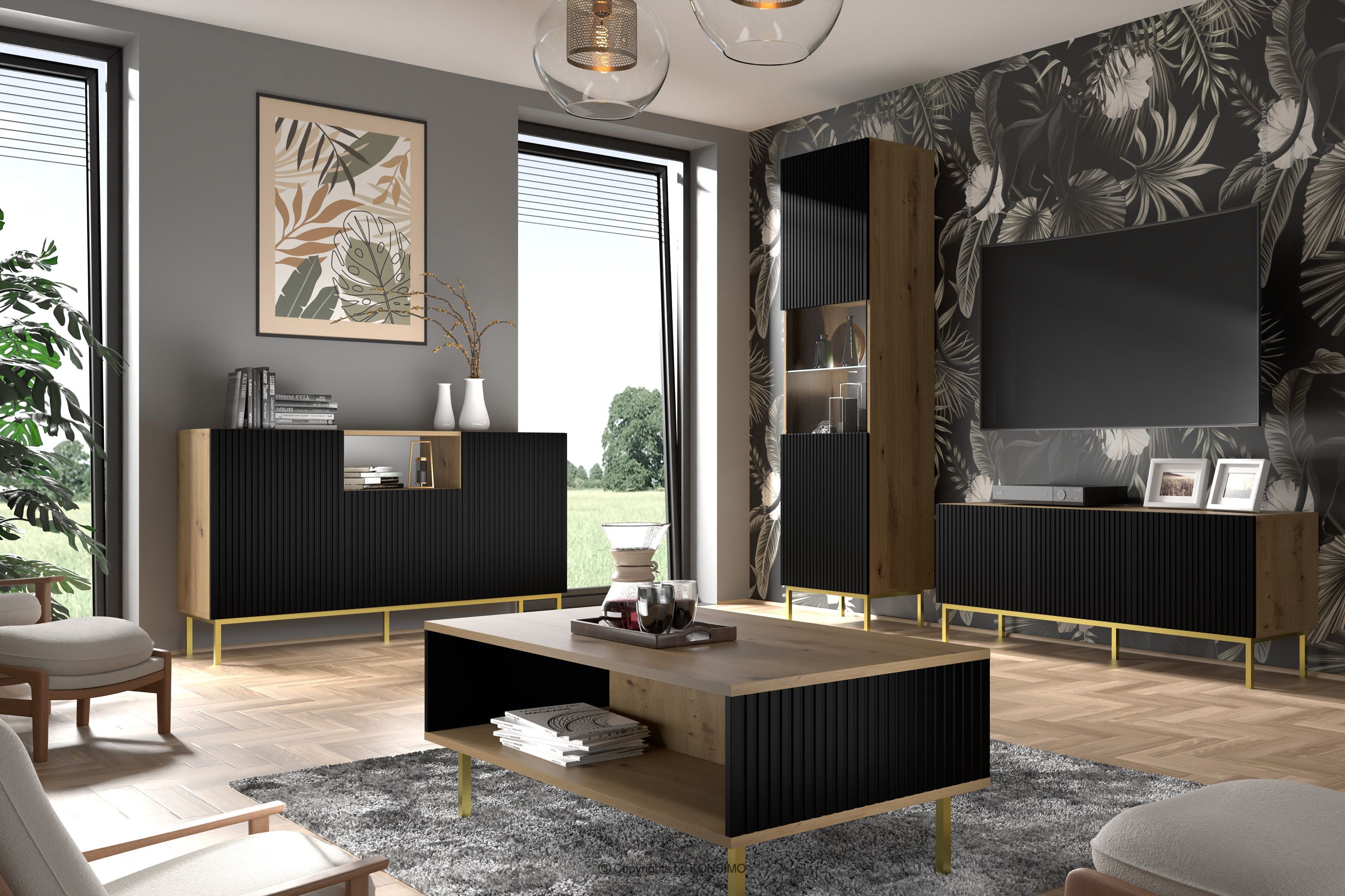 Der große RTV-Schrank auf Beinen aus schwarzer Eiche artisan/schwarz ist eine Kombination aus außergewöhnlichem Design, solider Verarbeitung und Funktionalität. Er wurde für Menschen geschaffen, die Wert auf Ästhetik und Komfort im täglichen Gebrauch legen. Schlichte, minimalistische Formen, angereichert mit subtilen Details, entsprechen den neuesten Trends in der Inneneinrichtung und fügen sich harmonisch in eine Vielzahl von Arrangements ein.