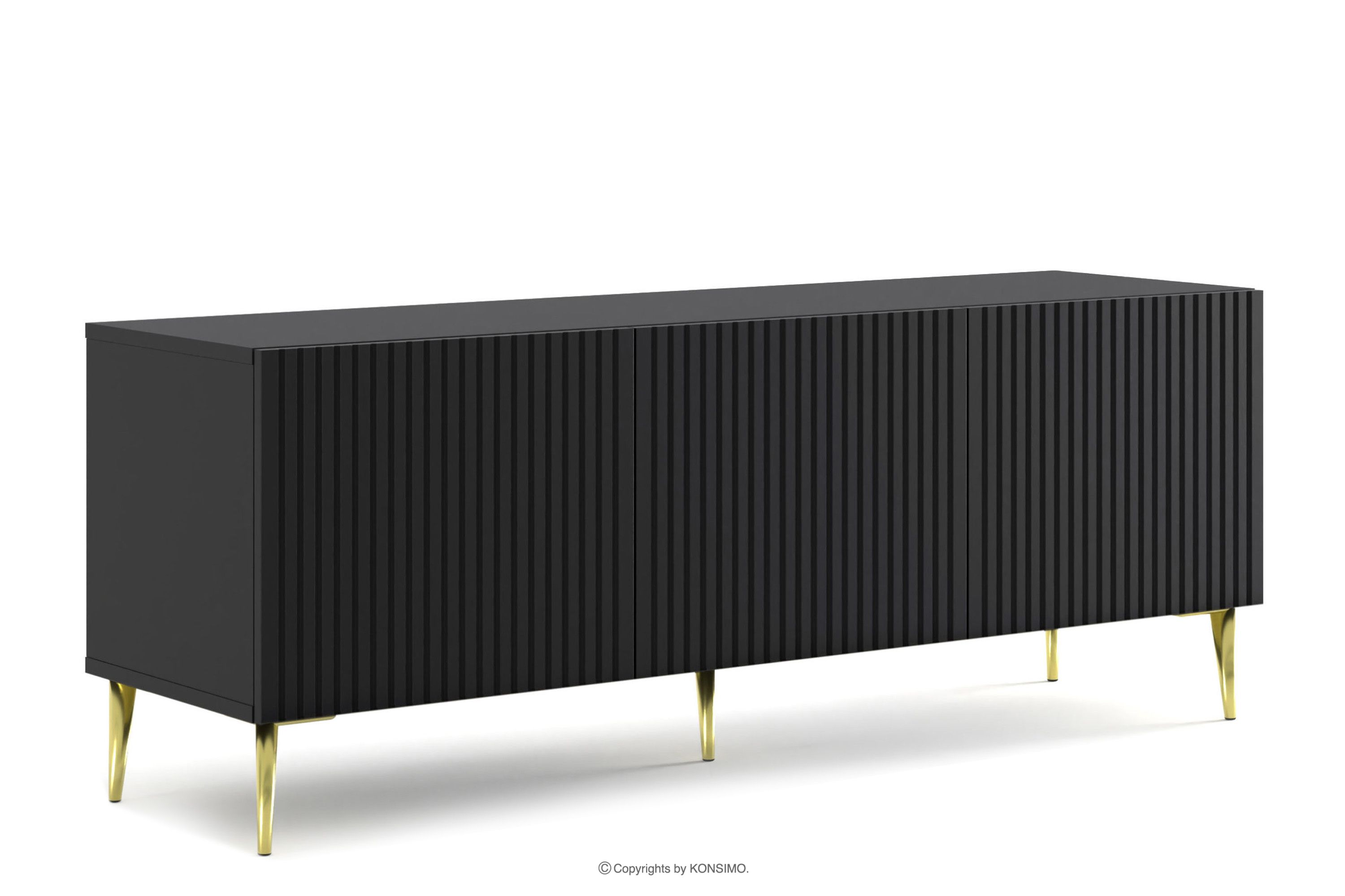 Der breite RTV-Schrank auf goldenen Beinen schwarz ist eine Kombination aus außergewöhnlichem Design, solider Verarbeitung und Funktionalität. Er wurde für Menschen geschaffen, die Wert auf Ästhetik und Komfort im täglichen Gebrauch legen. Schlichte, minimalistische Formen, die mit subtilen Details angereichert sind, entsprechen den neuesten Trends in der Inneneinrichtung und fügen sich harmonisch in eine Vielzahl von Arrangements ein.