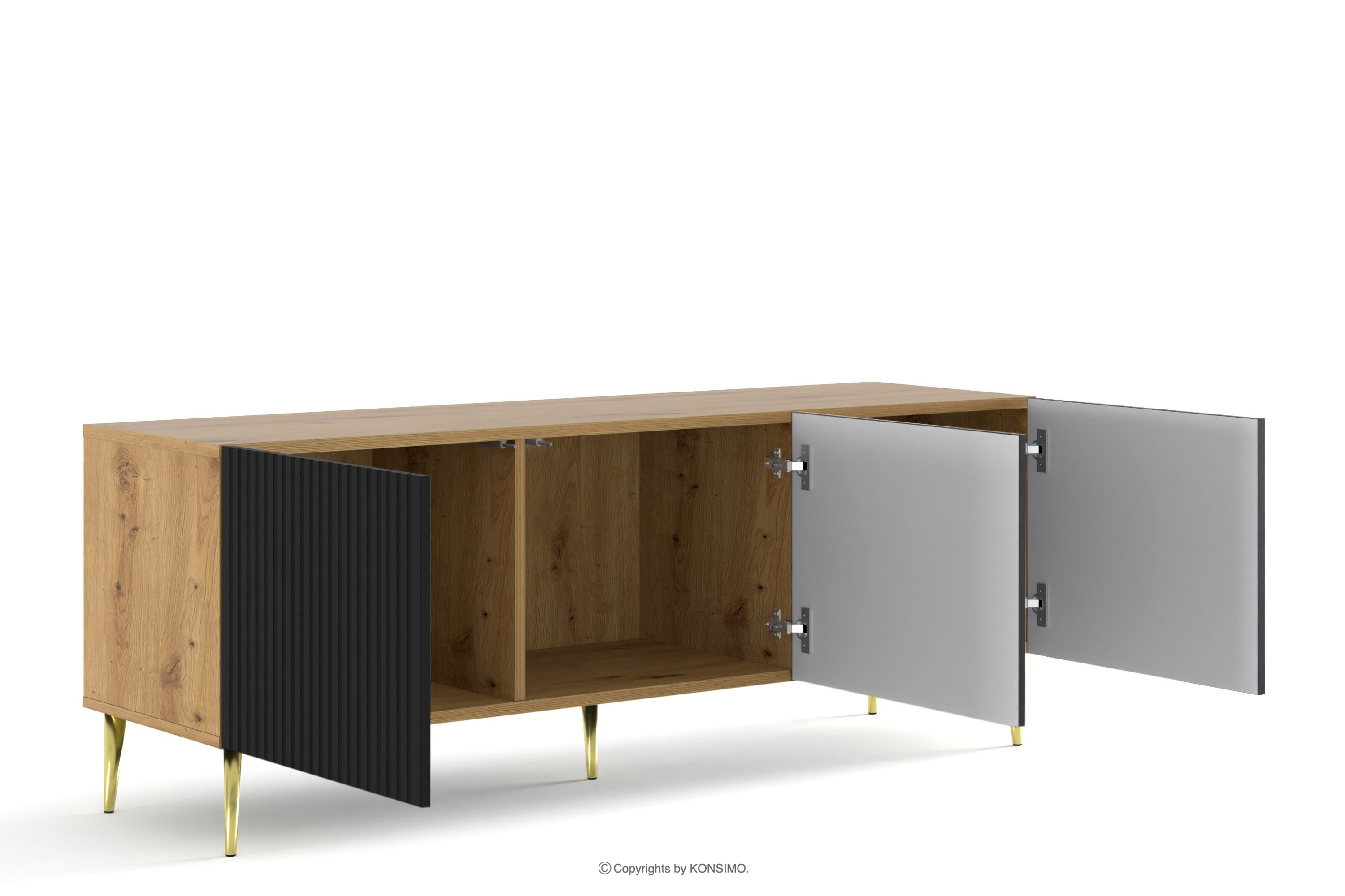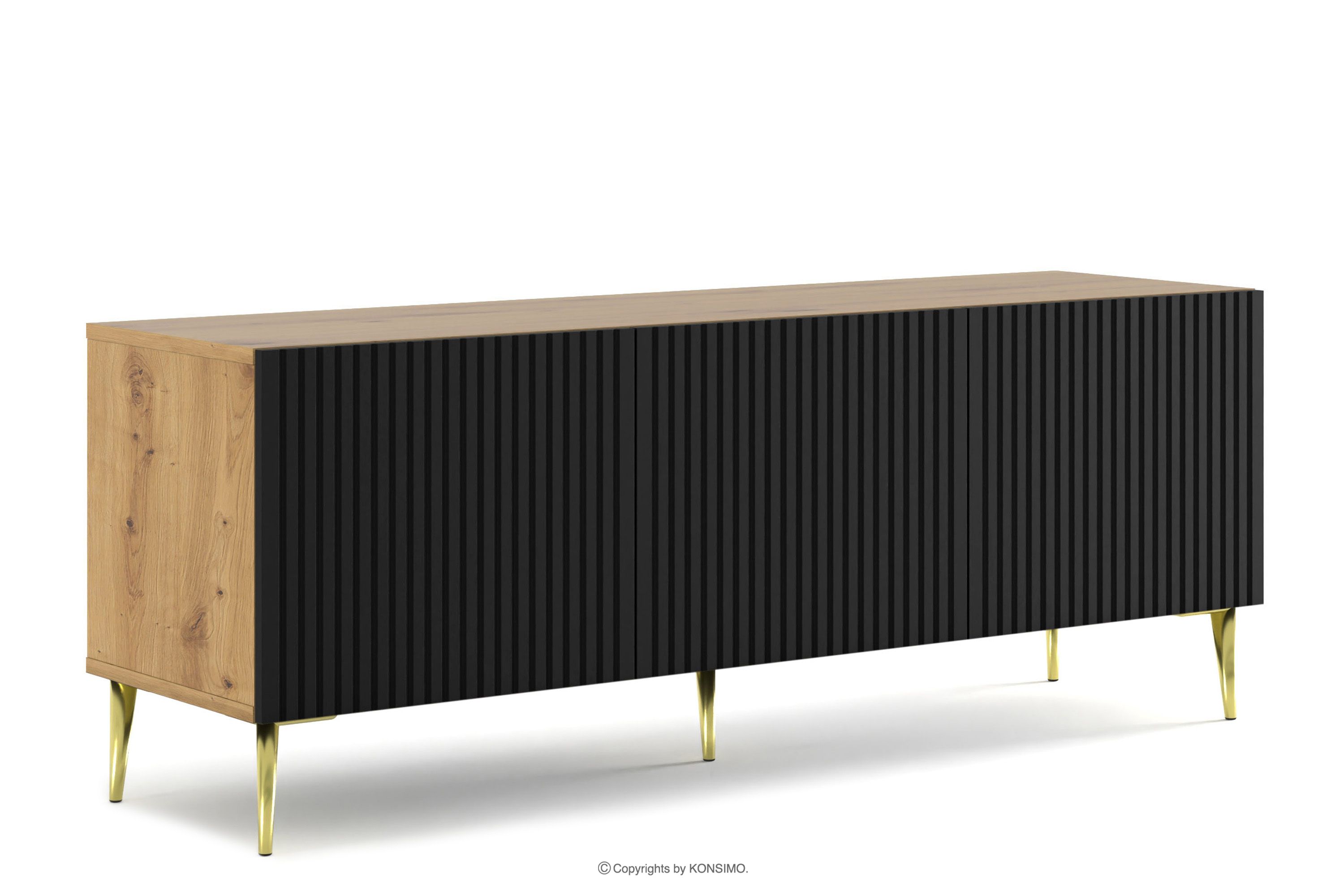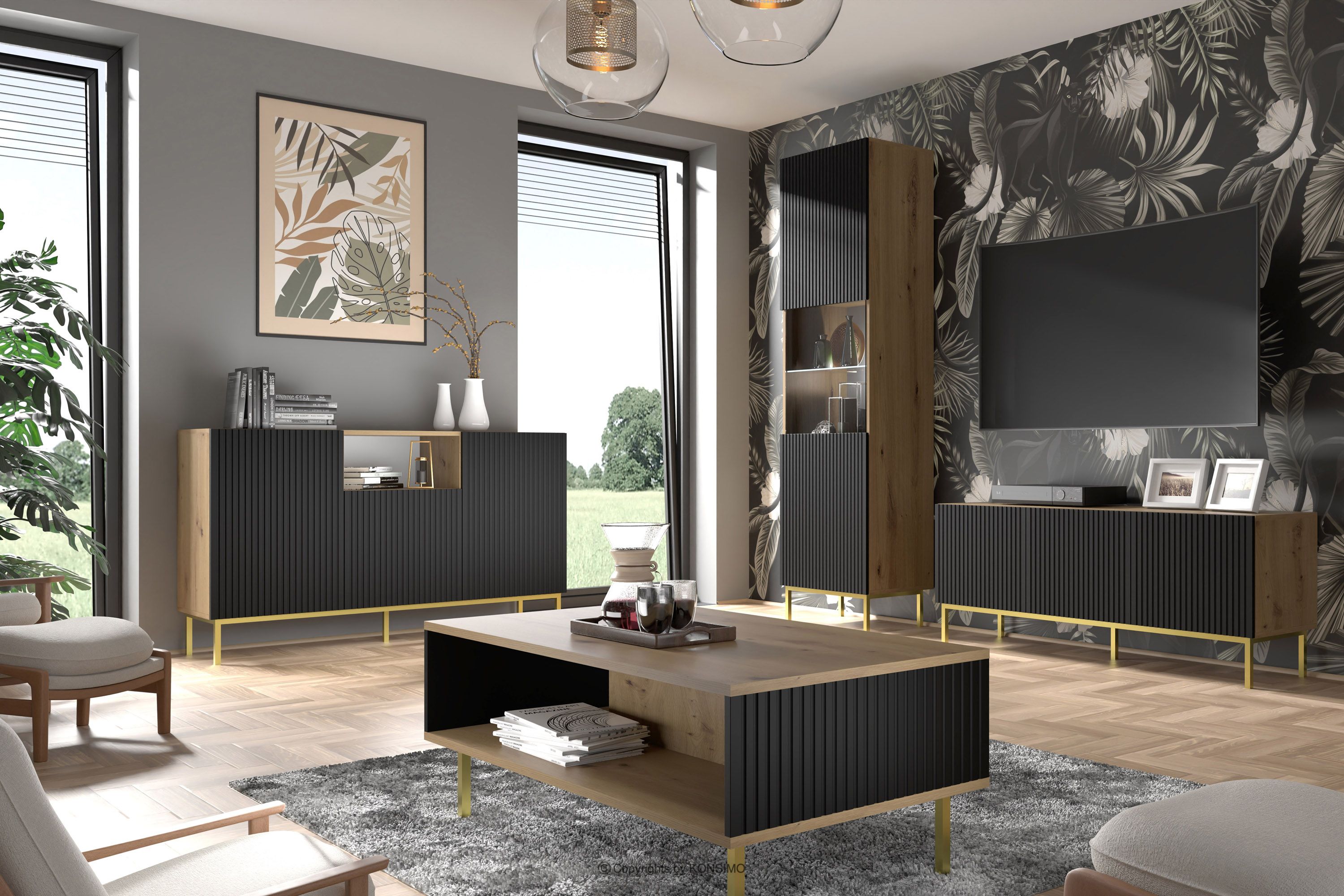 Der breite RTV-Schrank auf goldenen Beinen Eiche artisan/schwarz ist eine Kombination aus außergewöhnlichem Design, solider Verarbeitung und Funktionalität. Er wurde für Menschen geschaffen, die Wert auf Ästhetik und Komfort im täglichen Gebrauch legen. Schlichte, minimalistische Formen, angereichert mit subtilen Details, entsprechen den neuesten Trends in der Inneneinrichtung und fügen sich harmonisch in eine Vielzahl von Arrangements ein.