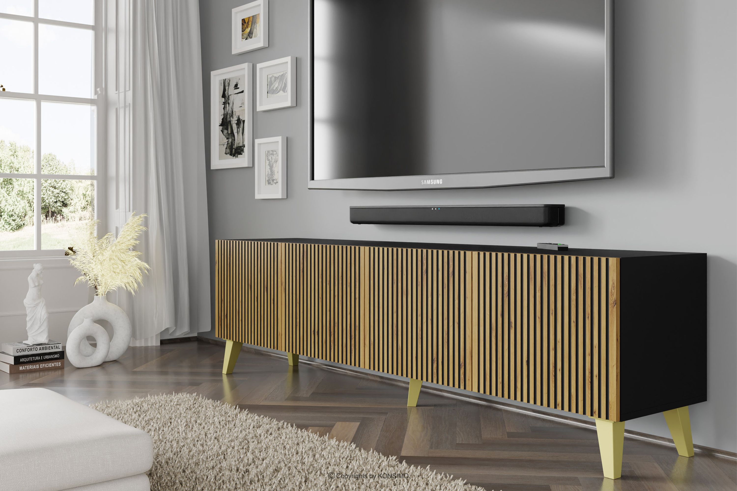 Der RTV-Schrank artisan black/oak verbindet außergewöhnliches Design, solide Verarbeitung und Funktionalität. Er wurde für Menschen geschaffen, die Wert auf Ästhetik und Komfort im täglichen Gebrauch legen. Schlichte, minimalistische Formen, die mit subtilen Details angereichert sind, entsprechen den neuesten Trends in der Inneneinrichtung und fügen sich harmonisch in eine Vielzahl von Arrangements ein.