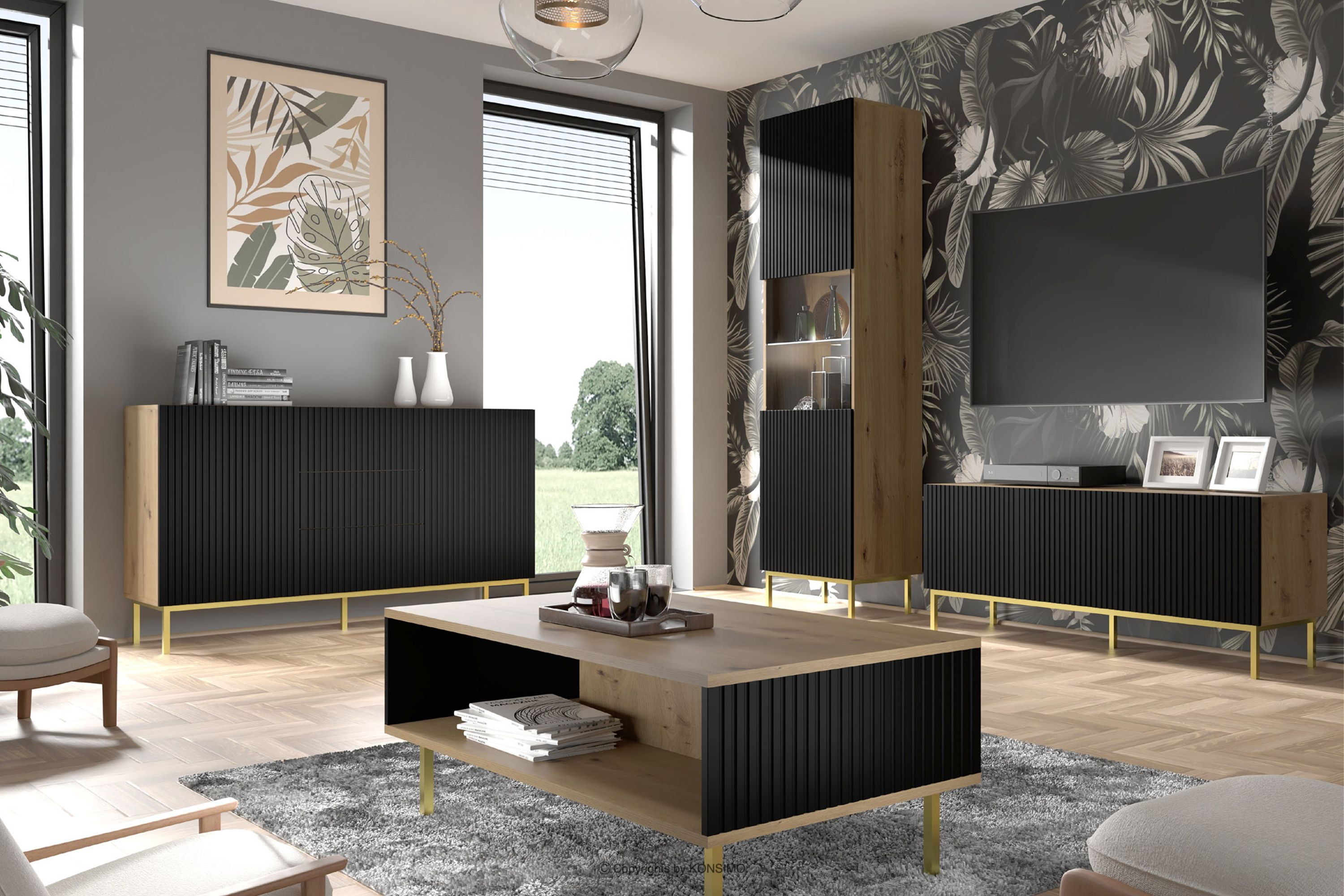 Der 200cm RTV-Schrank für TV Eiche artisan/schwarz ist eine Kombination aus außergewöhnlichem Design, solider Verarbeitung und Funktionalität. Er wurde für Menschen geschaffen, die Wert auf Ästhetik und Komfort im täglichen Gebrauch legen. Schlichte, minimalistische Formen, die mit subtilen Details angereichert sind, entsprechen den neuesten Trends in der Inneneinrichtung und fügen sich harmonisch in eine Vielzahl von Arrangements ein.