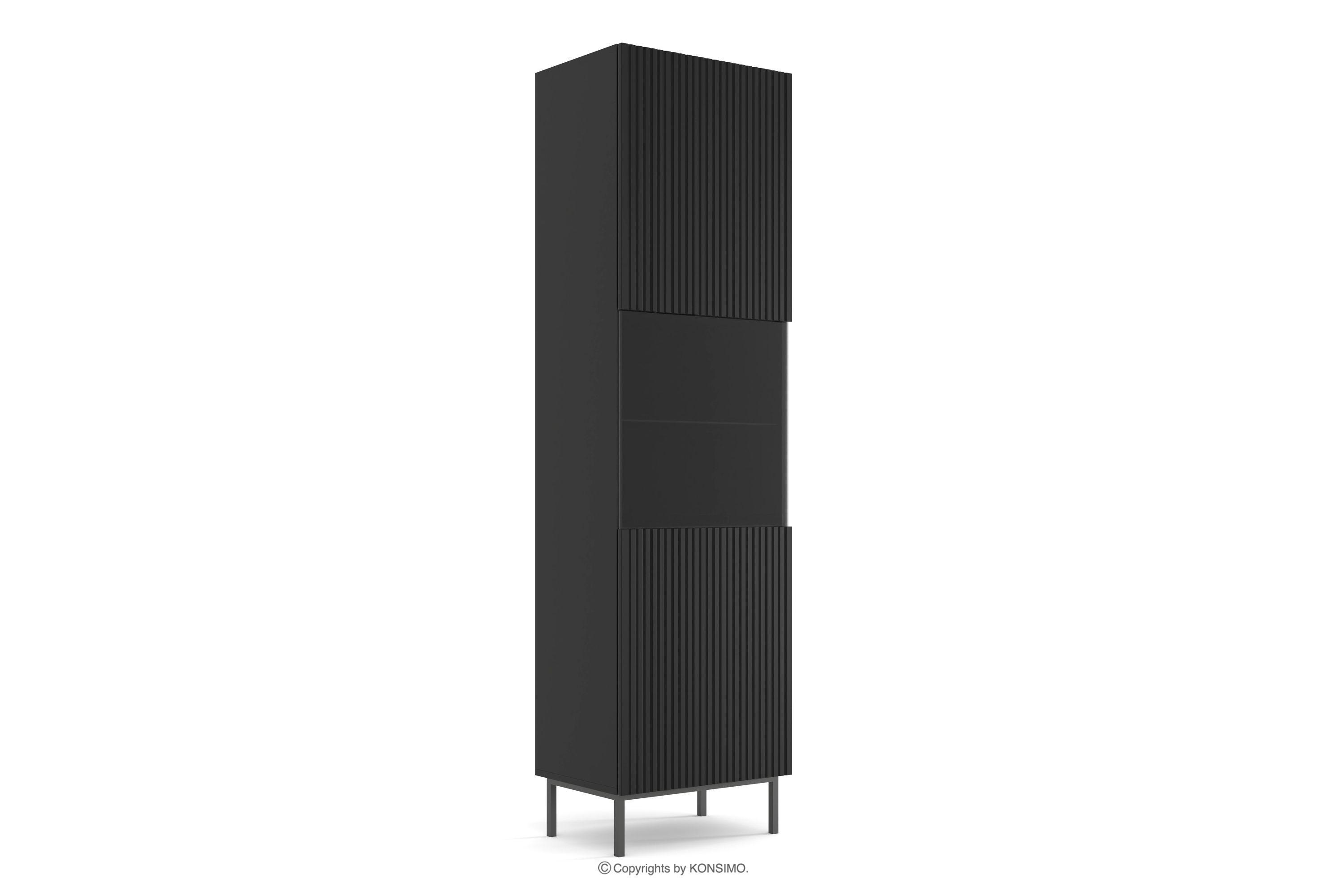 Die schwarze Vitrine auf hohen schwarzen Beinen ist eine Kombination aus außergewöhnlichem Design, solider Verarbeitung und Funktionalität. Sie wurde für Menschen geschaffen, die Wert auf Ästhetik und Komfort im täglichen Gebrauch legen. Schlichte, minimalistische Formen, die mit subtilen Details angereichert sind, entsprechen den neuesten Trends in der Inneneinrichtung und fügen sich harmonisch in eine Vielzahl von Arrangements ein.