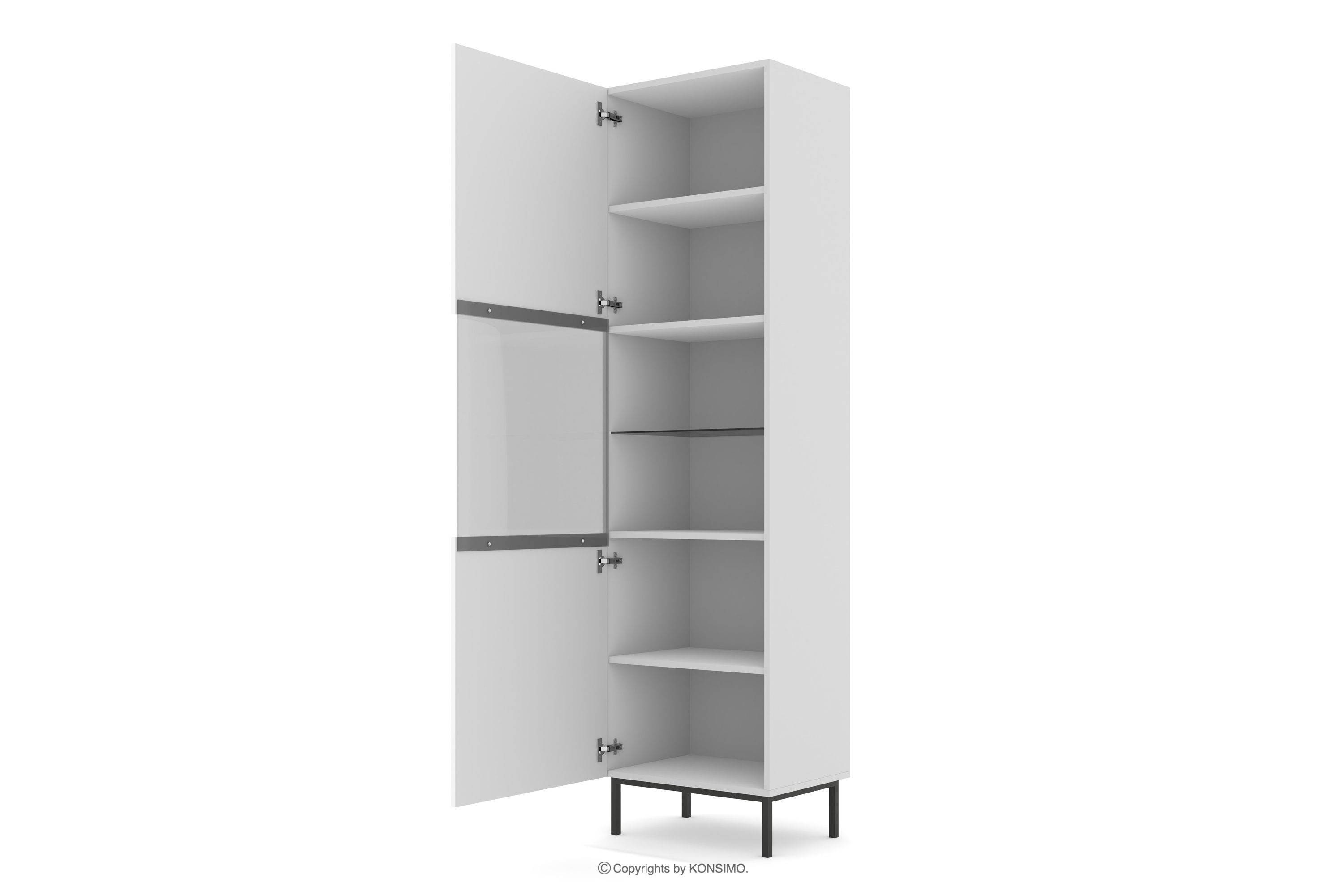 Die weiße Vitrine auf hohen schwarzen Beinen ist eine Kombination aus außergewöhnlichem Design, solider Verarbeitung und Funktionalität. Sie wurde für Menschen geschaffen, die Wert auf Ästhetik und Komfort im täglichen Gebrauch legen. Schlichte, minimalistische Formen, die mit subtilen Details angereichert sind, entsprechen den neuesten Trends in der Inneneinrichtung und fügen sich harmonisch in eine Vielzahl von Arrangements ein.