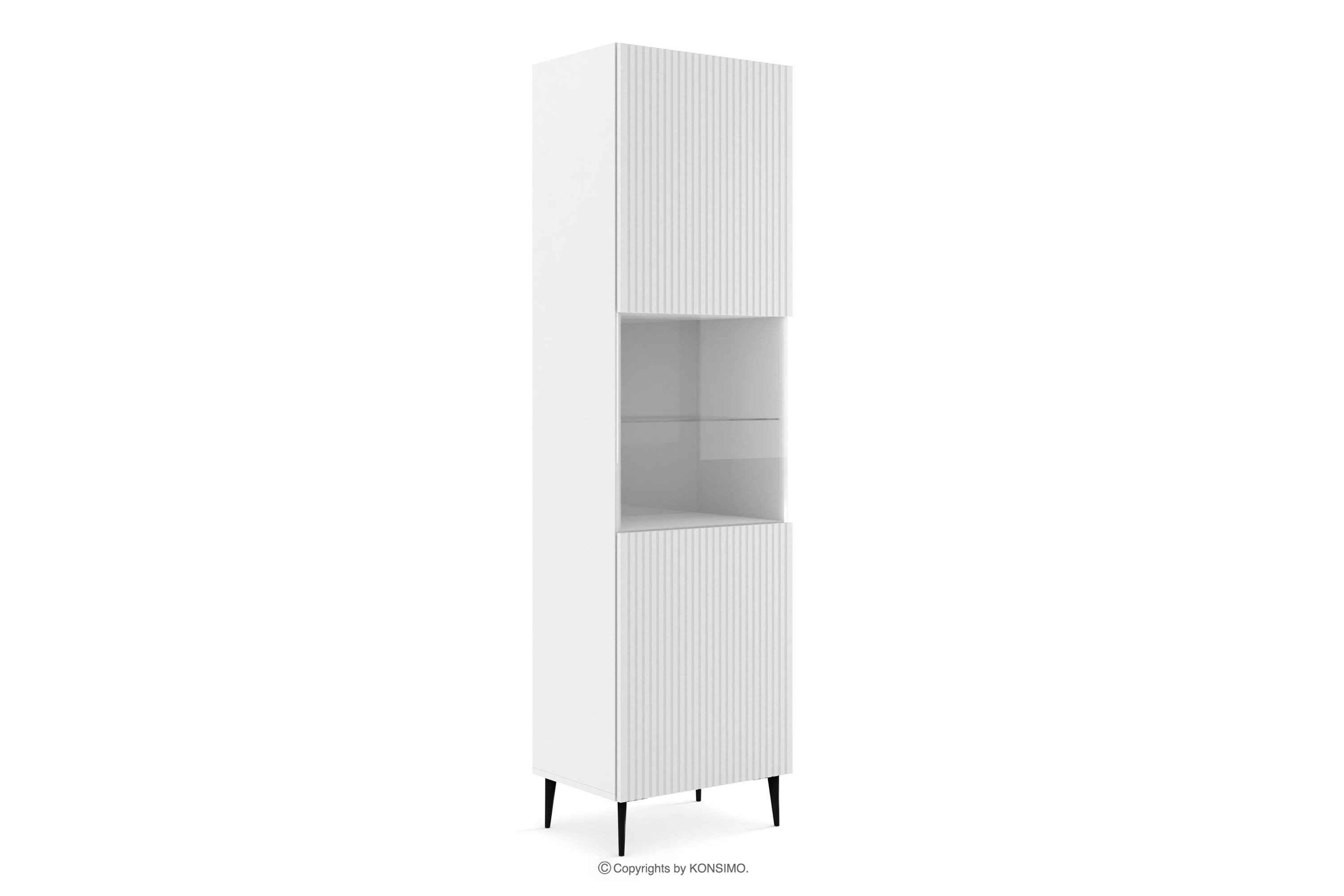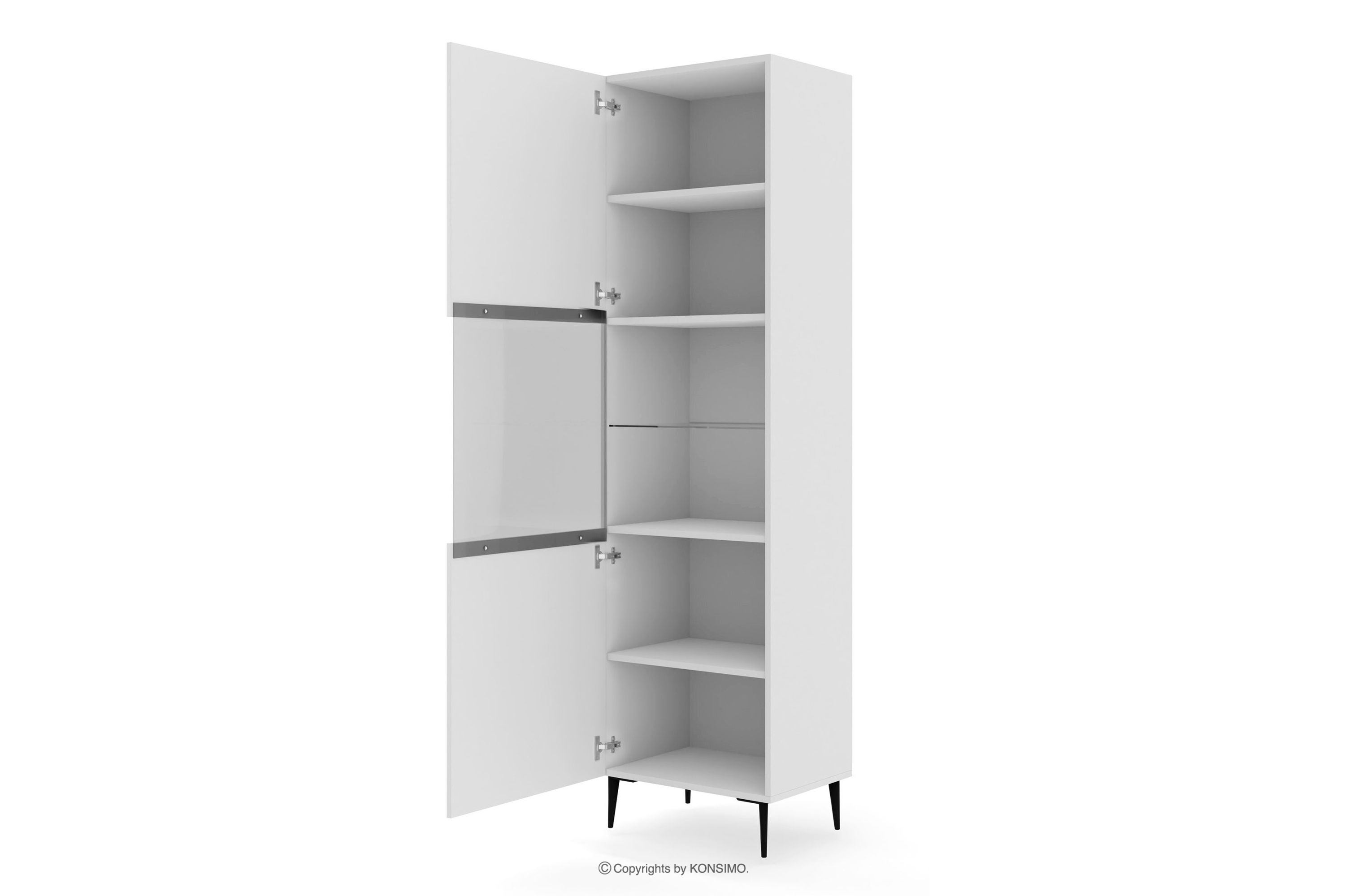 Die Vitrine auf hohen schwarzen Beinen weiß ist eine Kombination aus außergewöhnlichem Design, solider Verarbeitung und Funktionalität. Sie wurden für Menschen geschaffen, die Wert auf Ästhetik und Komfort im täglichen Gebrauch legen. Schlichte, minimalistische Formen, angereichert mit subtilen Details, entsprechen den neuesten Trends in der Inneneinrichtung und fügen sich harmonisch in eine Vielzahl von Arrangements ein.