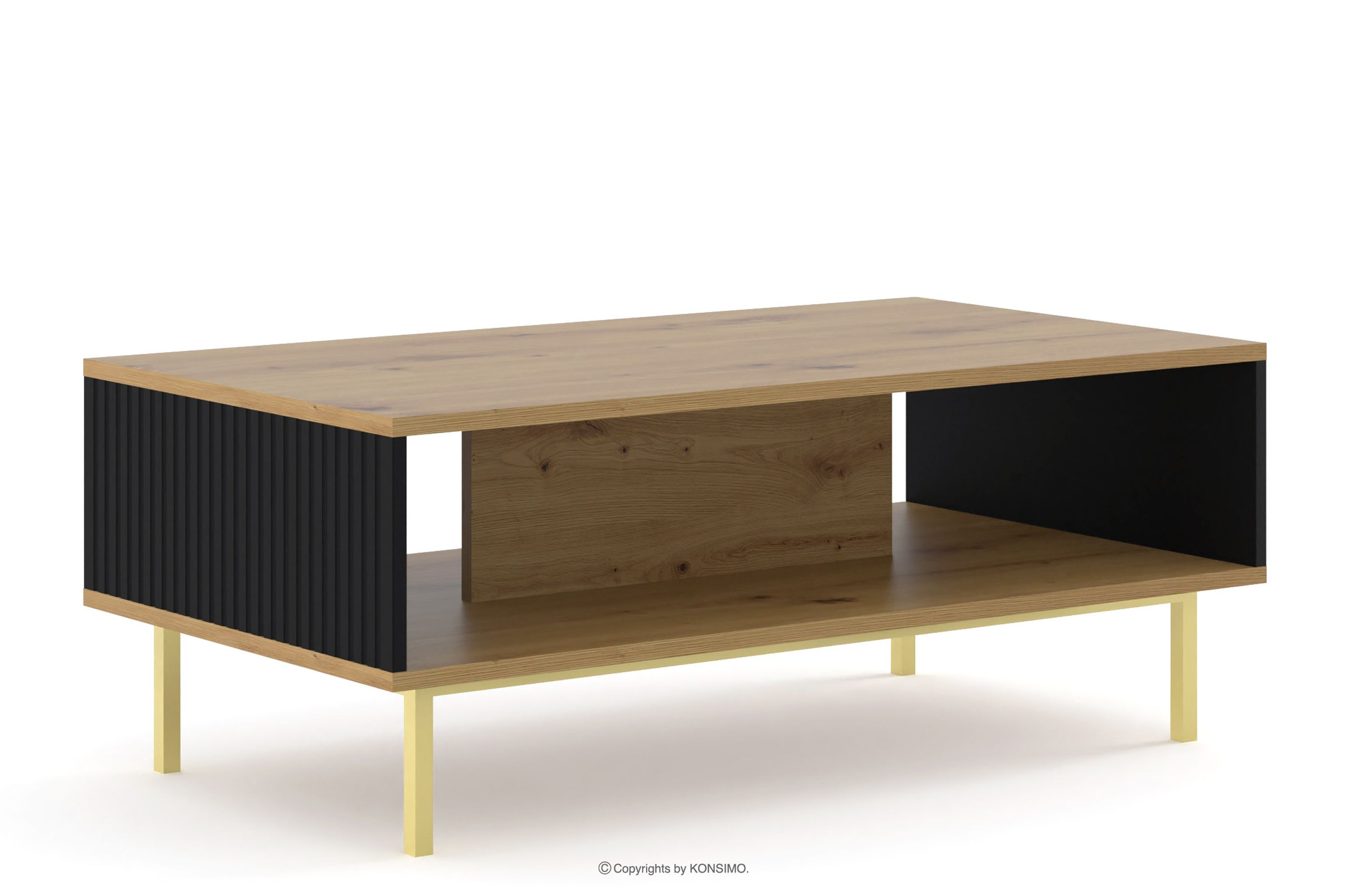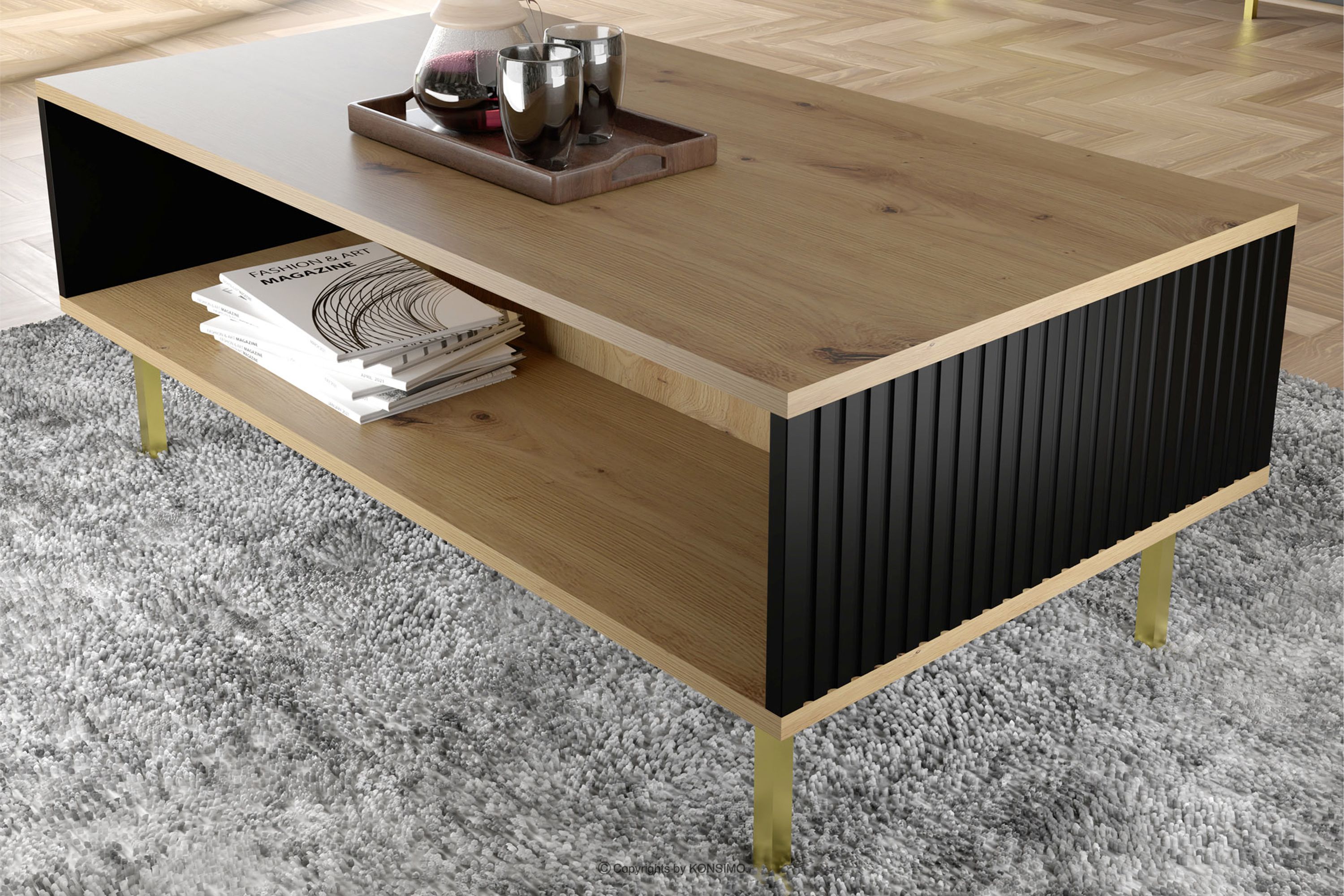 Der Esstisch auf goldenen Beinen mit Einlegeböden Eiche artisan/schwarz ist eine Kombination aus außergewöhnlichem Design, solider Verarbeitung und Funktionalität. Er wurde für Menschen geschaffen, die Wert auf Ästhetik und Komfort im täglichen Gebrauch legen. Schlichte, minimalistische Formen, die mit subtilen Details angereichert sind, entsprechen den neuesten Trends in der Inneneinrichtung und fügen sich harmonisch in eine Vielzahl von Arrangements ein.
