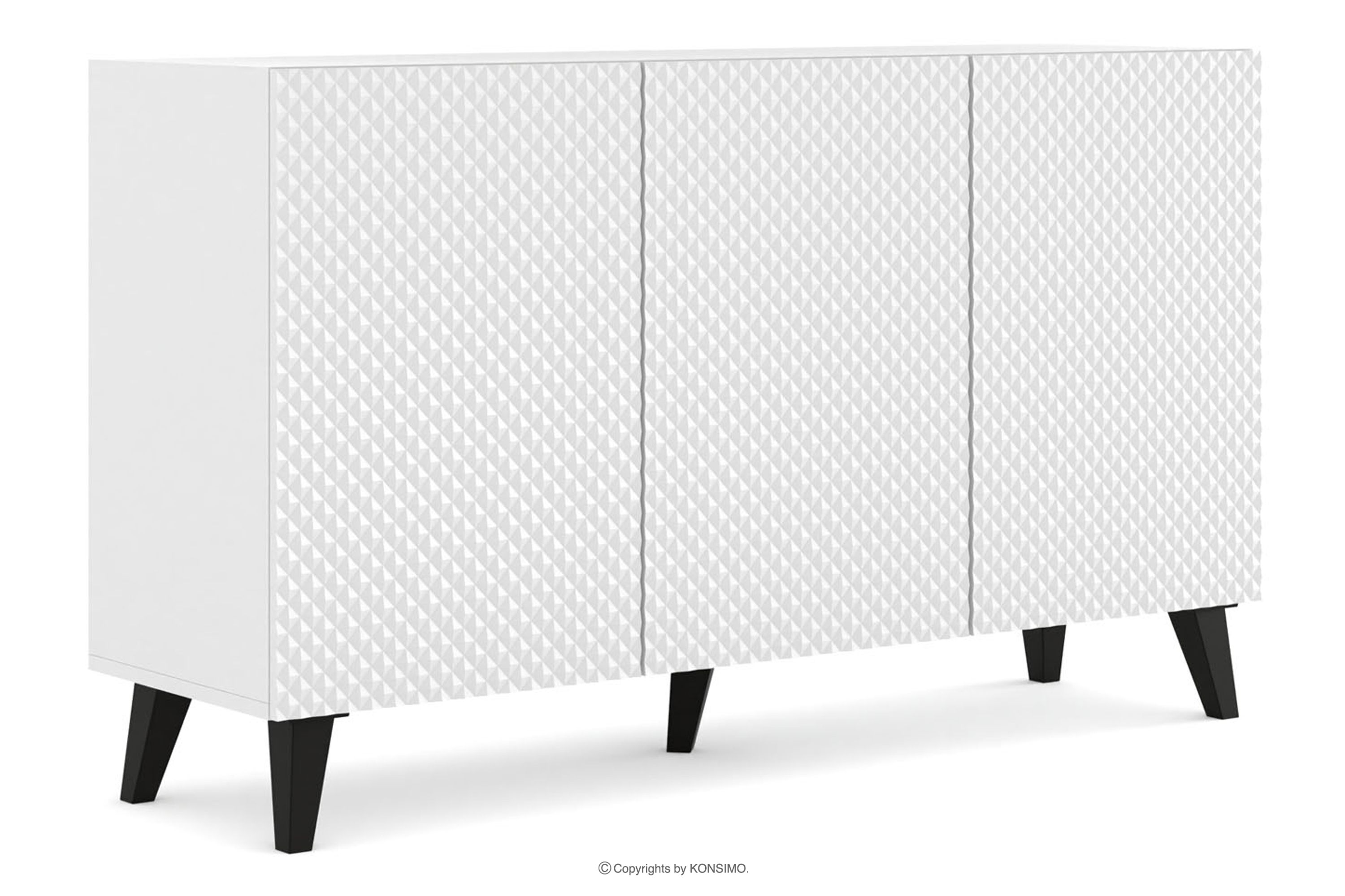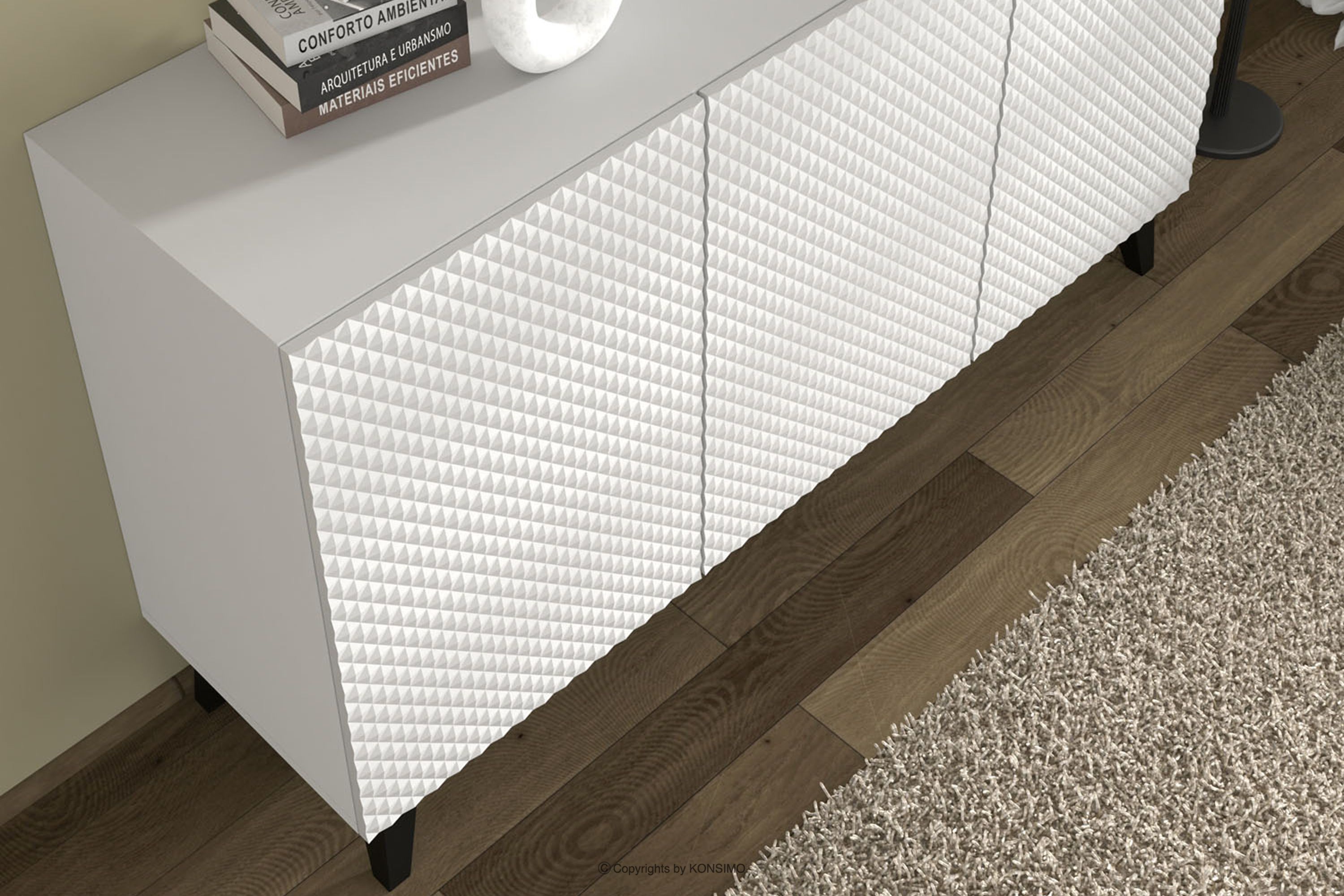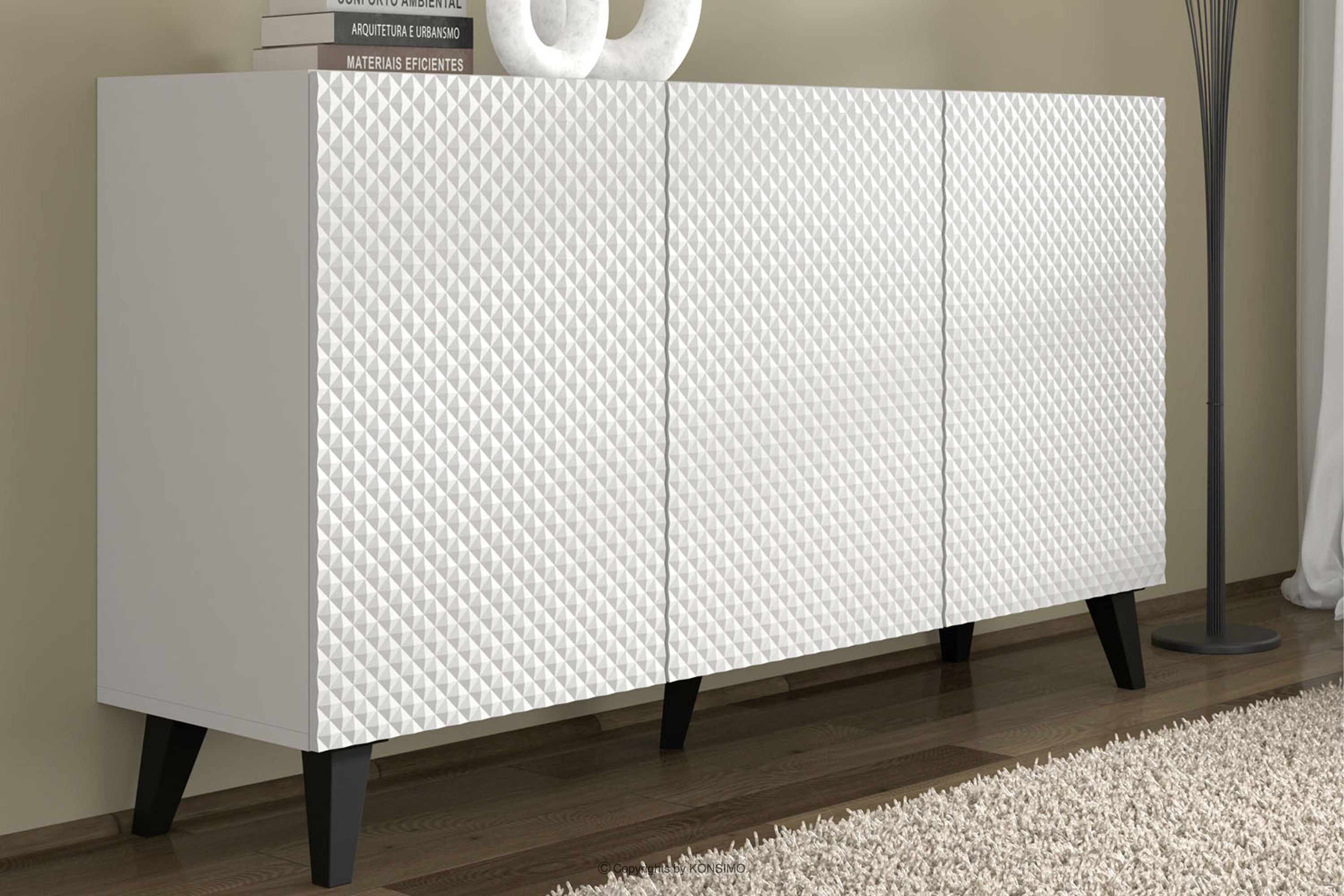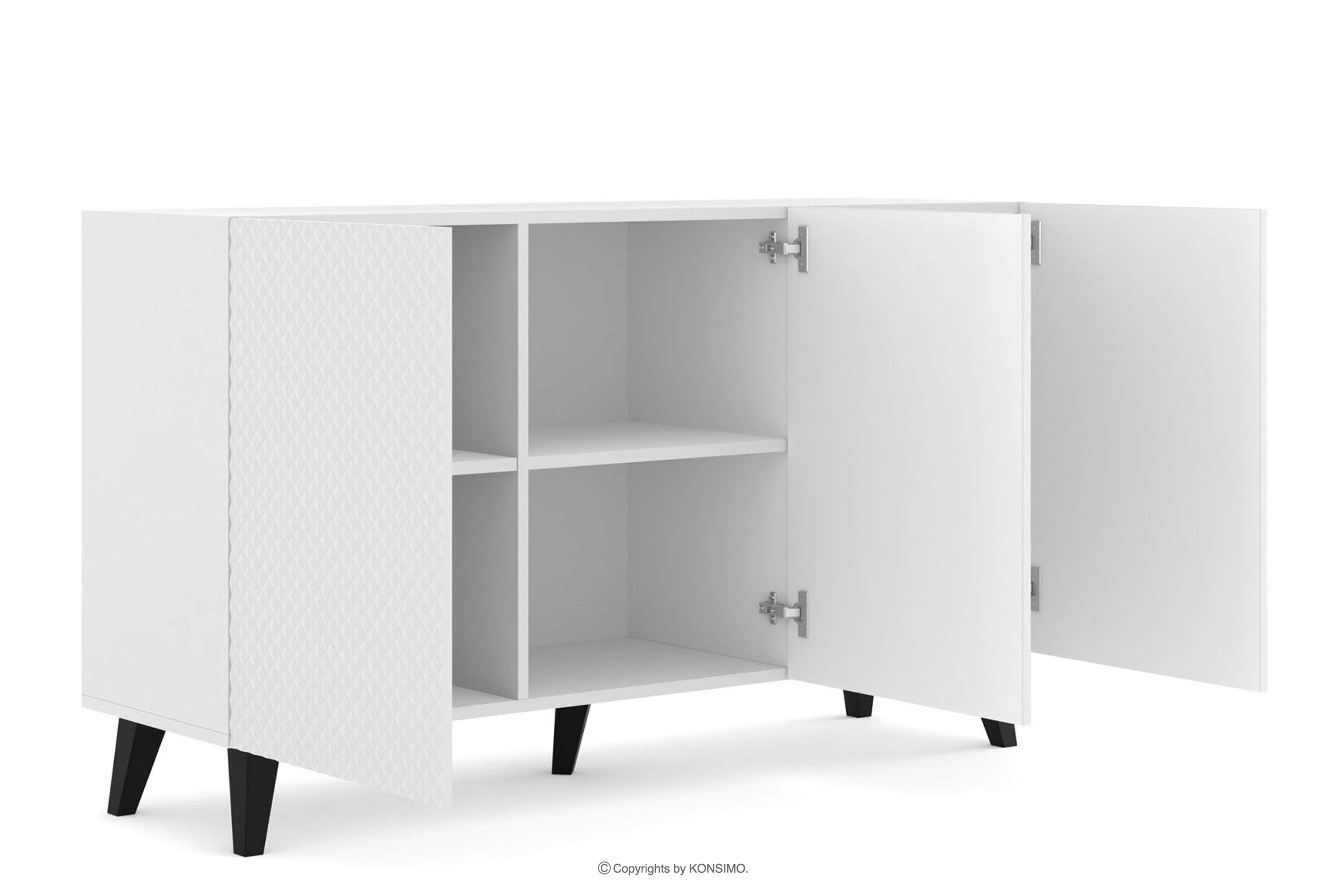 Die moderne weiße Kommode auf hohen Beinen ist eine Kombination aus außergewöhnlichem Design, solider Verarbeitung und Funktionalität. Sie wurde für Menschen geschaffen, die Wert auf Ästhetik und Komfort im täglichen Gebrauch legen. Die schlichten, minimalistischen Formen, die mit subtilen Details angereichert sind, entsprechen den neuesten Einrichtungstrends und fügen sich harmonisch in die verschiedensten Arrangements ein.