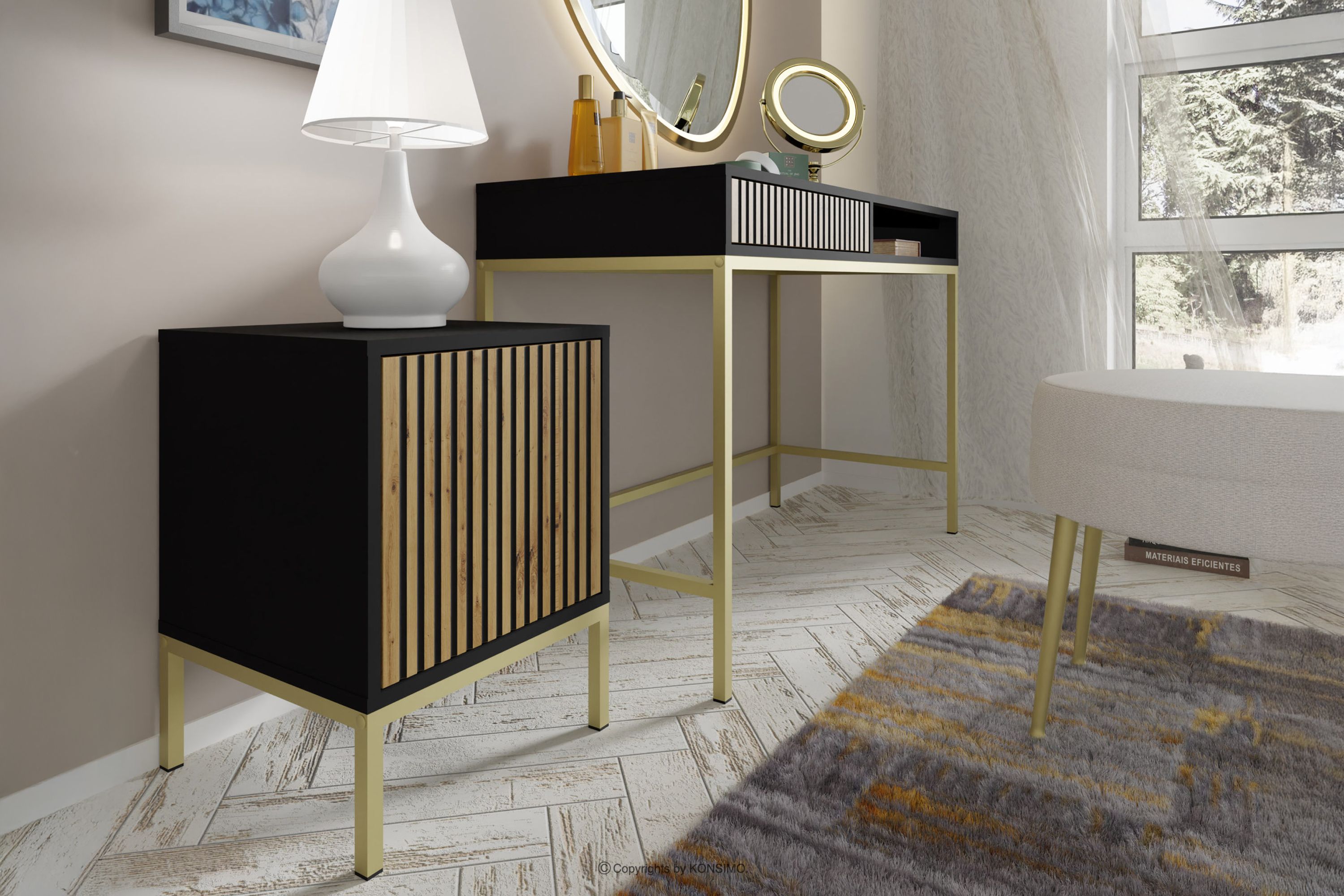 Der handwerklich gefertigte Nachttisch mit Lattenrost in Schwarz/Eiche ist eine Kombination aus außergewöhnlichem Design, solider Verarbeitung und Funktionalität. Er wurde für Menschen geschaffen, die Wert auf Ästhetik und Komfort im täglichen Gebrauch legen. Schlichte, minimalistische Formen, die mit subtilen Details angereichert sind, entsprechen den neuesten Trends in der Inneneinrichtung und fügen sich harmonisch in eine Vielzahl von Arrangements ein.