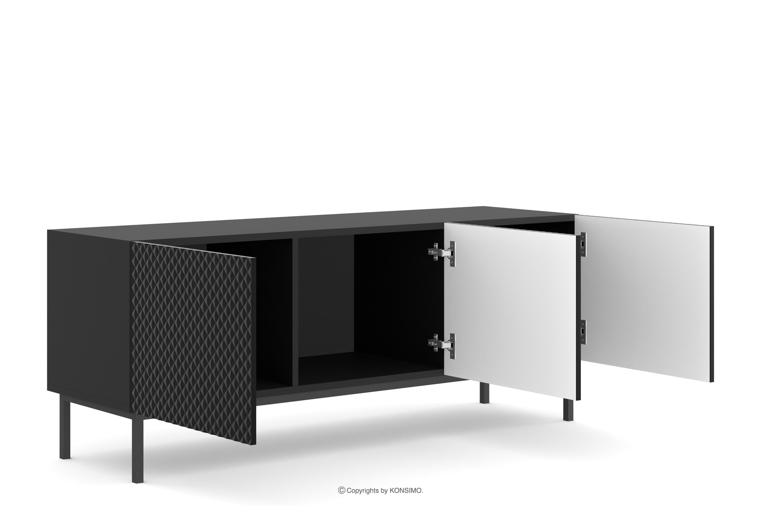 Der 150 cm lange RTV-Schrank auf schwarzen Beinen schwarz ist eine Kombination aus außergewöhnlichem Design, solider Verarbeitung und Funktionalität. Er wurde für Menschen geschaffen, die Wert auf Ästhetik und Komfort im täglichen Gebrauch legen. Schlichte, minimalistische Formen, die mit subtilen Details angereichert sind, passen zu den neuesten Trends in der Inneneinrichtung und fügen sich harmonisch in eine Vielzahl von Arrangements ein.