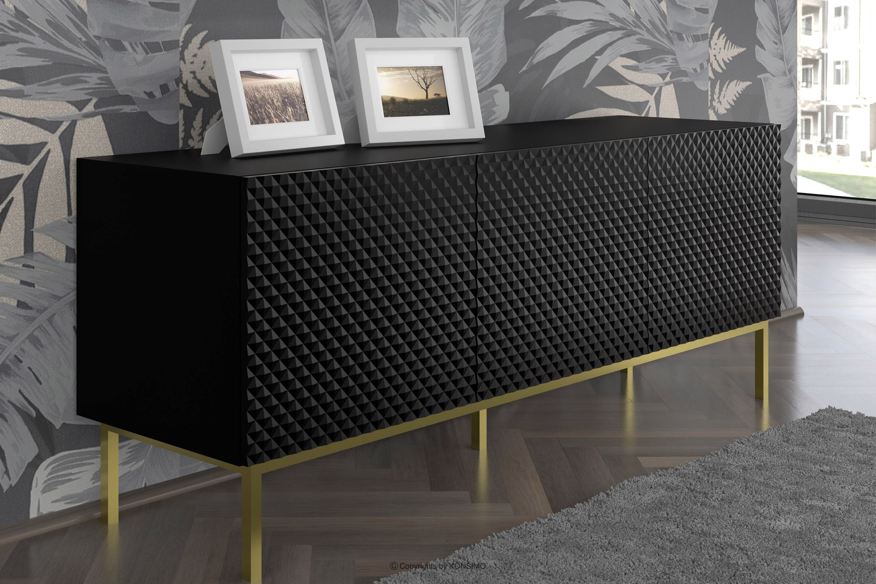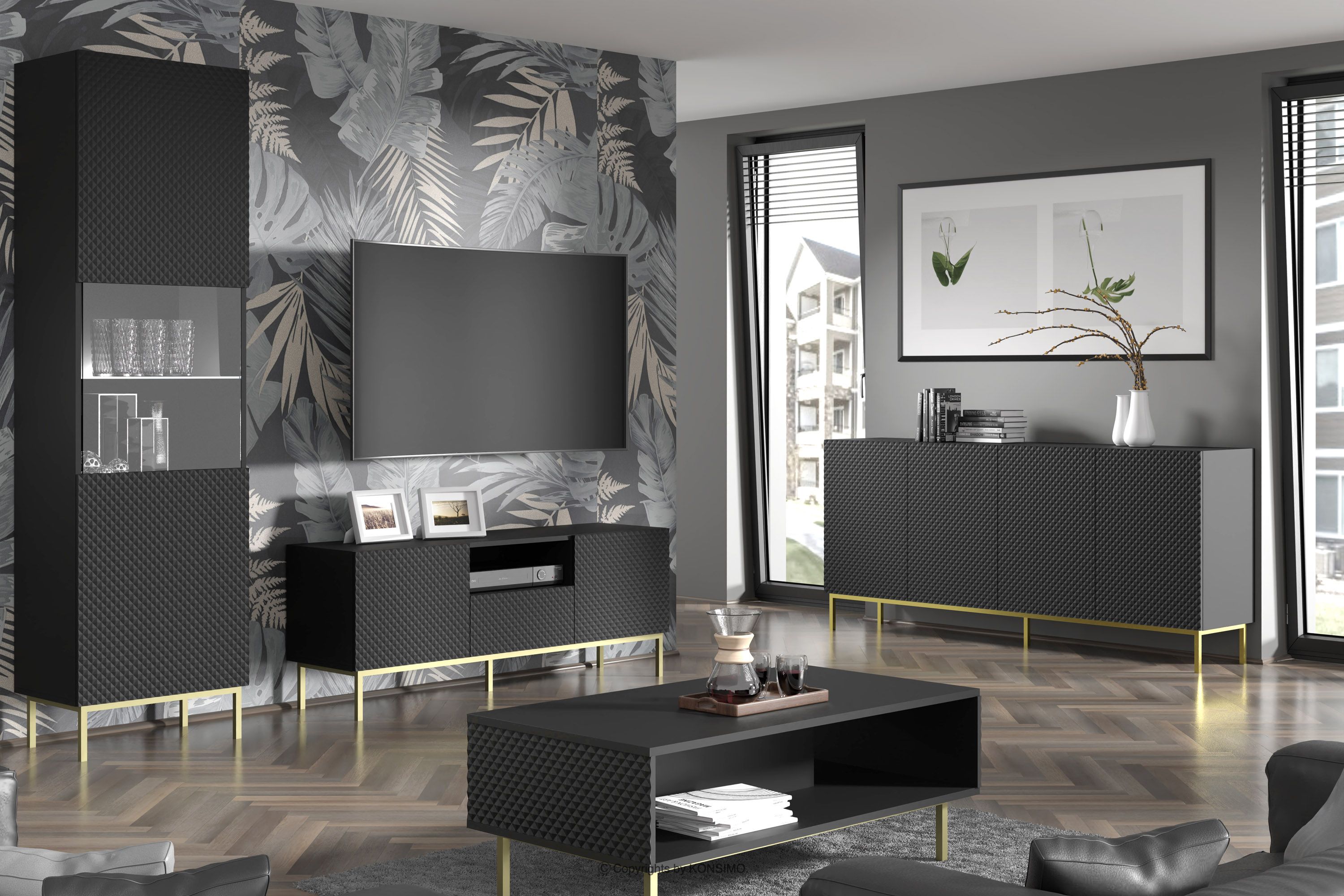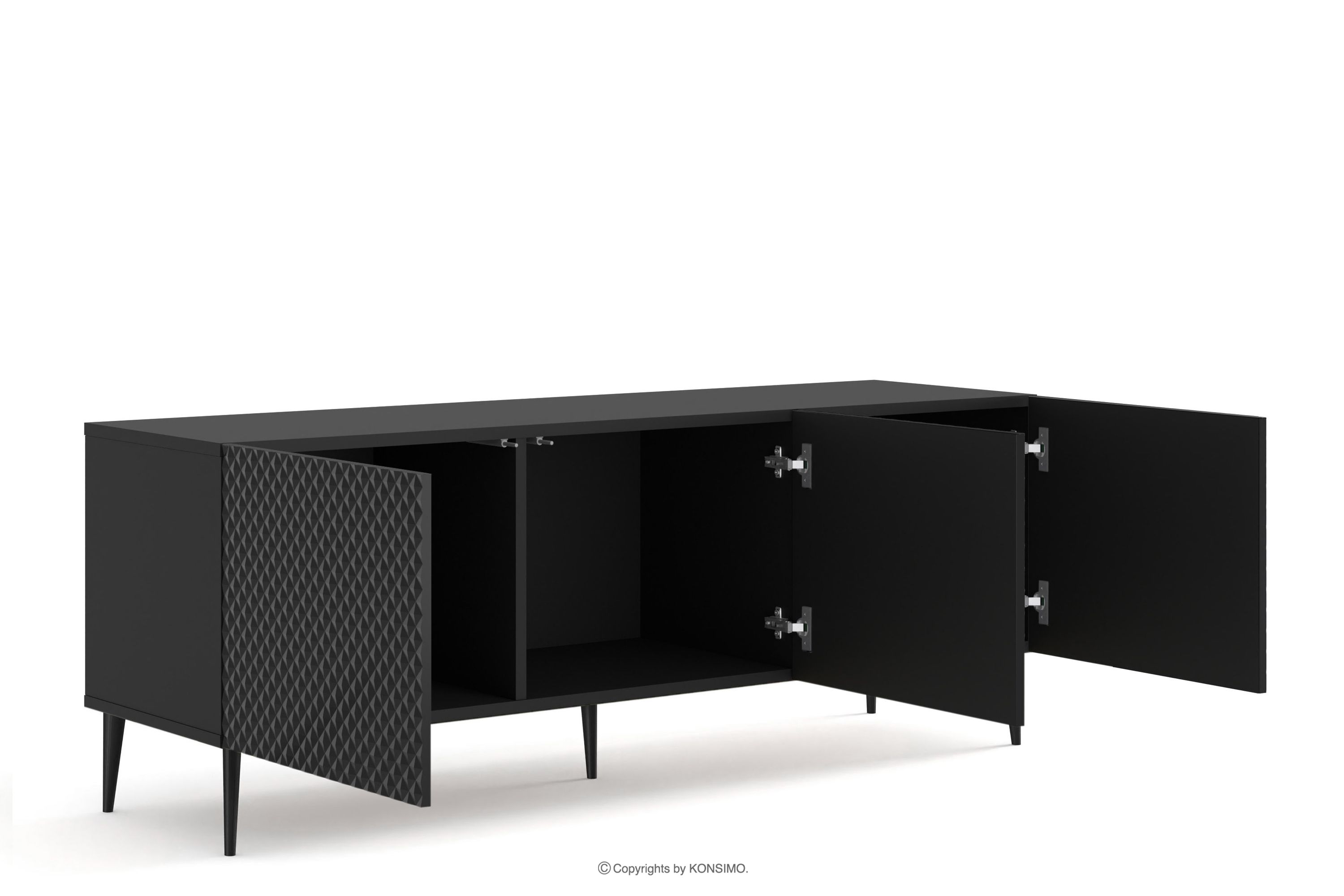 Der RTV-Schrank auf schwarzen Beinen schwarz ist eine Kombination aus außergewöhnlichem Design, solider Verarbeitung und Funktionalität. Er wurde für Menschen geschaffen, die Wert auf Ästhetik und Komfort im täglichen Gebrauch legen. Schlichte, minimalistische Formen, die mit subtilen Details angereichert sind, passen zu den neuesten Trends in der Inneneinrichtung und fügen sich harmonisch in eine Vielzahl von Arrangements ein.