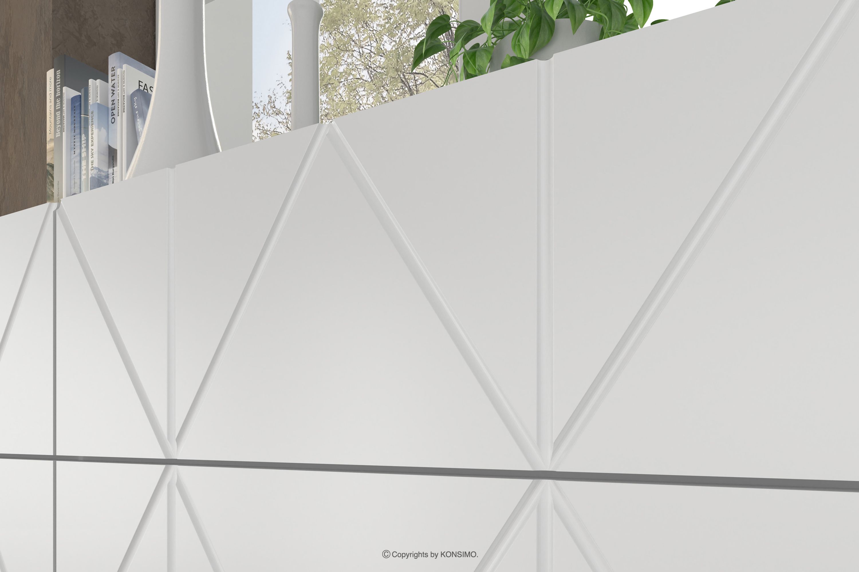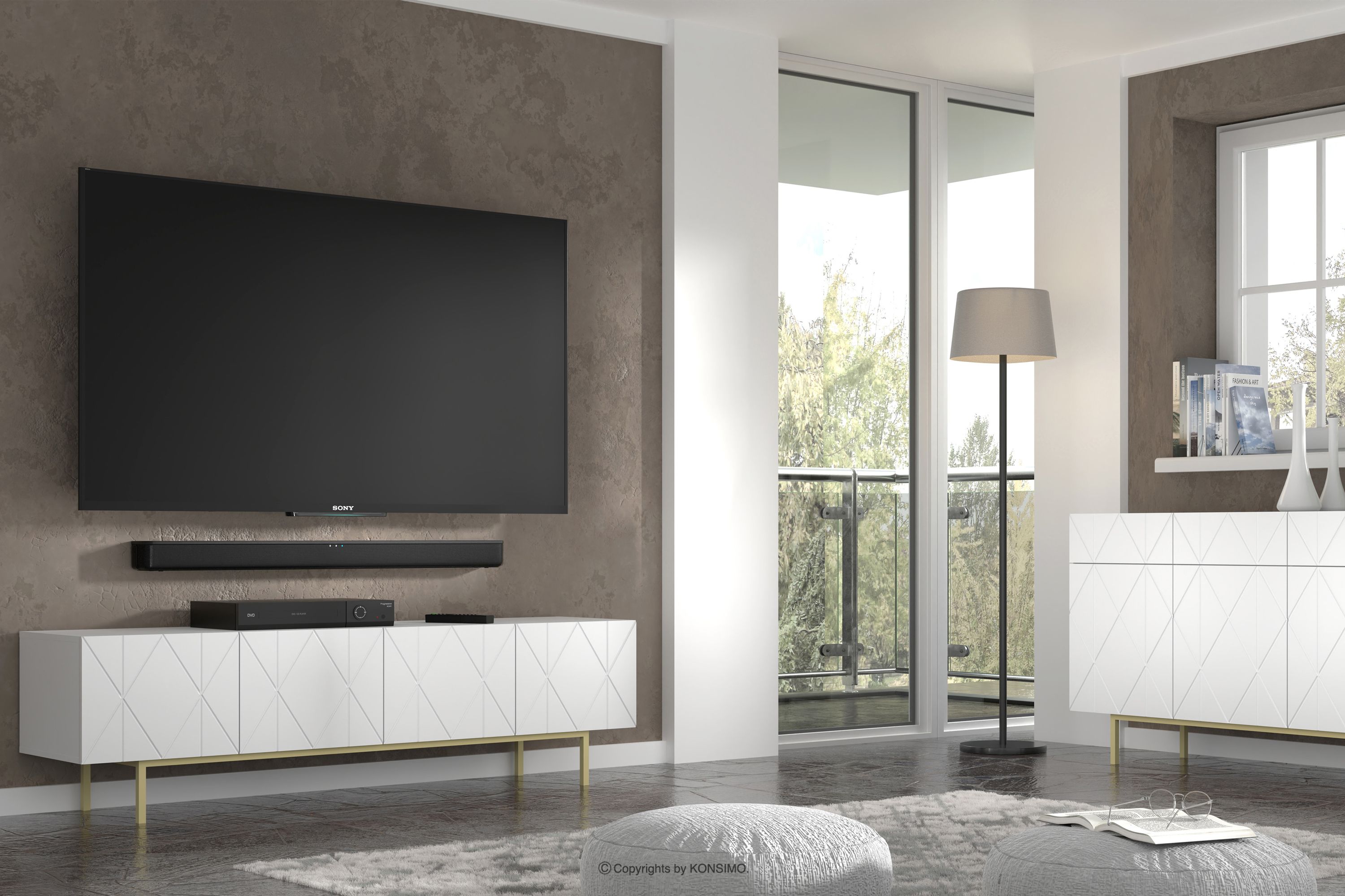 Der moderne RTV-Schrank auf goldenen Beinen weiß matt ist eine Kombination aus außergewöhnlichem Design, solider Verarbeitung und Funktionalität. Sie wurden für Menschen geschaffen, die Wert auf Ästhetik und Komfort im täglichen Gebrauch legen. Schlichte, minimalistische Formen, die mit subtilen Details angereichert sind, entsprechen den neuesten Trends in der Inneneinrichtung und fügen sich harmonisch in eine Vielzahl von Arrangements ein.
