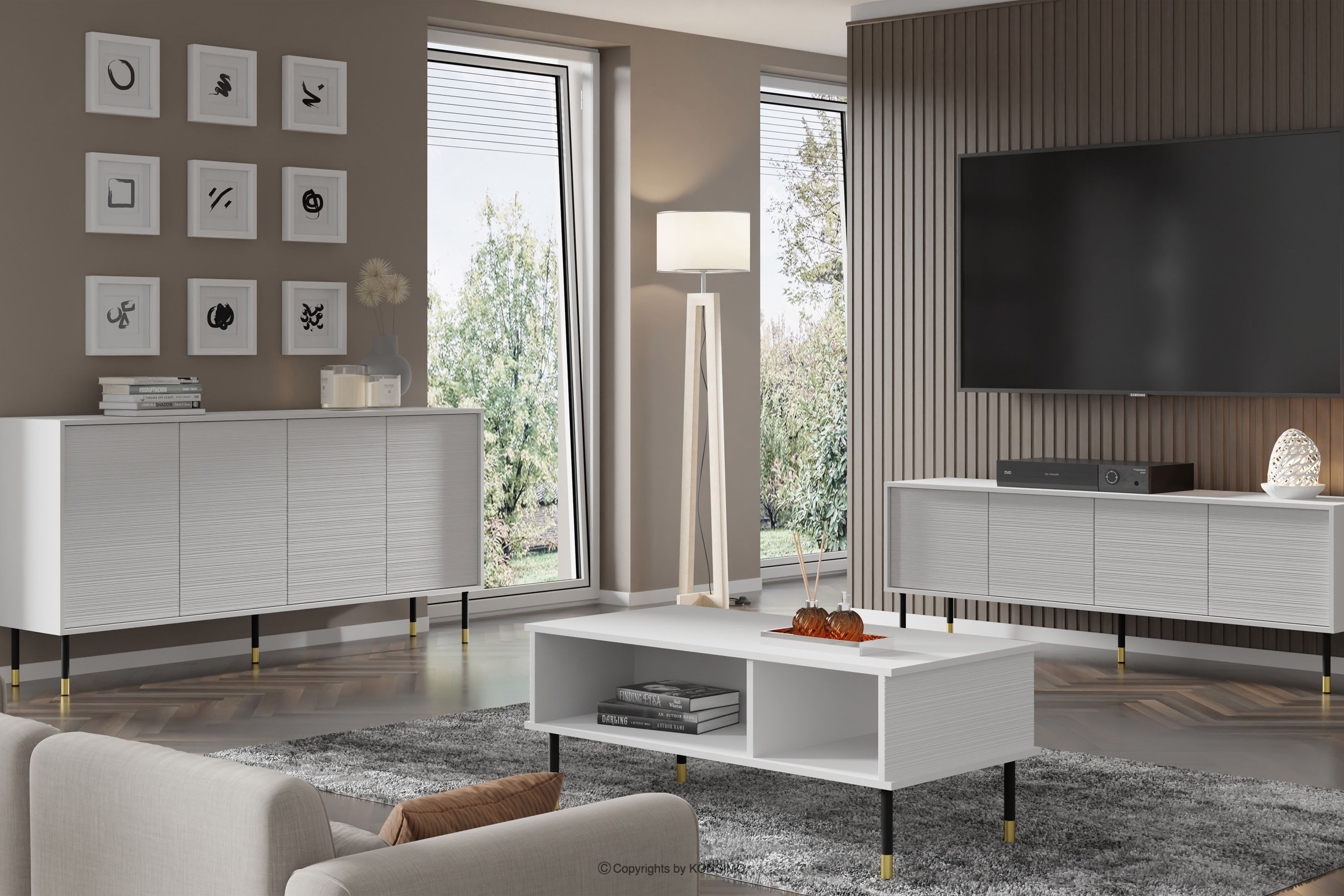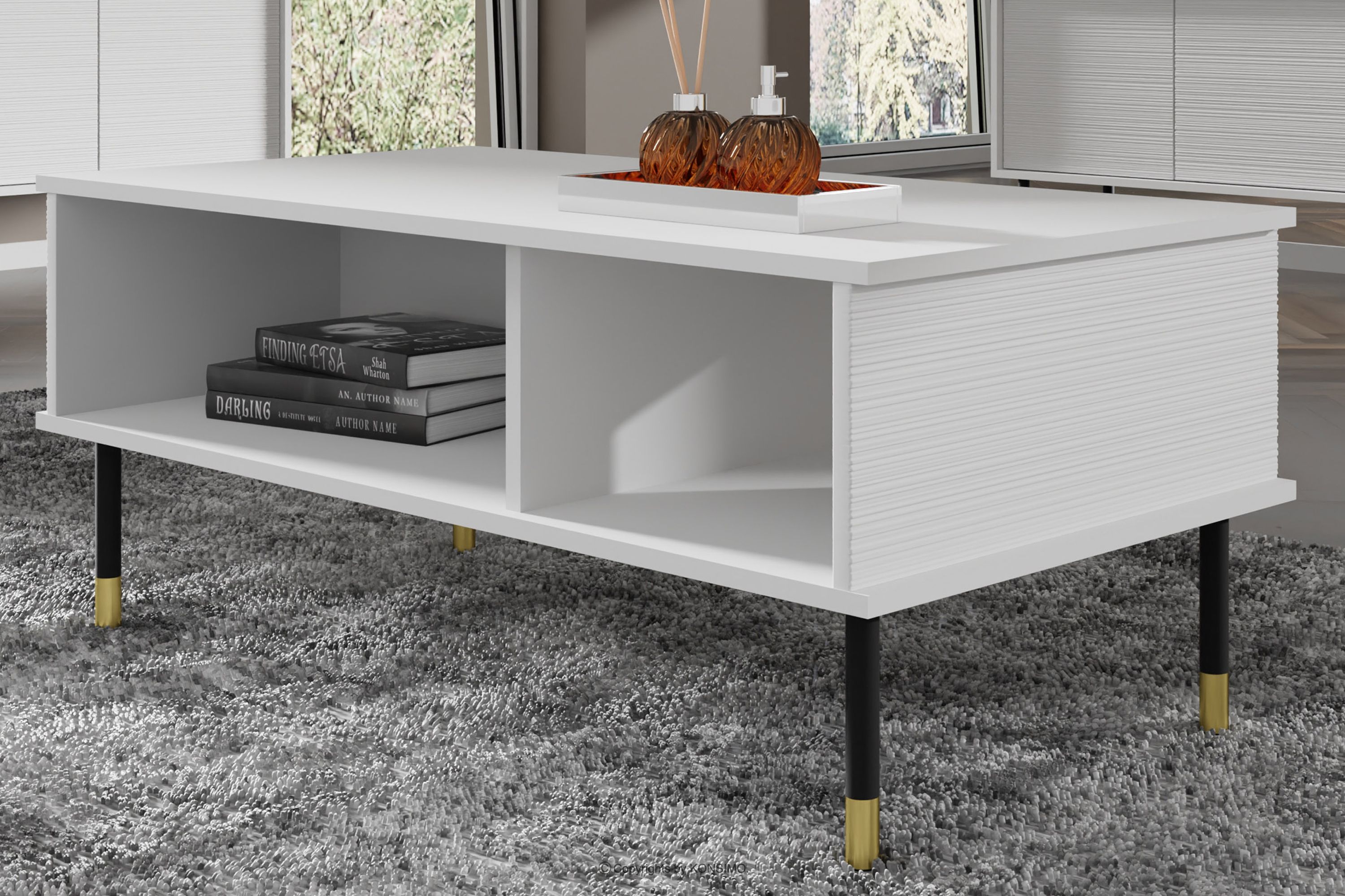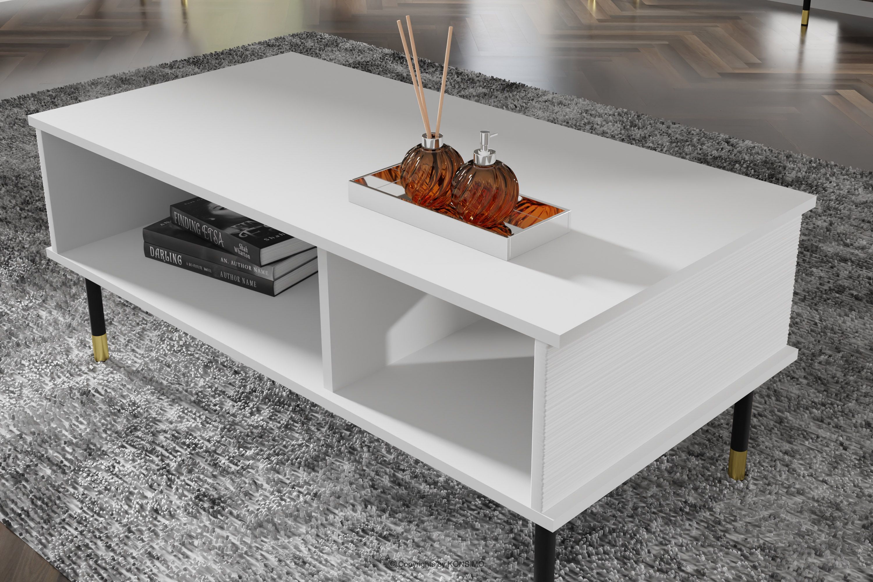 Der elegante weiße Couchtisch mit Einlegeböden ist eine Kombination aus außergewöhnlichem Design, solider Verarbeitung und Funktionalität. Er wurde für Menschen geschaffen, die Wert auf Ästhetik und Komfort im täglichen Gebrauch legen. Schlichte, minimalistische Formen, die mit subtilen Details angereichert sind, passen zu den neuesten Einrichtungstrends und fügen sich harmonisch in eine Vielzahl von Arrangements ein.
