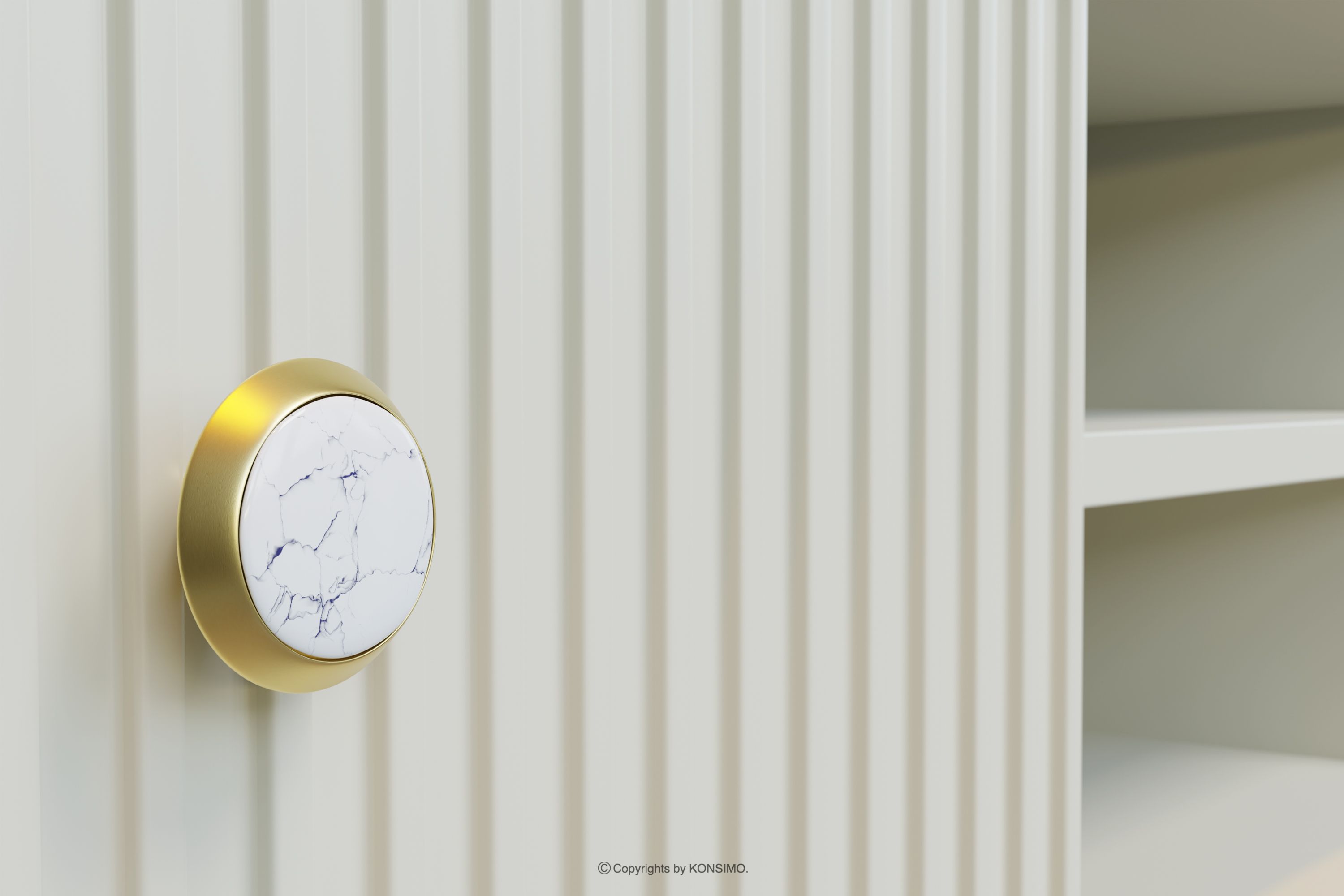 Der Glamour RTV-Schrank auf cremefarbenen Beinen ist eine Kombination aus außergewöhnlichem Design, solider Verarbeitung und Funktionalität. Er wurde für Menschen geschaffen, die Wert auf Ästhetik und Komfort im täglichen Gebrauch legen. Schlichte, minimalistische Formen, angereichert mit subtilen Details, entsprechen den neuesten Trends in der Inneneinrichtung und fügen sich harmonisch in eine Vielzahl von Arrangements ein.