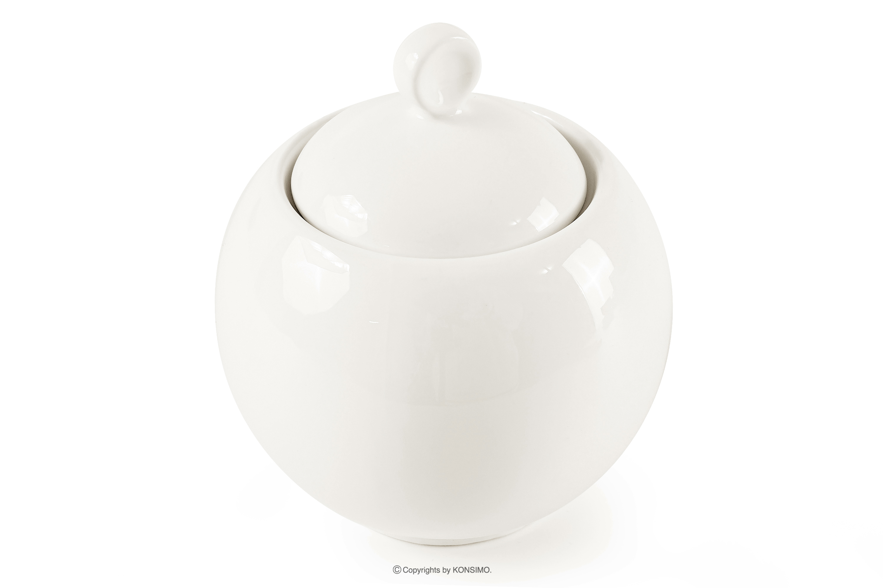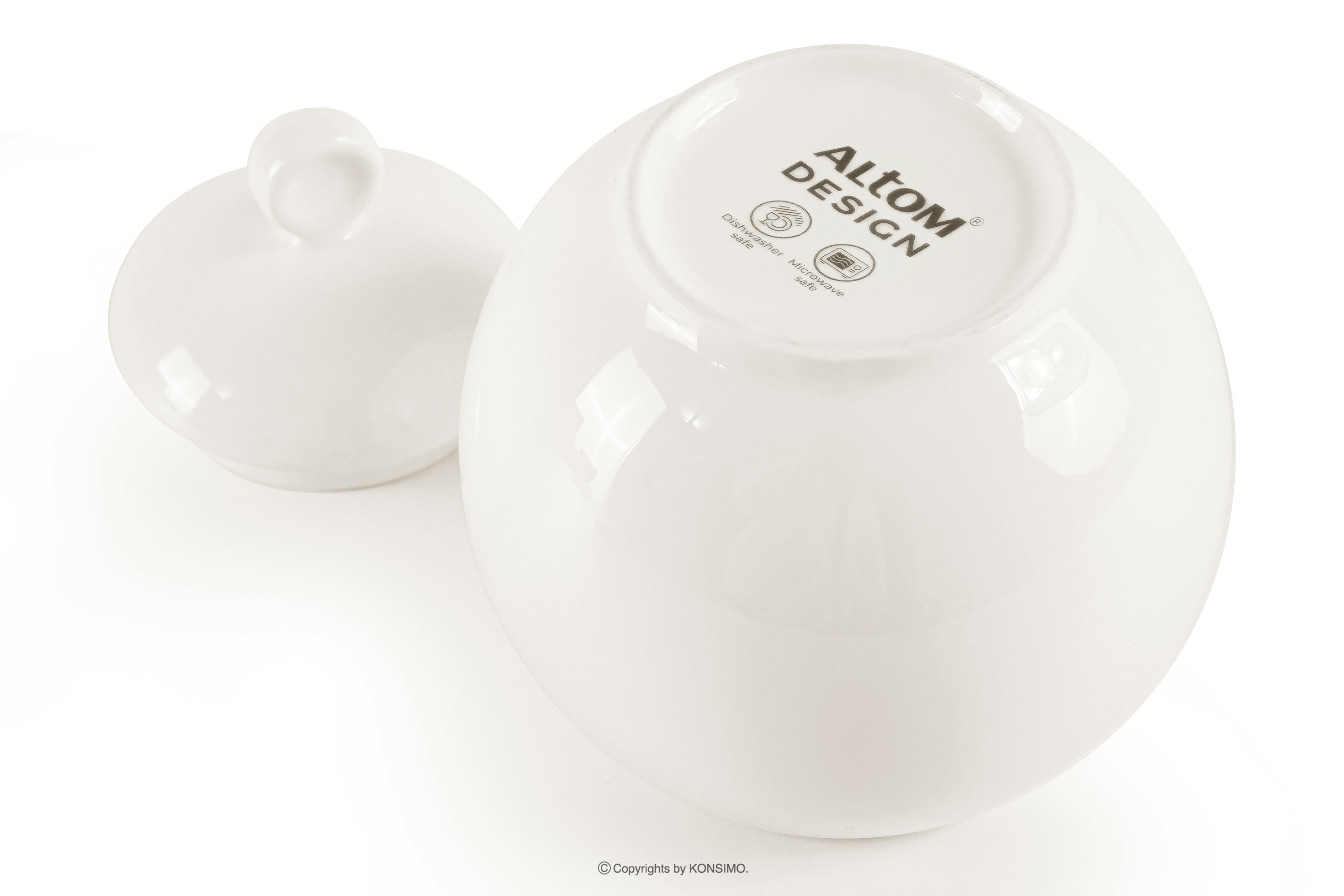 Zuckerdose aus ecrufarbenem Hartporzellan - Klassiker, Eleganz und außergewöhnliche Haltbarkeit. Unsere Kollektion ist eine Kombination aus klassischer Eleganz, zuverlässiger Langlebigkeit und hervorragender Verarbeitung. Sie ist die ideale Wahl für Menschen, die die Schönheit des gedeckten Esstischs und die Funktionalität im täglichen Gebrauch schätzen. Die warme, leicht cremefarbene Farbe des Geschirrs passt perfekt zu einer Vielzahl von Esstischen und passt sowohl zu klassischen als auch zu modernen Interieurs.