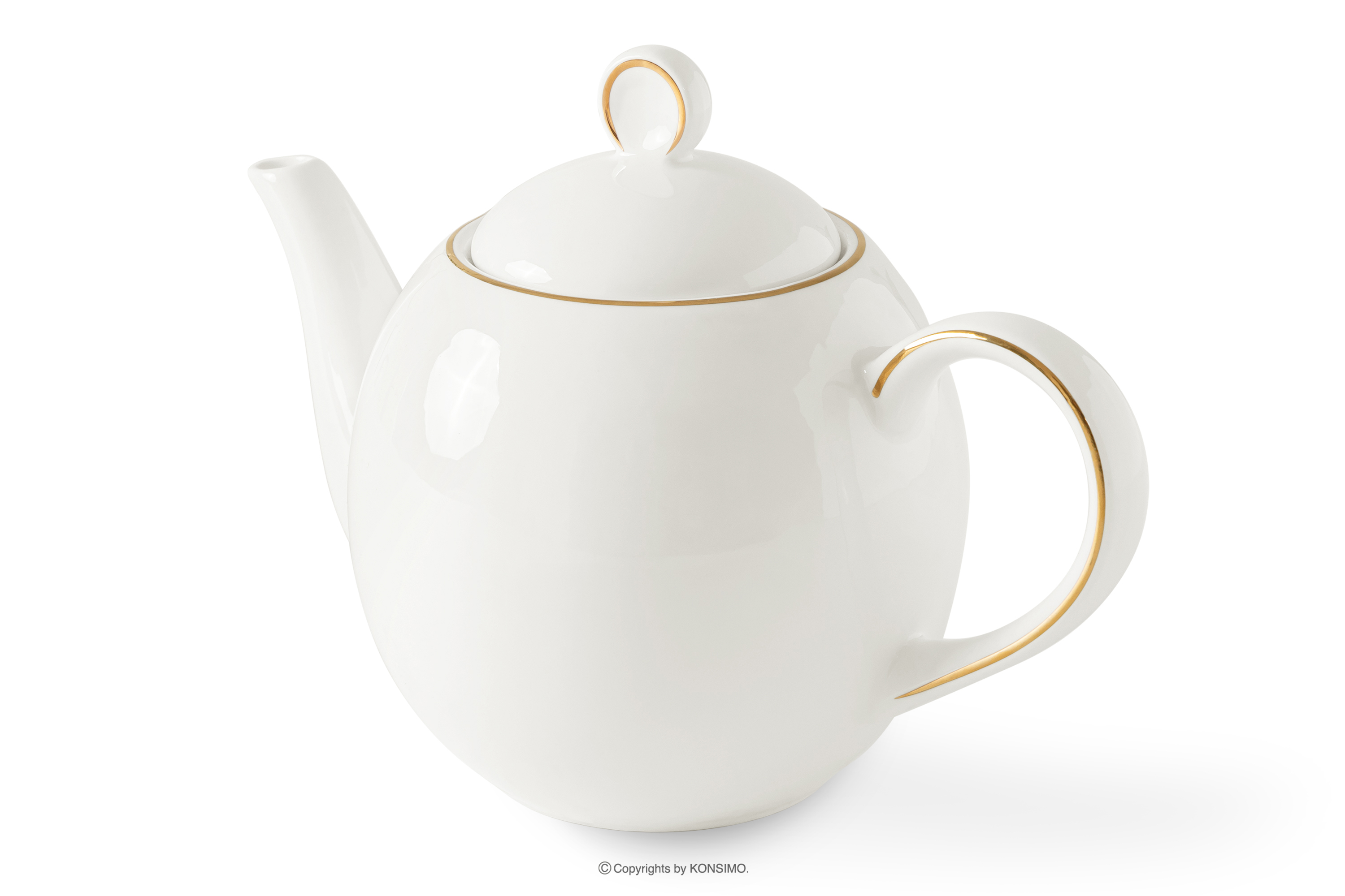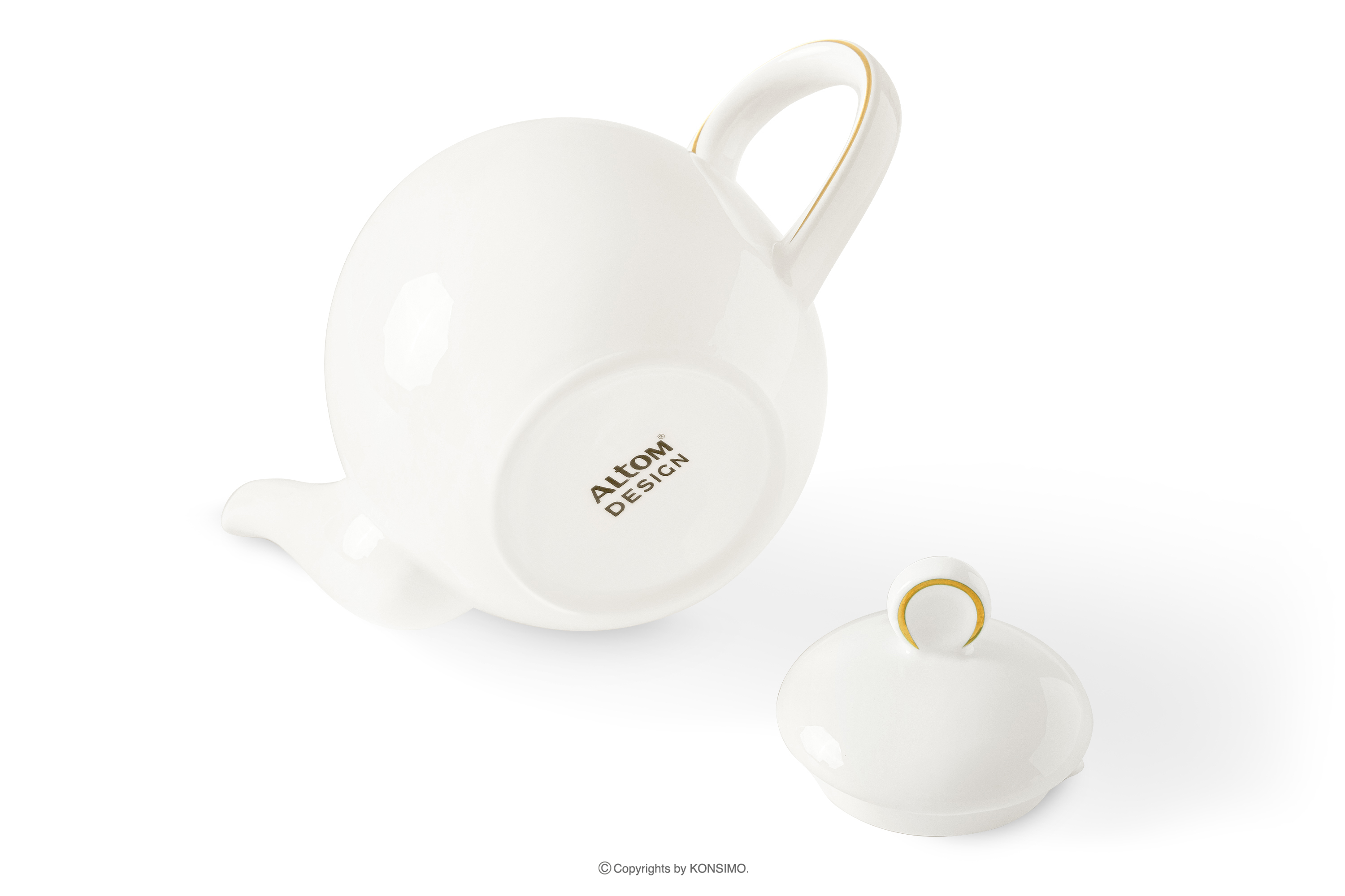 Teekanne Hartporzellan Ecru/Gold - klassisch, elegant und außergewöhnlich langlebig. Unsere Kollektion vereint klassische Eleganz, zuverlässige Langlebigkeit und höchste Verarbeitungsqualität. Sie ist die perfekte Wahl für Menschen, die Wert auf die Schönheit des Esstischs und die Funktionalität im täglichen Gebrauch legen. Die warme, leicht cremige Farbe des Geschirrs passt perfekt zu verschiedenen Esstisch-Arrangements und passt sowohl zu klassischen als auch zu modernen Inneneinrichtungen.
