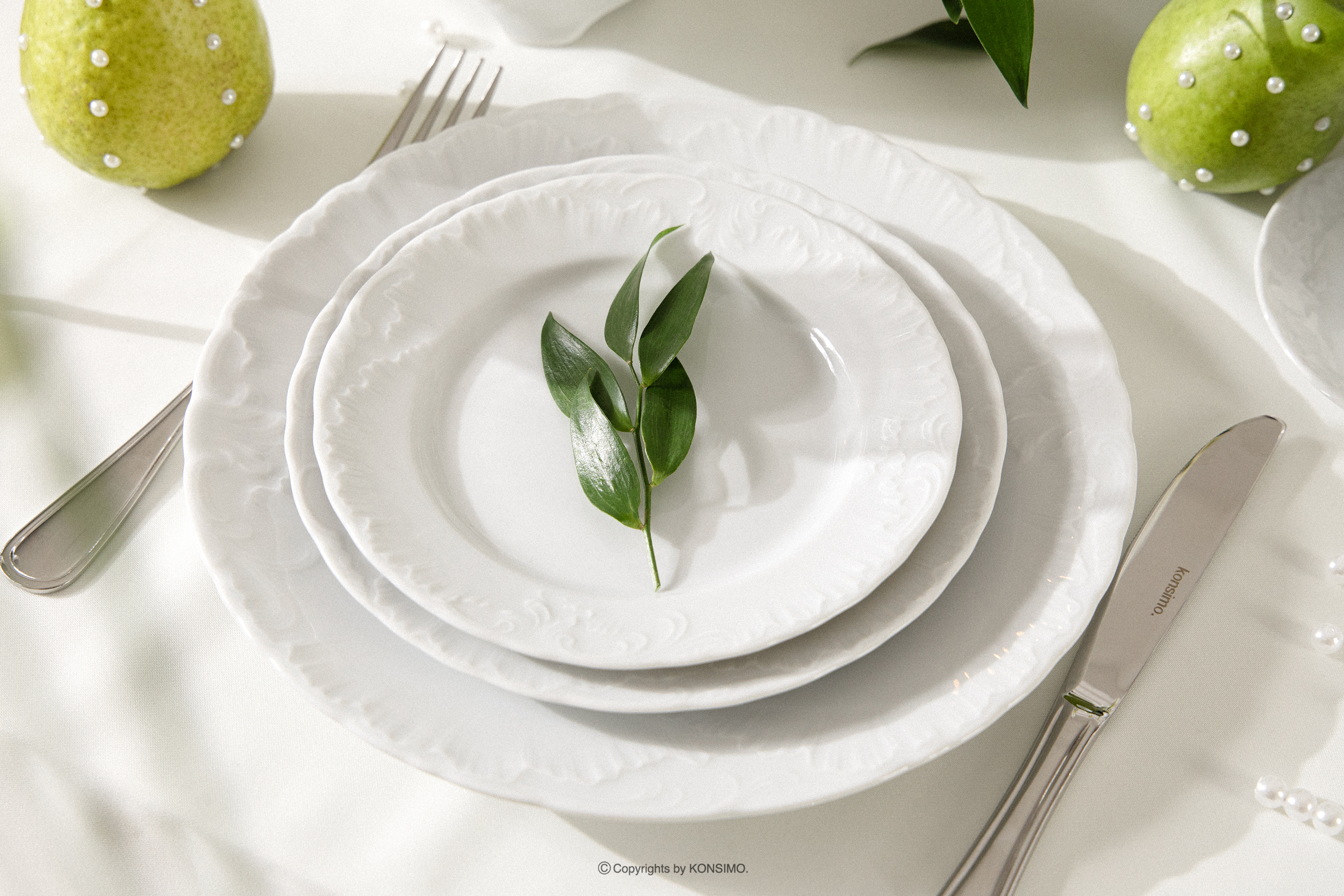 Dessertteller 6 tlg. aus Porzellan weiß ist die Quintessenz zeitloser Eleganz, die klassische Schönheit mit Funktionalität verbindet. Hergestellt aus hochwertigem Porzellan, entworfen für alle, die Ästhetik, Bedienkomfort und raffinierte Details schätzen. Die perfekte Kollektion für jedes Fest - ob es sich um einen besonderen, feierlichen Anlass handelt oder um eine alltägliche Mahlzeit, die einen Hauch von Luxus verdient.