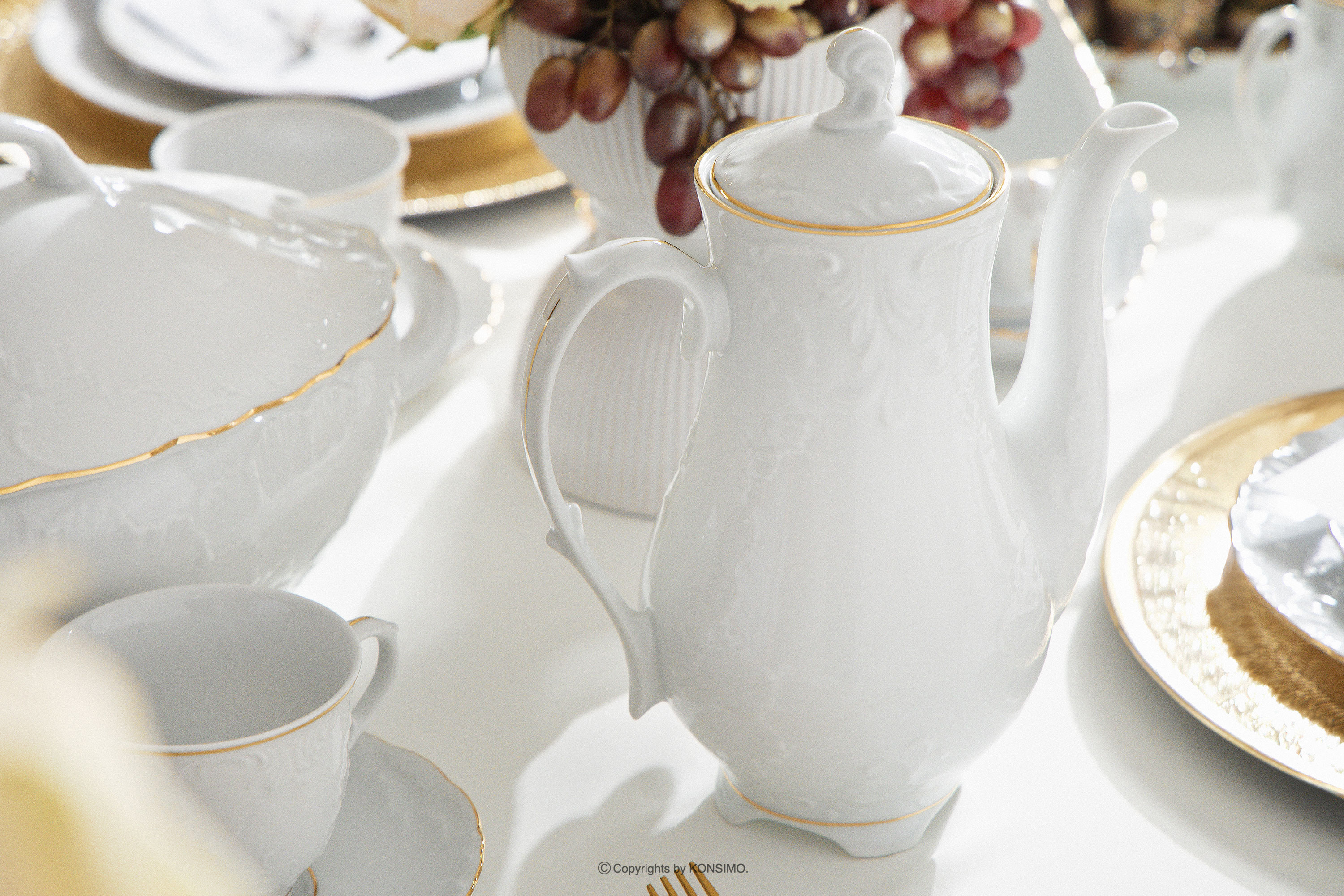 Das Porzellan-Kaffeeservice Goldlinie 6 Personen (21 Teile) ist die Quintessenz zeitloser Eleganz, die klassische Schönheit mit Funktionalität verbindet. Es ist aus hochwertigem Porzellan gefertigt und wurde für diejenigen entworfen, die Ästhetik, Bedienungskomfort und raffinierte Details zu schätzen wissen. Die perfekte Kollektion für jedes Fest - ob es sich um einen besonderen, feierlichen Anlass handelt oder um eine alltägliche Mahlzeit, die einen Hauch von Luxus verdient.
