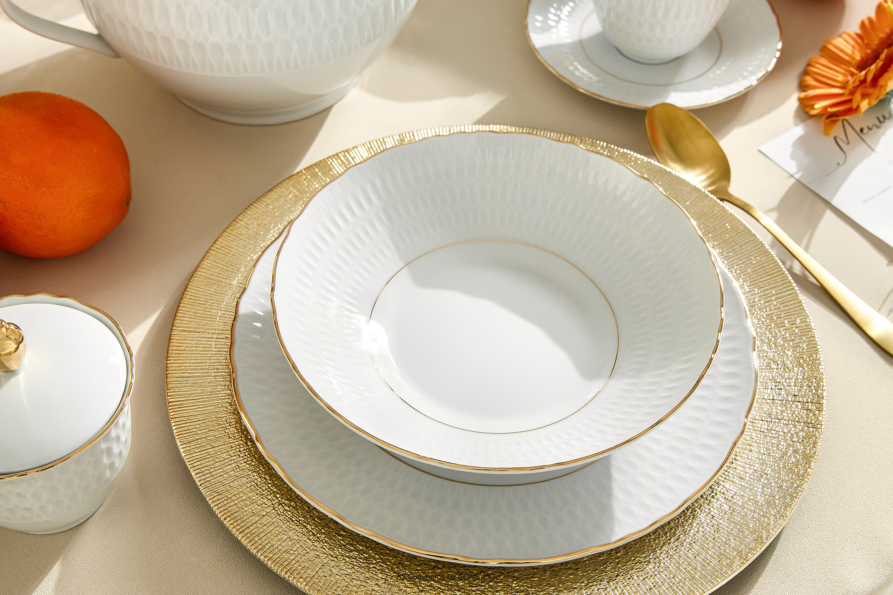 Elegantes Porzellan-Tafel- und Kaffeeservice golden line 6-Personen-Set (30 tlg) - hervorragende Verarbeitung für höchste Ansprüche. Die Kollektion bringt einen subtilen Hauch von zeitloser Eleganz in Ihr Esszimmer und verbindet raffinierten Stil, Langlebigkeit und Funktionalität. Sie ist die ideale Wahl für alle, die sowohl im Alltag als auch bei besonderen Anlässen Wert auf Ästhetik und Qualität legen.