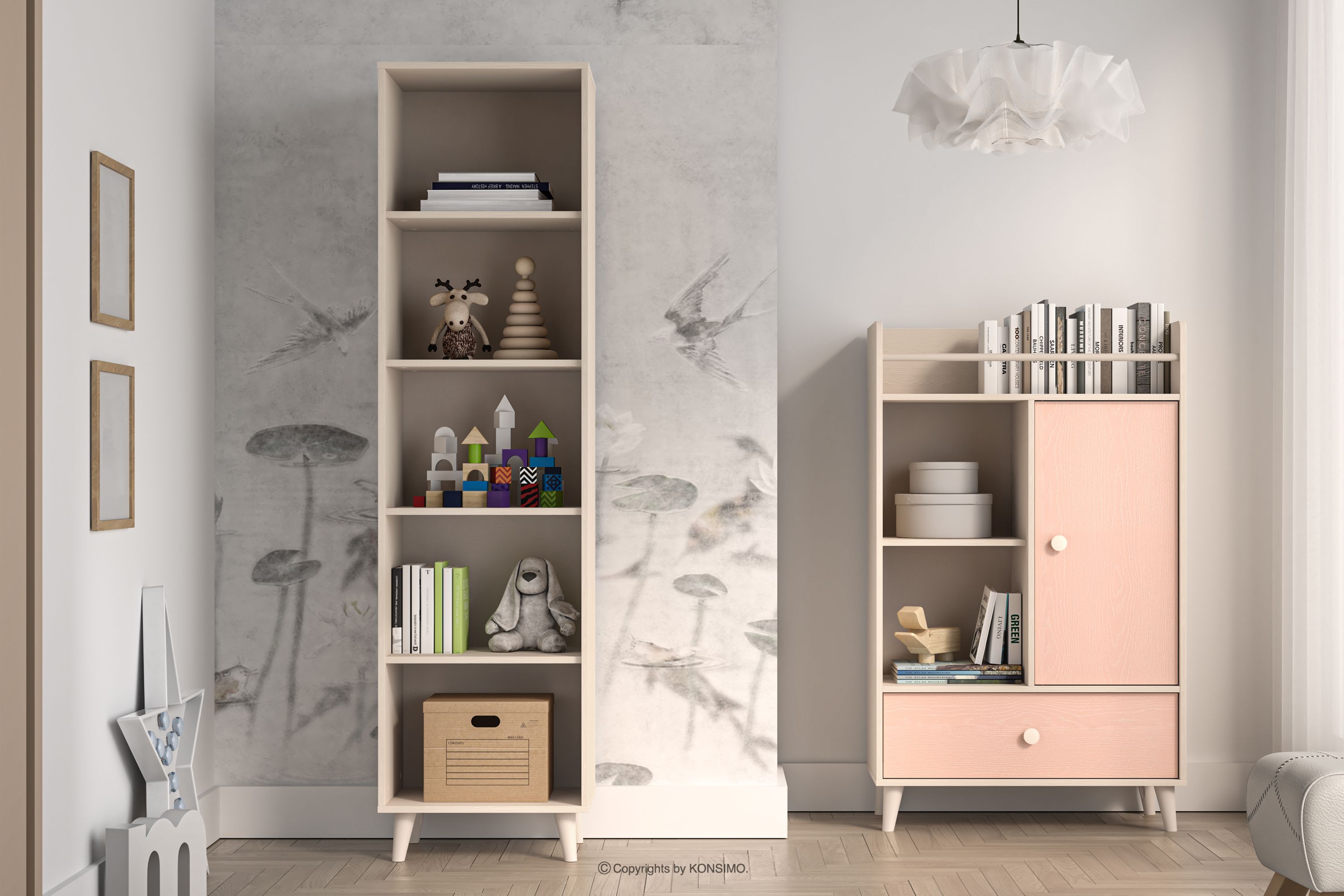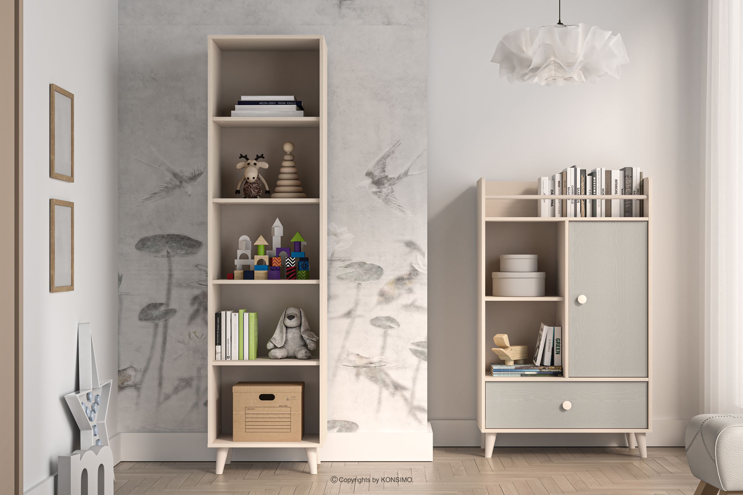 Das beigefarbene Kinderbuchregal verbindet modernes Design mit höchster Verarbeitungsqualität und gewährleistet Komfort und Sicherheit bei der Benutzung. Dank der soliden Materialien und der raffinierten Details sind die Möbel langlebig, funktionell und perfekt auf die Bedürfnisse der jüngsten Nutzer abgestimmt. Die zarten Pastellfarben verleihen der Einrichtung einen freundlichen, harmonischen Charakter, der sowohl zum Spielen als auch zum Ausruhen einlädt.