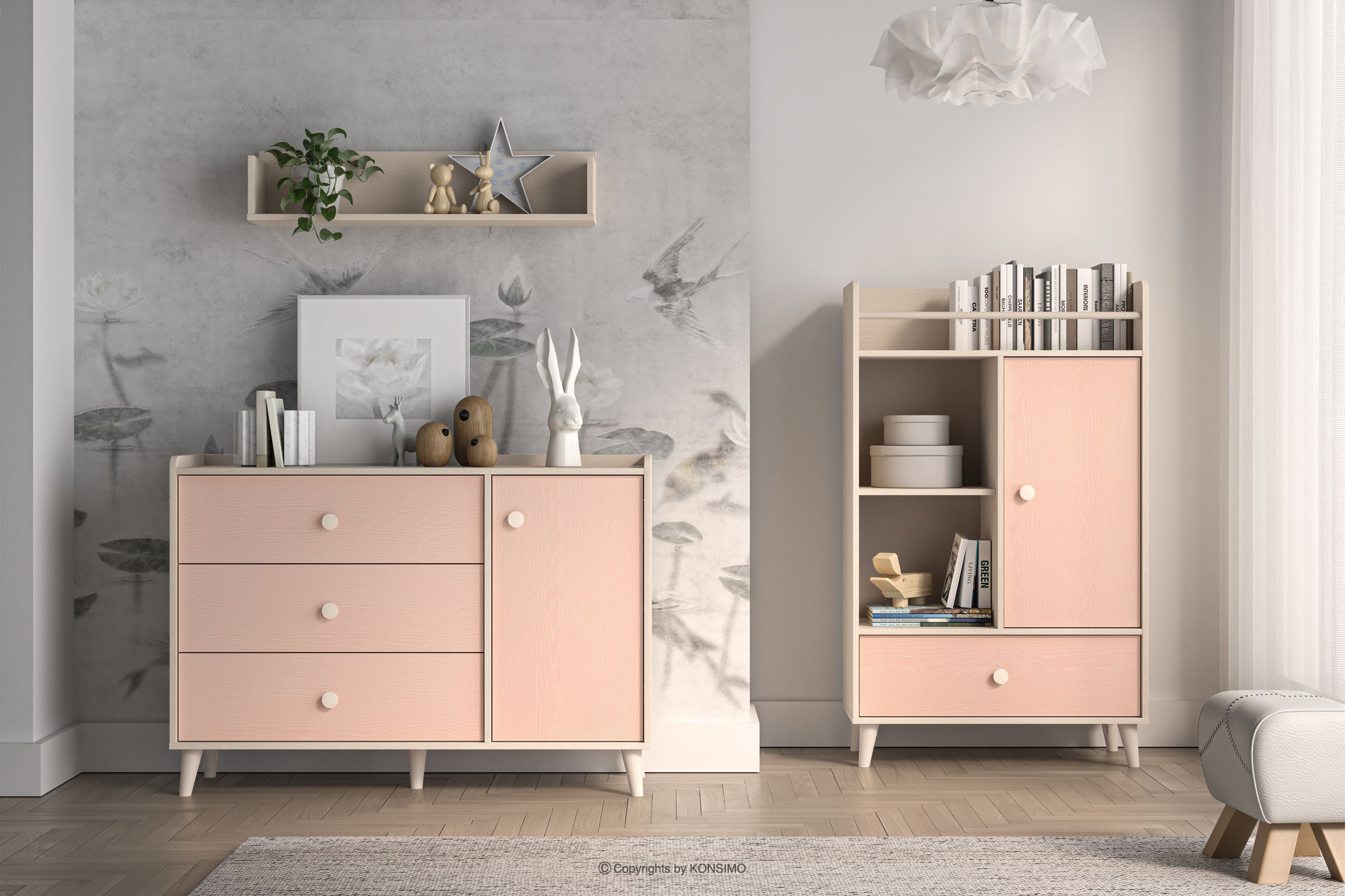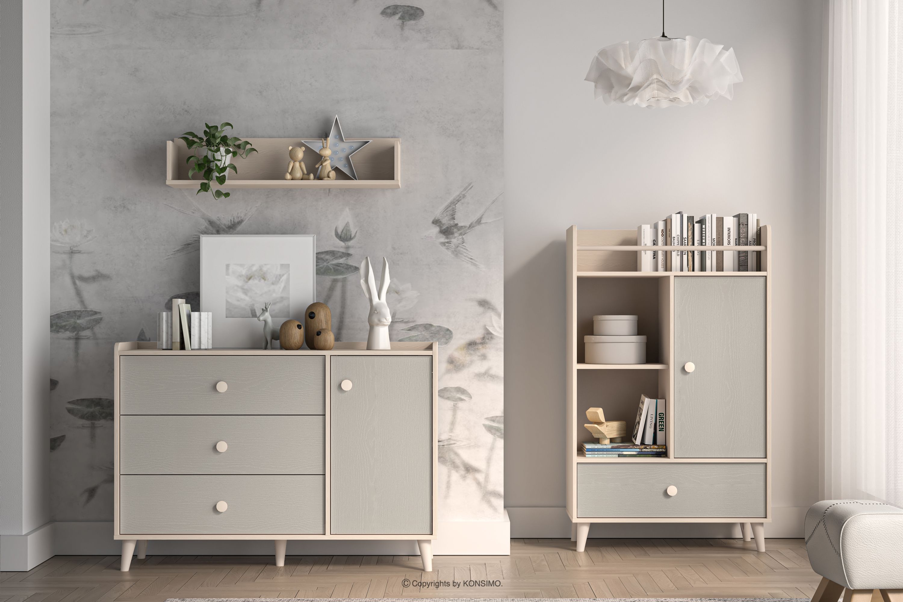 Das beigefarbene Einlegeböden für das Kinderzimmer verbindet modernes Design mit höchster Verarbeitungsqualität und garantiert Komfort und Sicherheit bei der Benutzung. Dank der soliden Materialien und der raffinierten Details sind die Möbel langlebig, funktionell und perfekt auf die Bedürfnisse der jüngsten Nutzer abgestimmt. Die zarten Pastellfarben verleihen der Einrichtung einen freundlichen, harmonischen Charakter, der sowohl zum Spielen als auch zum Ausruhen einlädt.